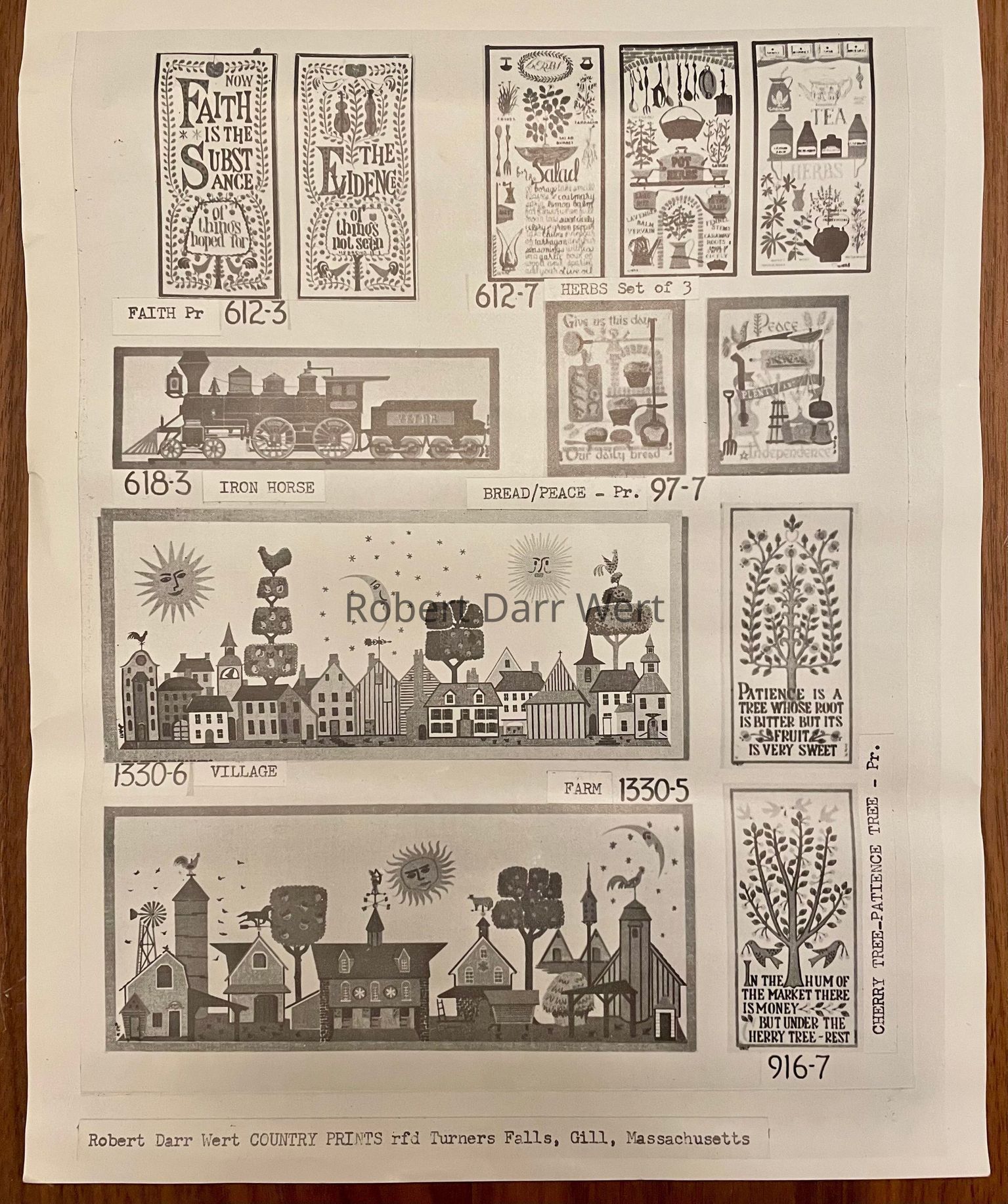 These prints appear singly in the c.1955 brochure “Country Prints in Frames” and the Spring 1958 Country Prints price list at a smaller size (7”x14”) as Cherry Tree 714-1 and Patience Tree 714-2. They are listed in the January 1960 Country Prints price list in a choice of antique birch or flat black frames, and appear as a pair in the c.1960 brochure, “Country Prints in Frames Designed by Robert Darr Wert”, as Cherry Tree/Patience Tree 916-7, indicating the prints were reworked into a larger 9”x16” format as seen here; see images.Made/Created