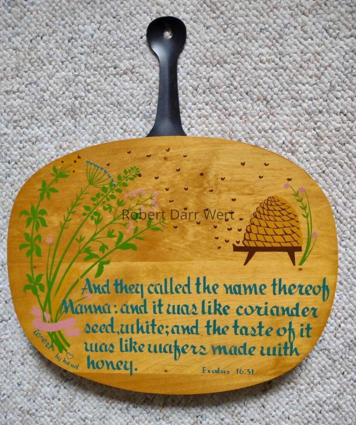 A five-color silkscreen print on wood with a clear finish coat. A stamped iron handle is affixed to the back with screws. The illustration portrays various herbs tied with a ribbon, a bee skep, flying bees, and a passage from the Bible, “And they called the name thereof Manna: and it was like coriander seed, white; and the taste of it was like wafers made with honey. Exodus 16:31”.