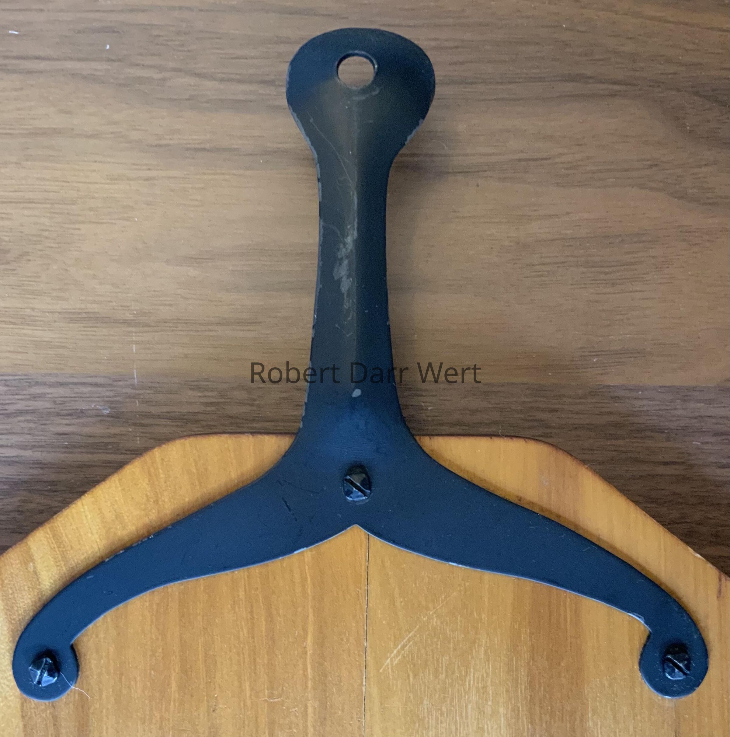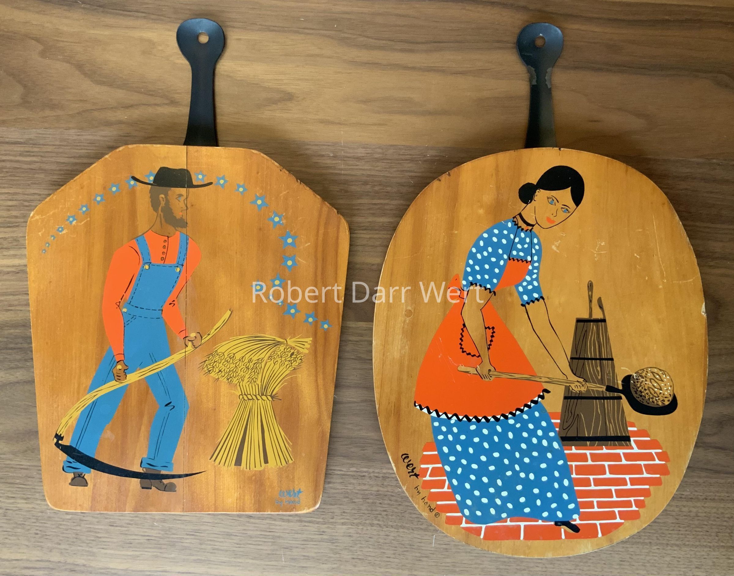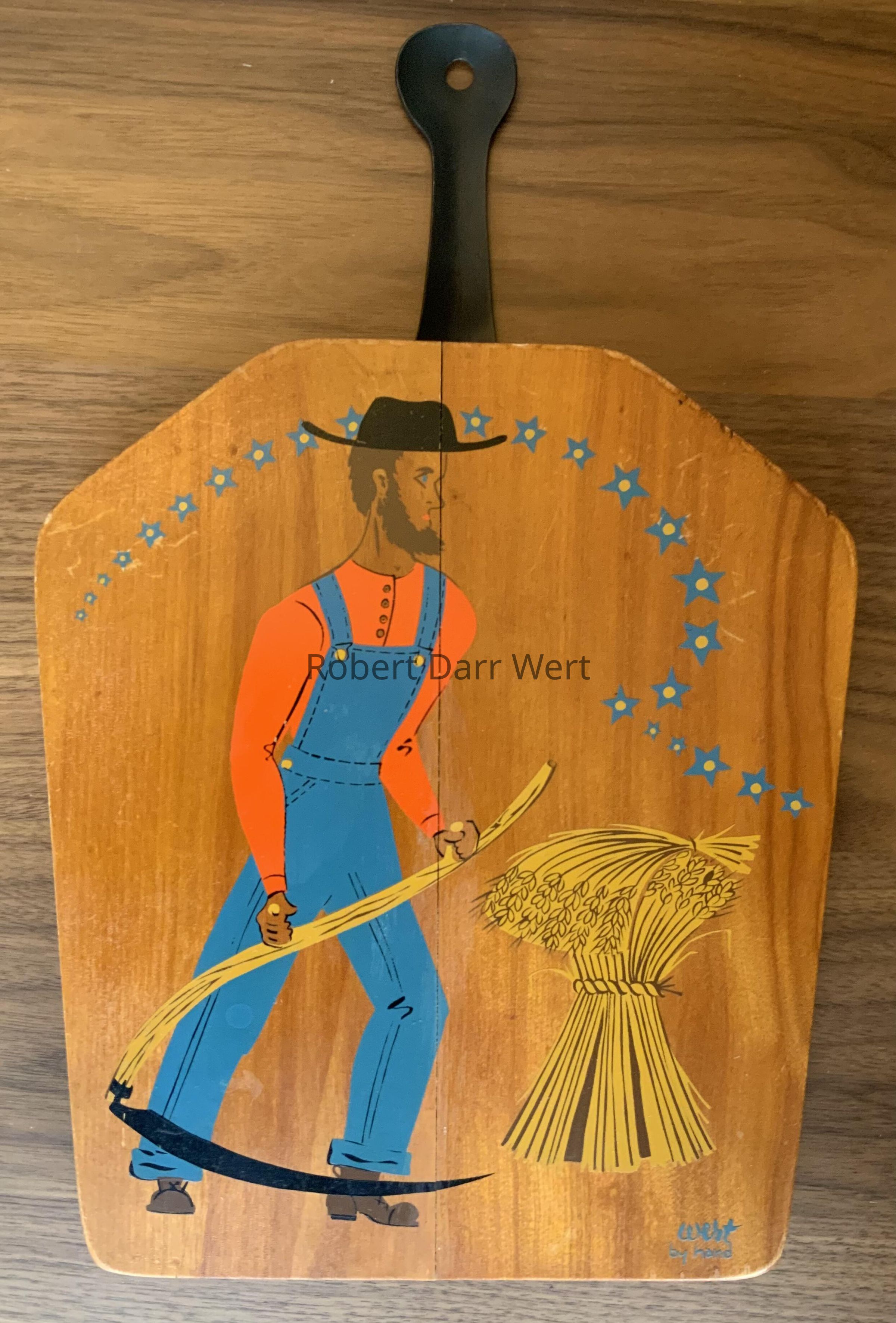 A five-color silkscreen print on hardwood with a clear finish coat, Illustration depicts a Pennsylvania “Dutch” farmer wielding a scythe alongside a shock of wheat. Overhead, stars form the shape of a sickle, another harvest tool. An attached iron handle acts as a hanger as well as a handle when using the back of the board for cutting or serving. The shape of the board is reminiscent of the head of a shovel, a “man’s’ work” tool.