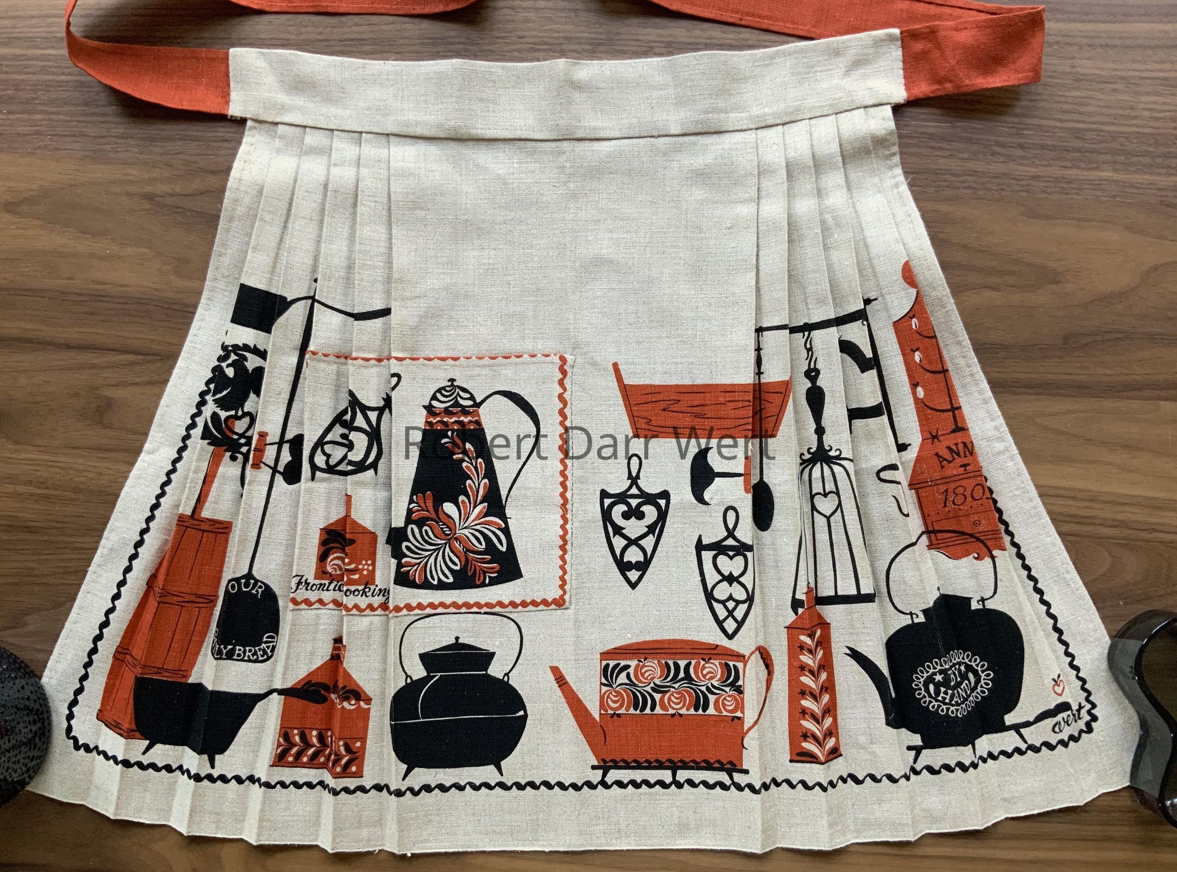 The right and left sections are pleated from waist to bottom edge. A large patch pocket bears the product name, “Frontier Cooking”, and has a cast iron trivet and two painted tin vessels illustrated. The pocket is sized to fit the accompanying pot holder, which has a composition of five cast and wrought iron kitchen tools.