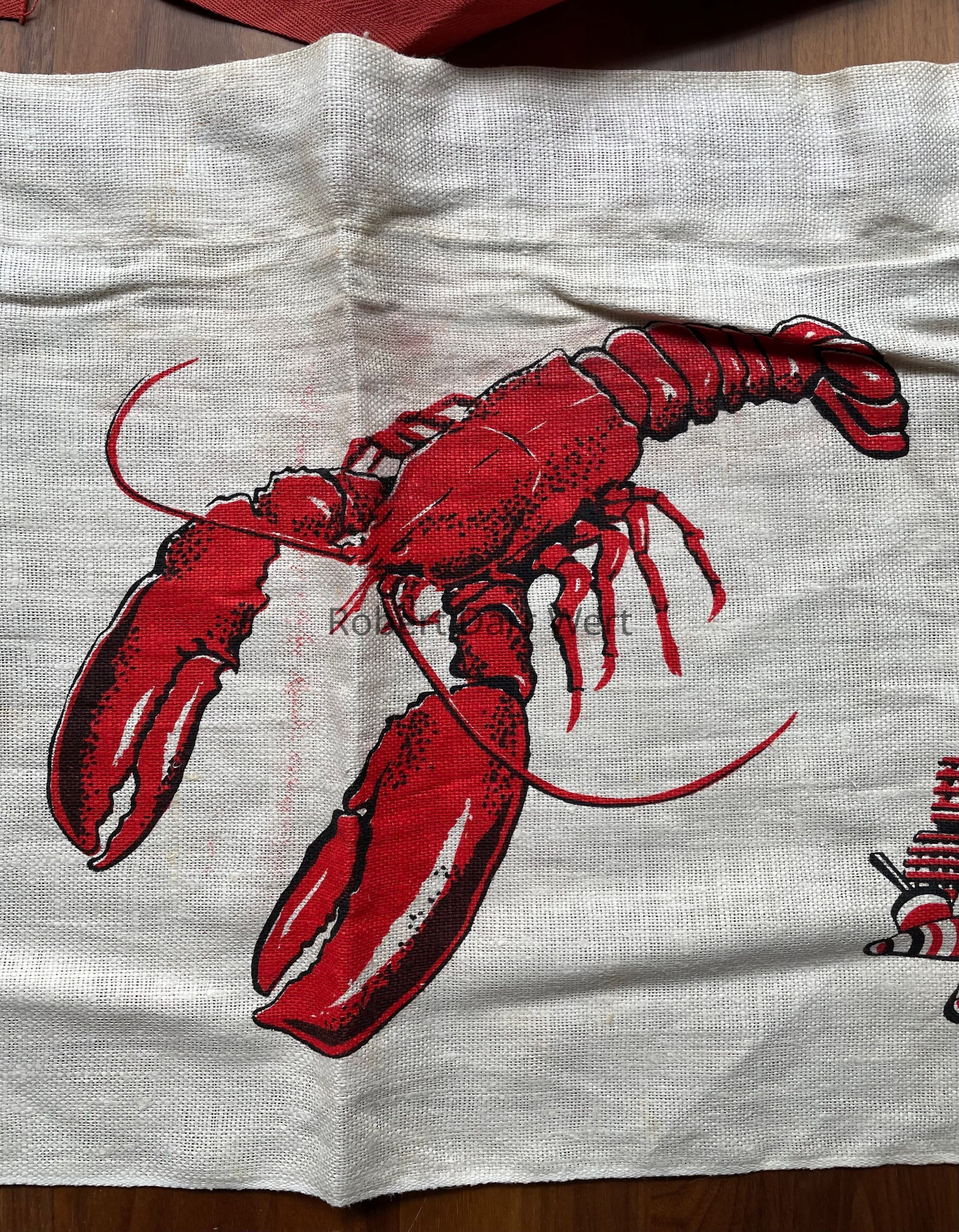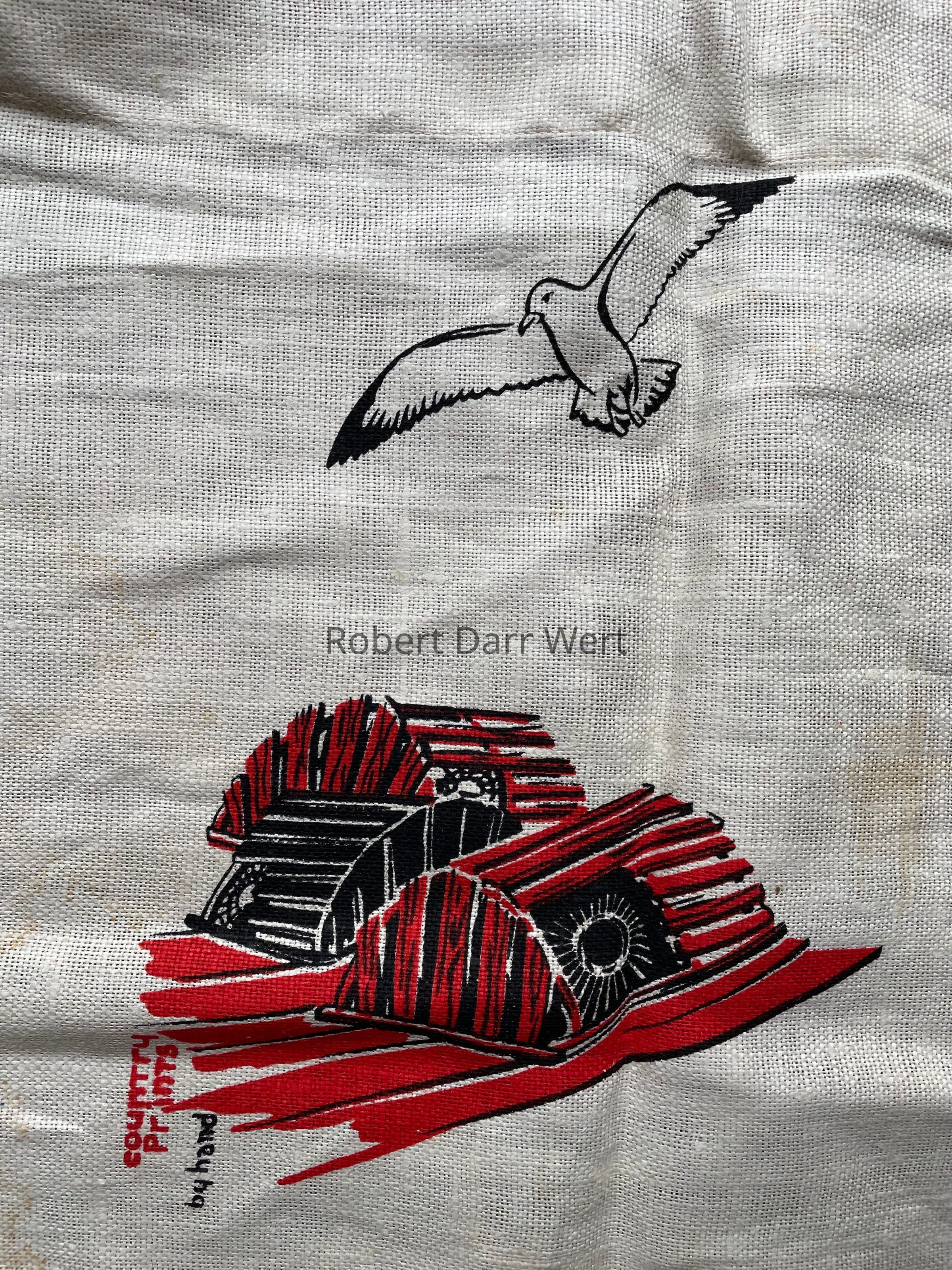 The artwork for this apron and its matching towel/wallhanging and tile was developed for Country Prints by Massachusetts artist Al Winant in the early 1960’s. His last name appears on the apron (lower right corner, on dock plank), and the matching towel/wallhanging. This is a rare example of Wert hiring another artist for the Country Prints product line during his lifetime.Made/Created