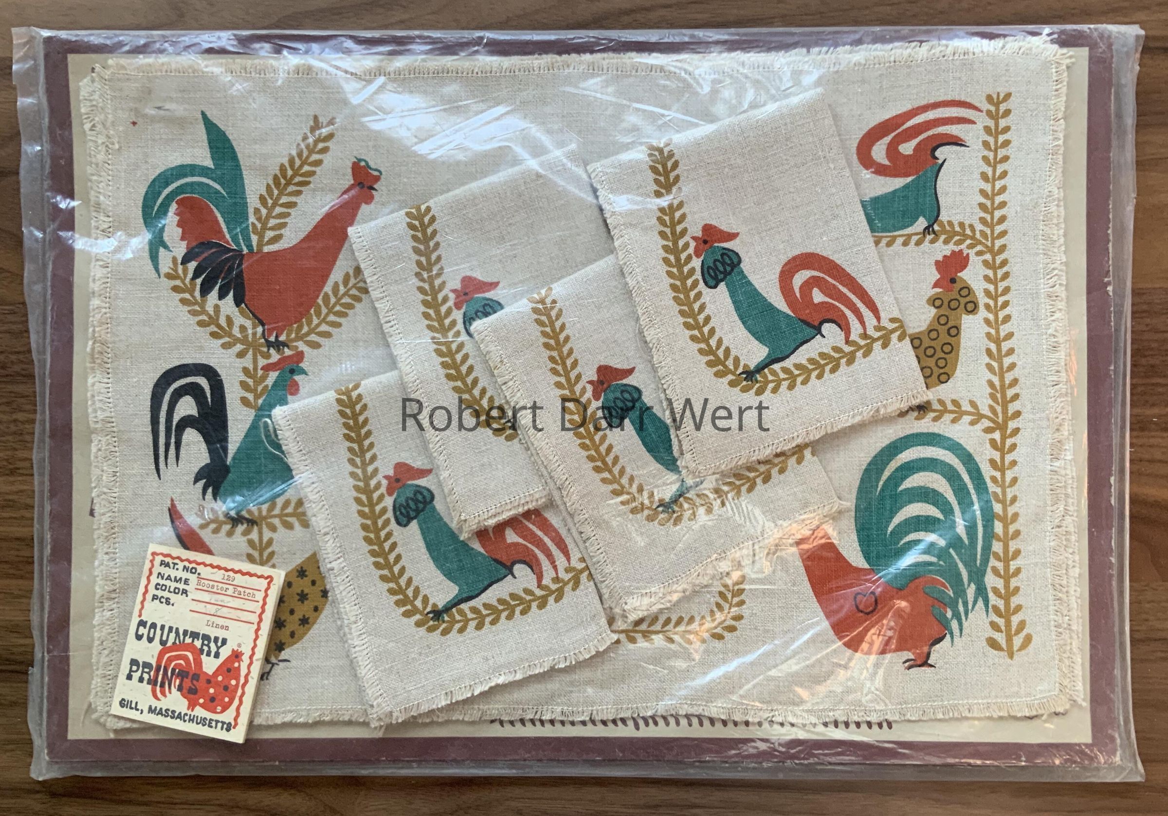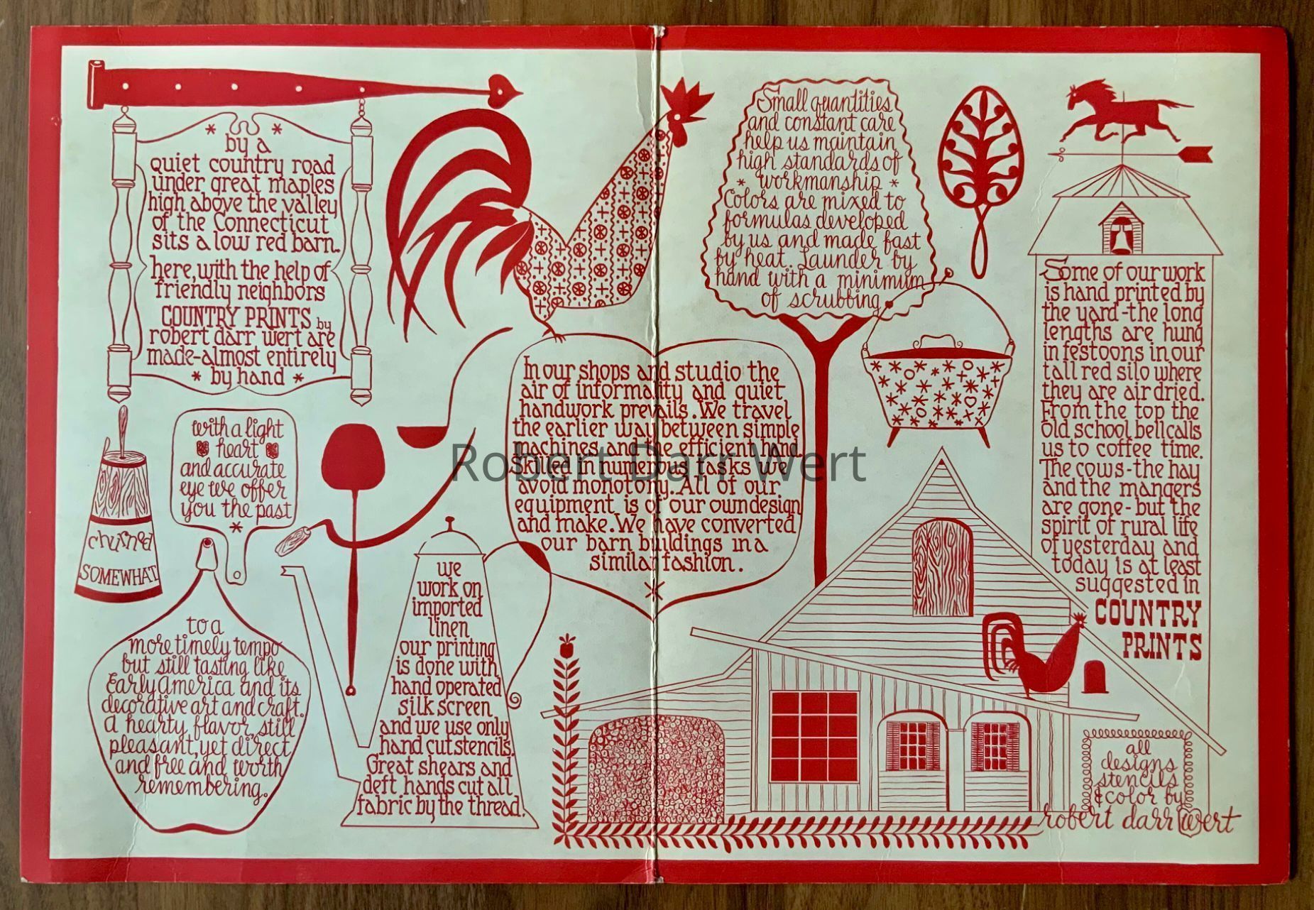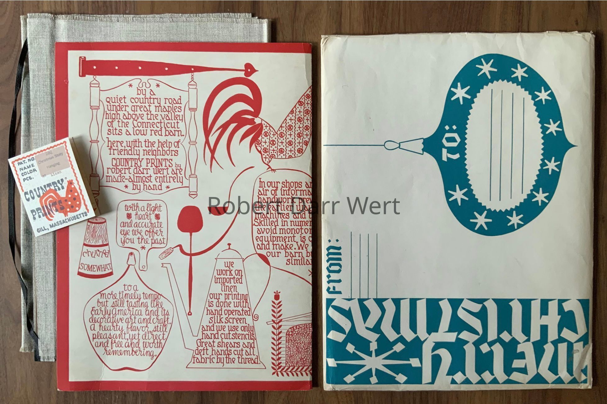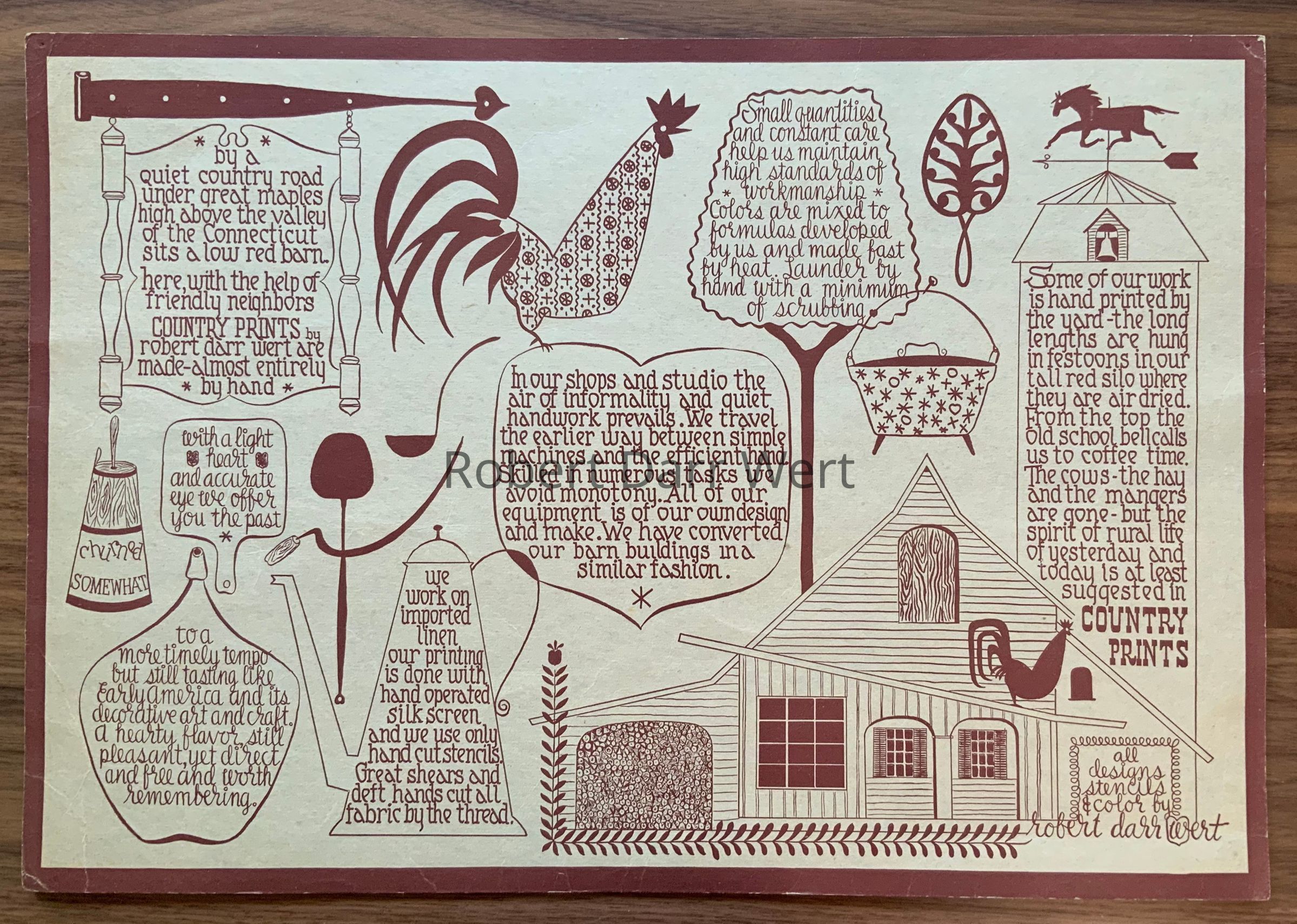 A pack board for table linens with a one-color offset print in brown ink on single-ply natural chipboard describing the Country Prints enterprise owned and operated by artist Robert Darr Wert, used by Country Prints c.1953-1960. This c.1953 update adds a brown border to a previous unbordered design. The illustrations are a slightly reduced version of those found on the earlier letterpress edition on flecked appear.