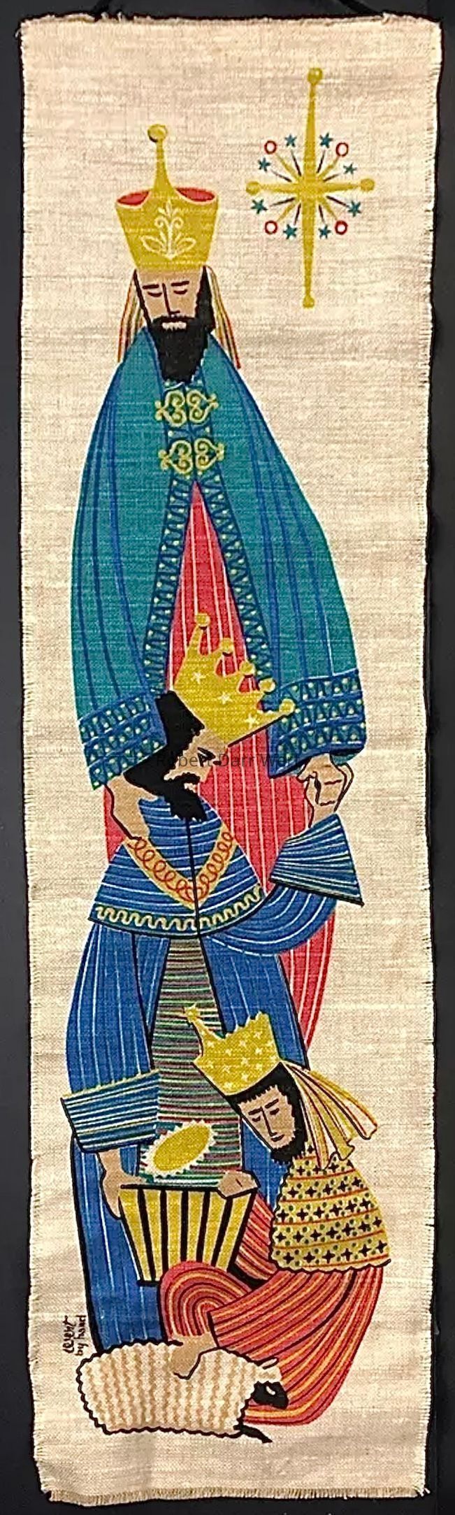 A wallhanging with a five-color silkscreen print on natural linen depicting the three kings of Jesus’ birth. The kings stand, kneel and sit around the manger. The seated king’s hand is on a lamb (the lamb of god). A radiant halo hovers above the manger. A fourteen pointed Christmas star is to the right of the standing king.