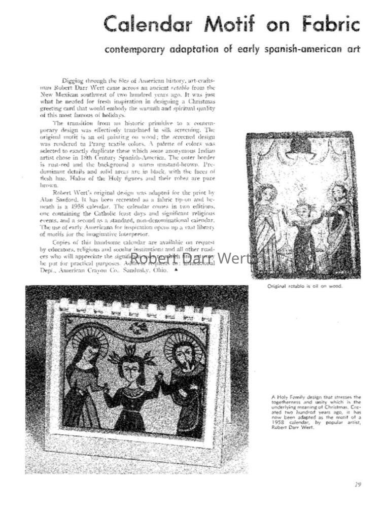 Description and photos of a 1958 calendar designed by Robert Darr Wert. Inspired by a 200 year old retable from New Mexico, it was available as a standard-form secular calendar, or as a Catholic calendar with all major religious holidays.