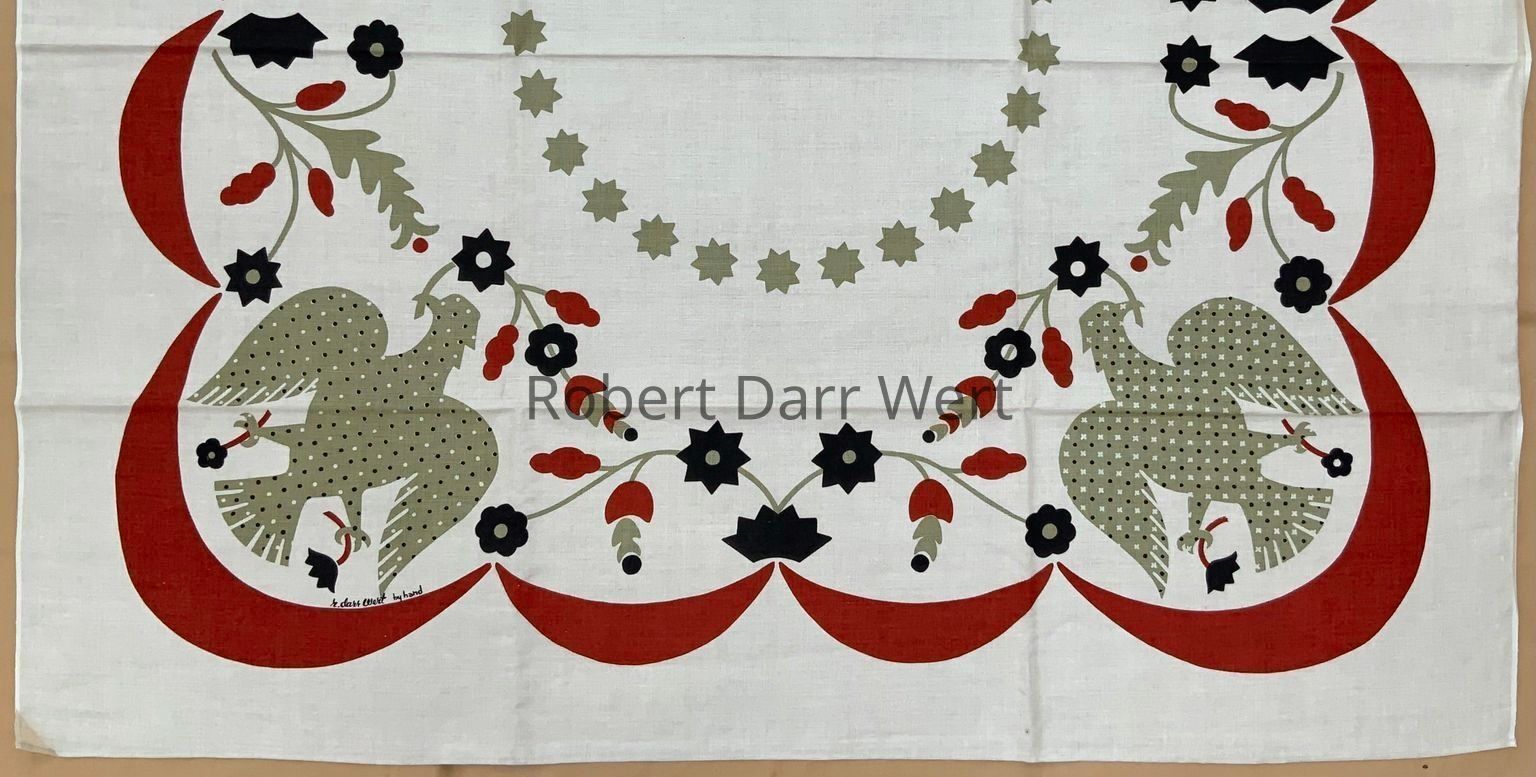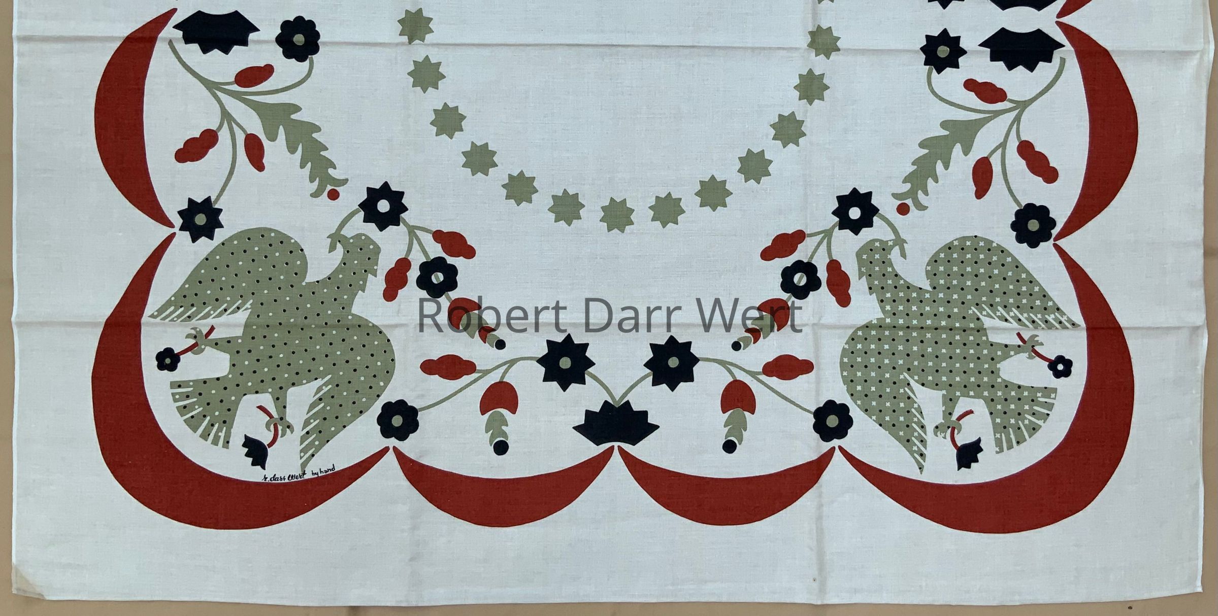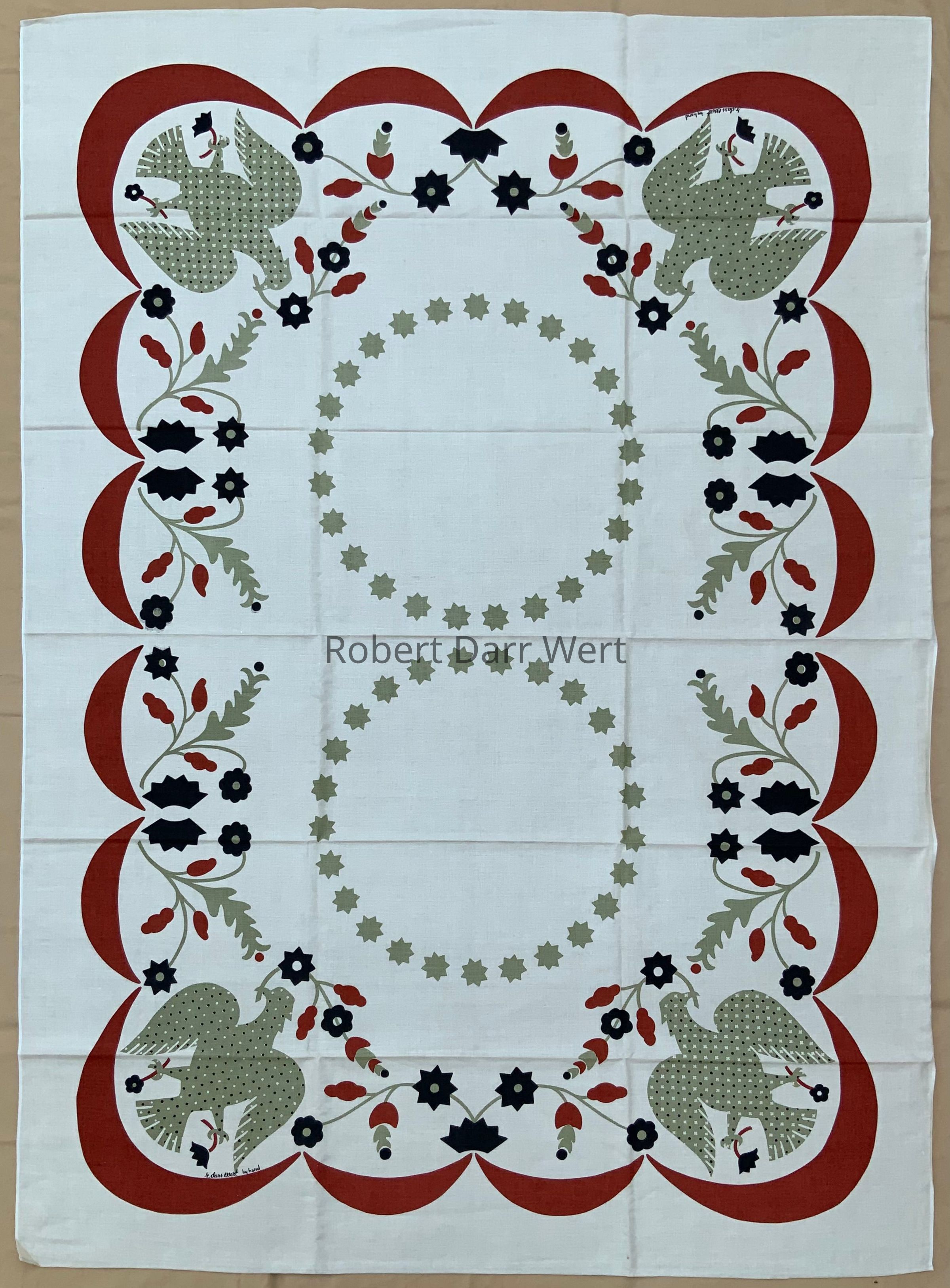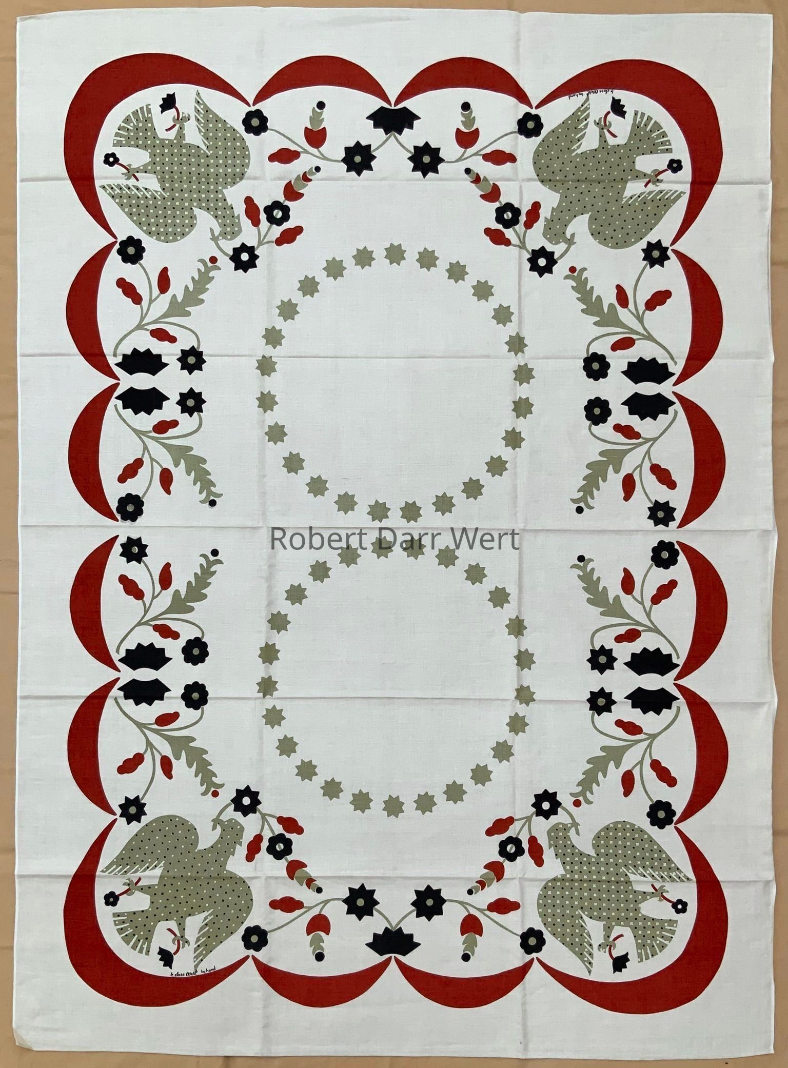 This tablecloth is listed in the January 1960 Country Prints price list in two sizes (52” x 52”, 52” x 72”), and in three colorways (blue, red, or brown). It also appears in the c.1960 brochure “Mat Sets by Robert Darr Wert/Country Prints”.