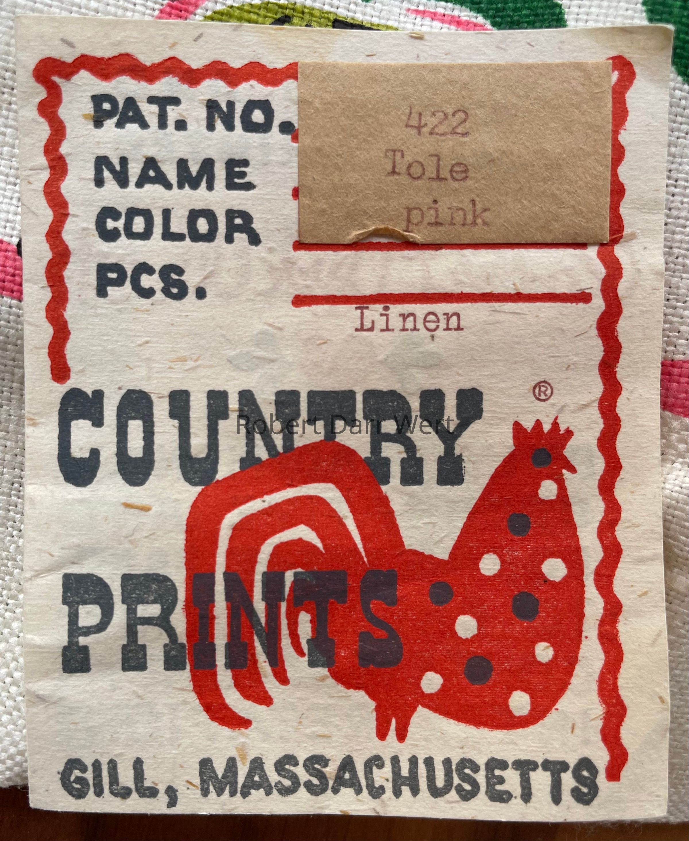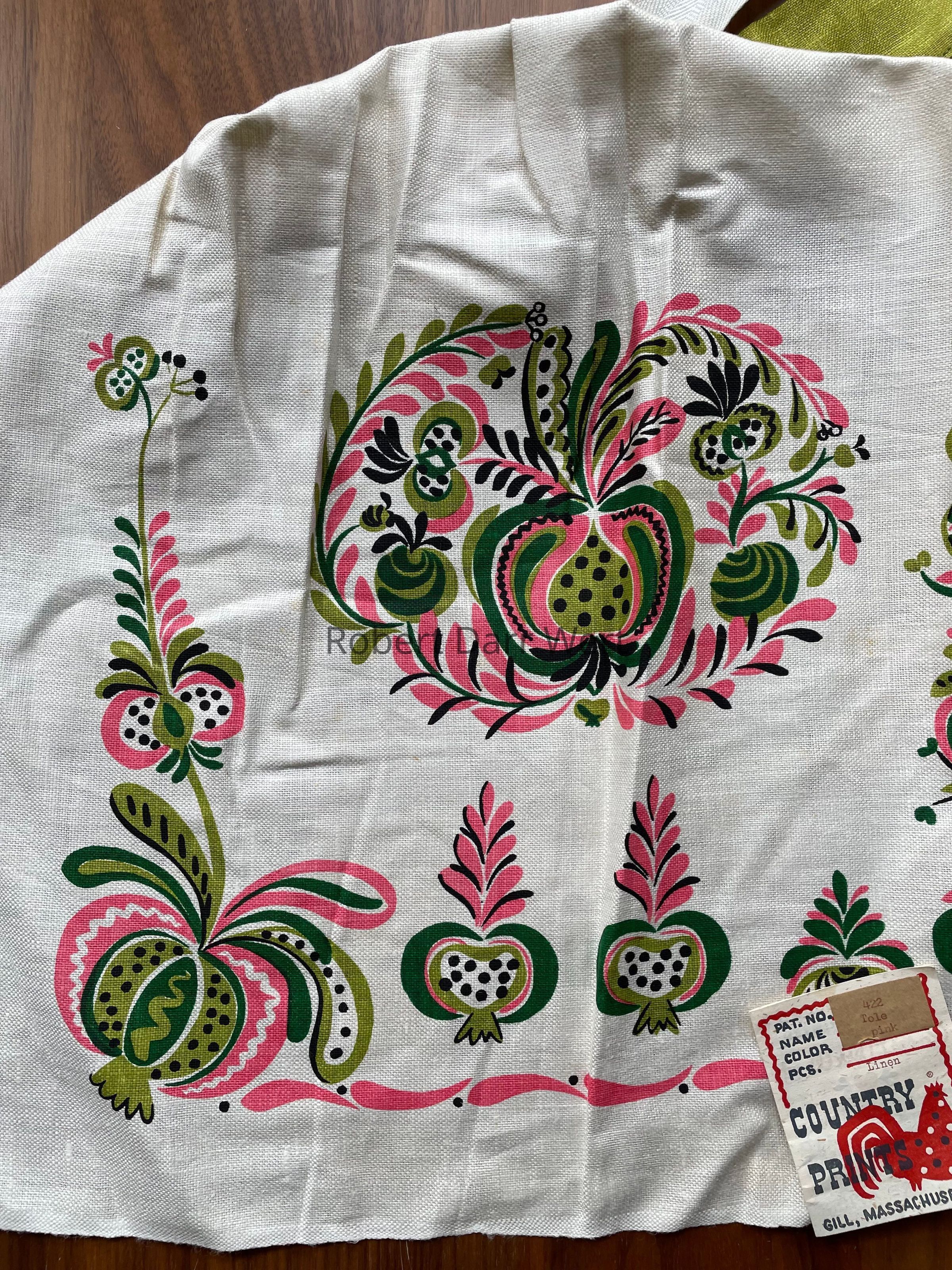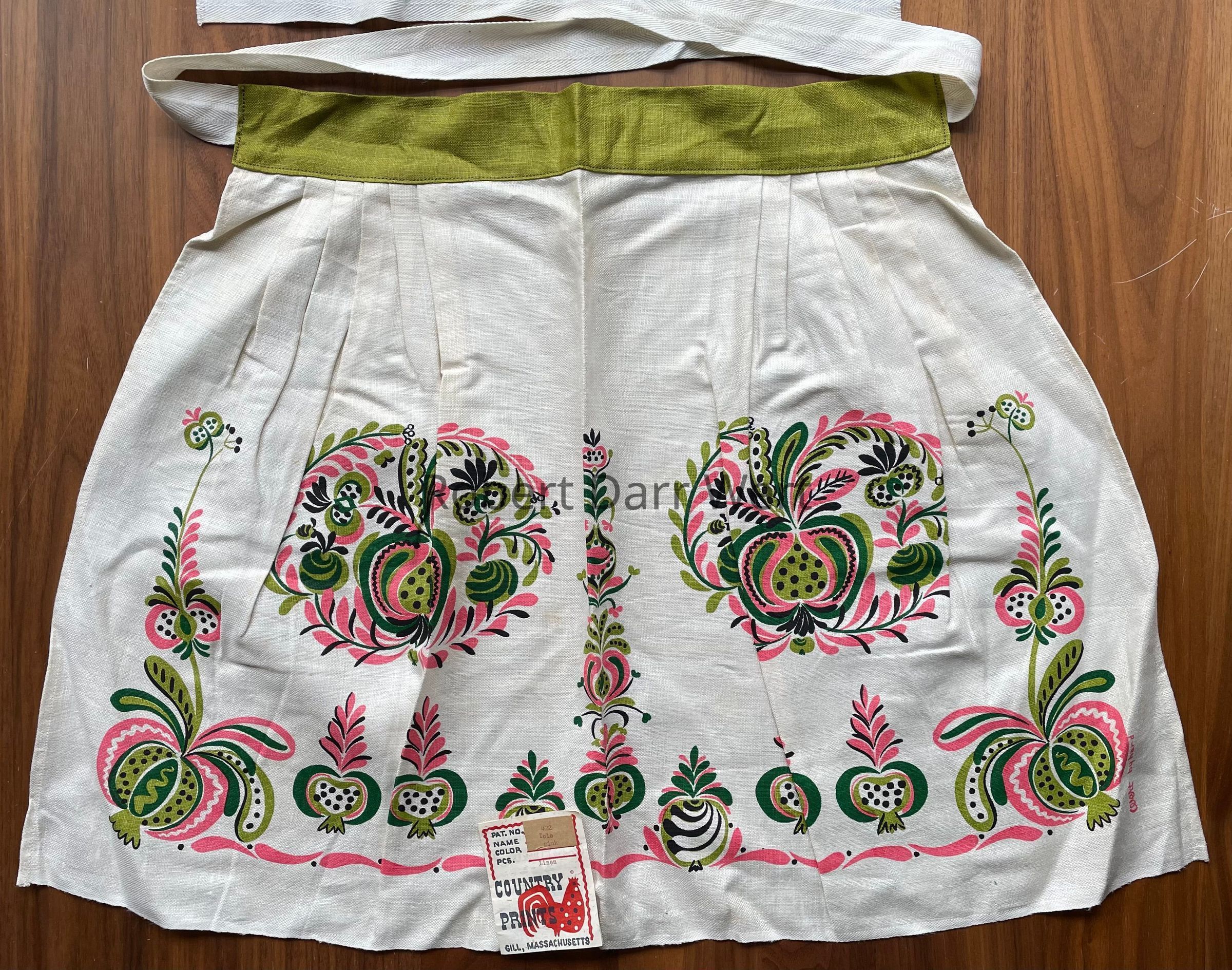 This apron is listed in the January 1960 Country Prints price list in two colorways (pink or blue), and it appears in the c.1960 brochure “Mat Sets by Robert Darr Wert/Country Prints”.