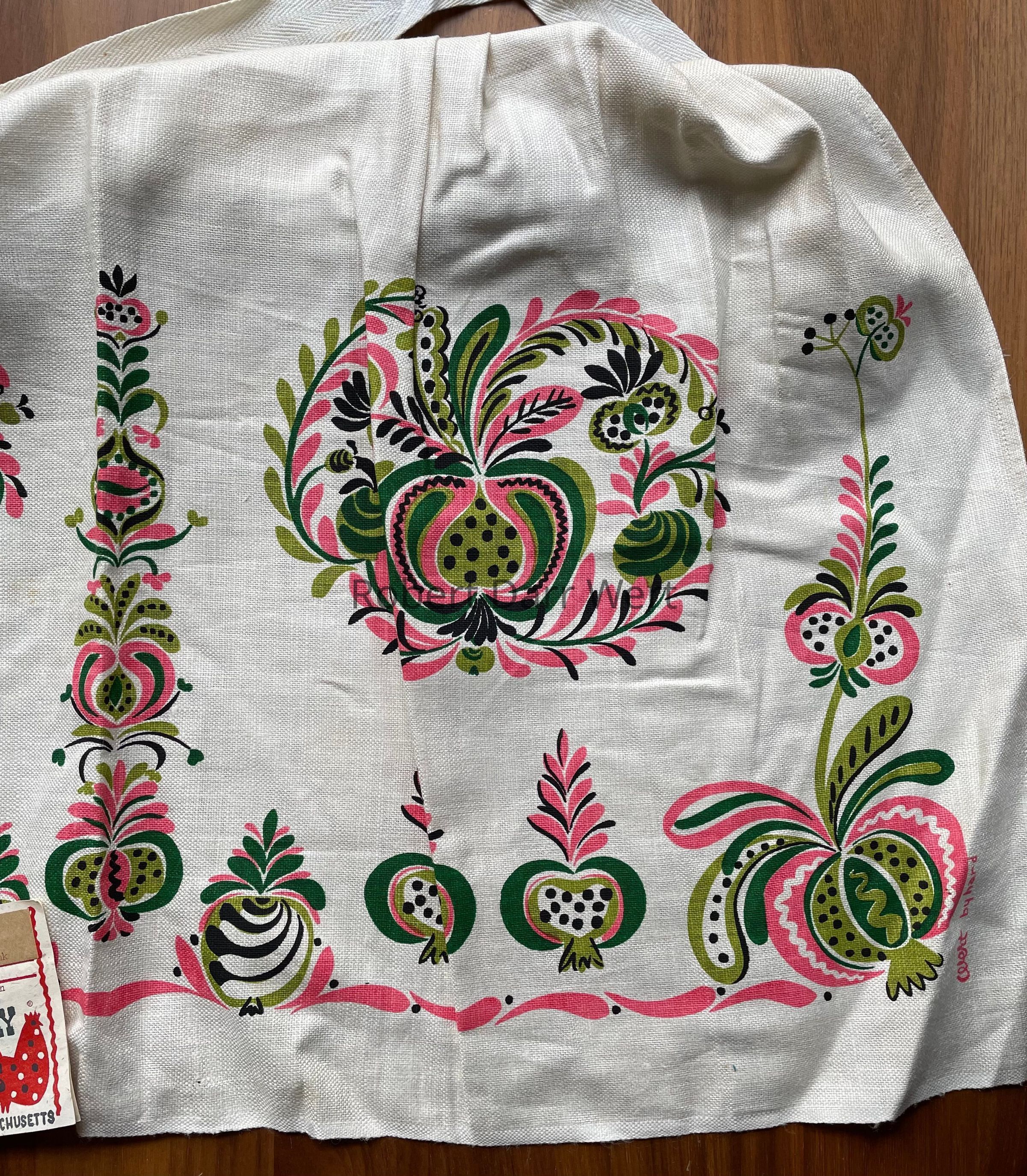 An apron with a four-color silkscreen print on white linen depicting designs found on painted tin or toleware.