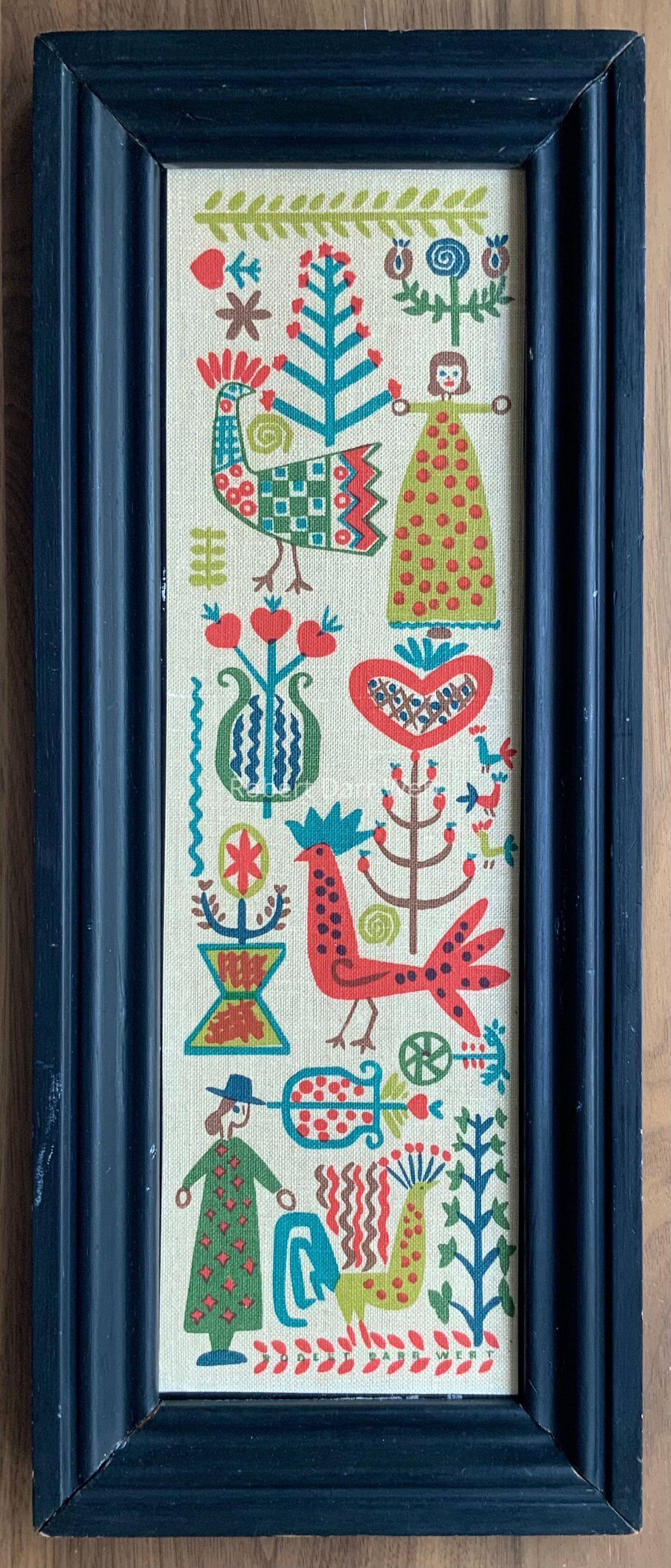 Wert produced at least two versions of “Folk Patterns”. Based on the signature, this is likely the earlier version, which appears in the c.1955 brochure “Country Prints in Frames” paired with Early Birds 516-3. It also appears in a c.1955 price list with the description, “Gay motifs peasant art.”