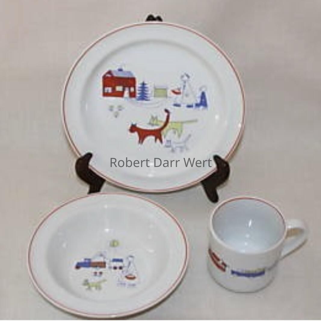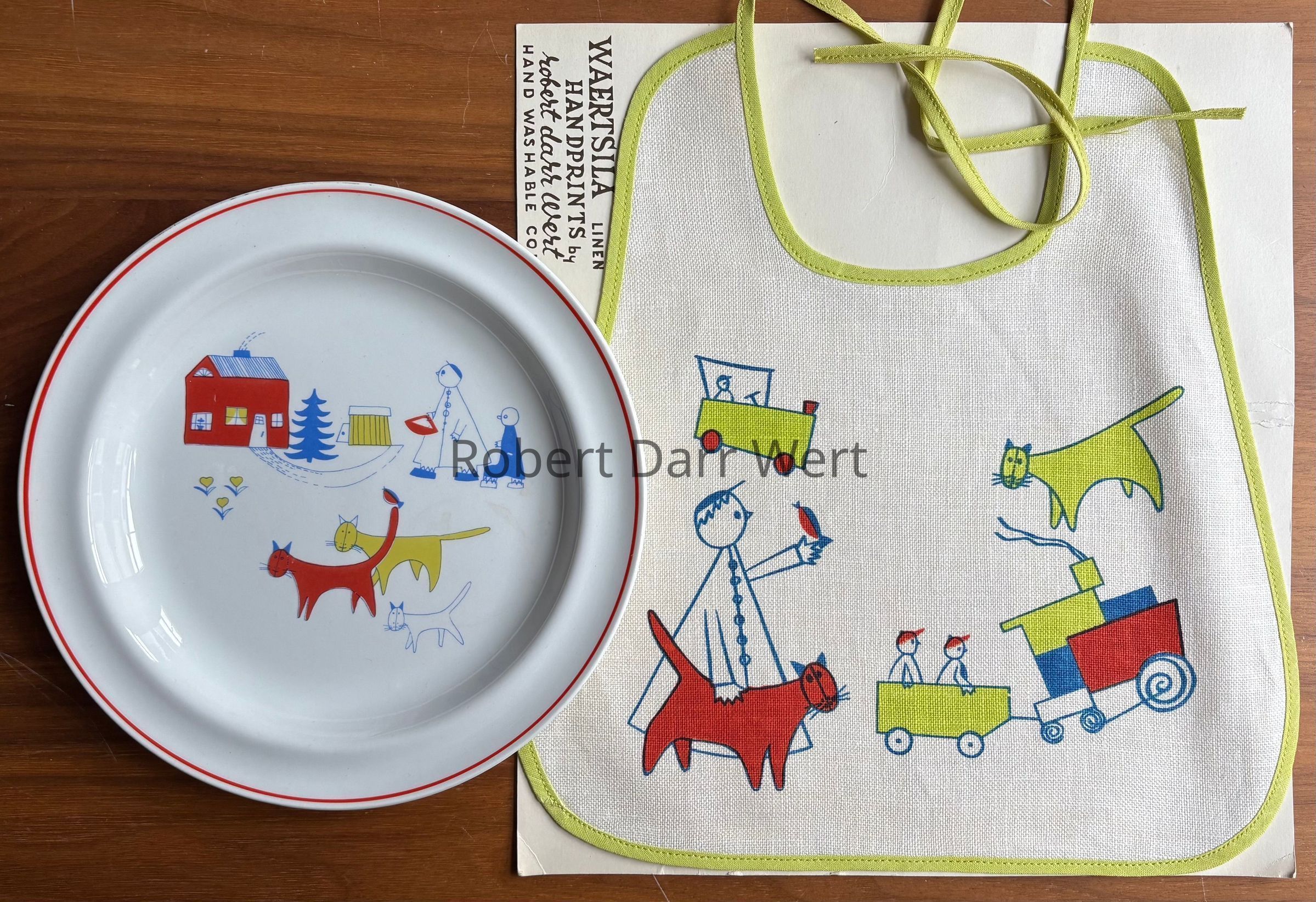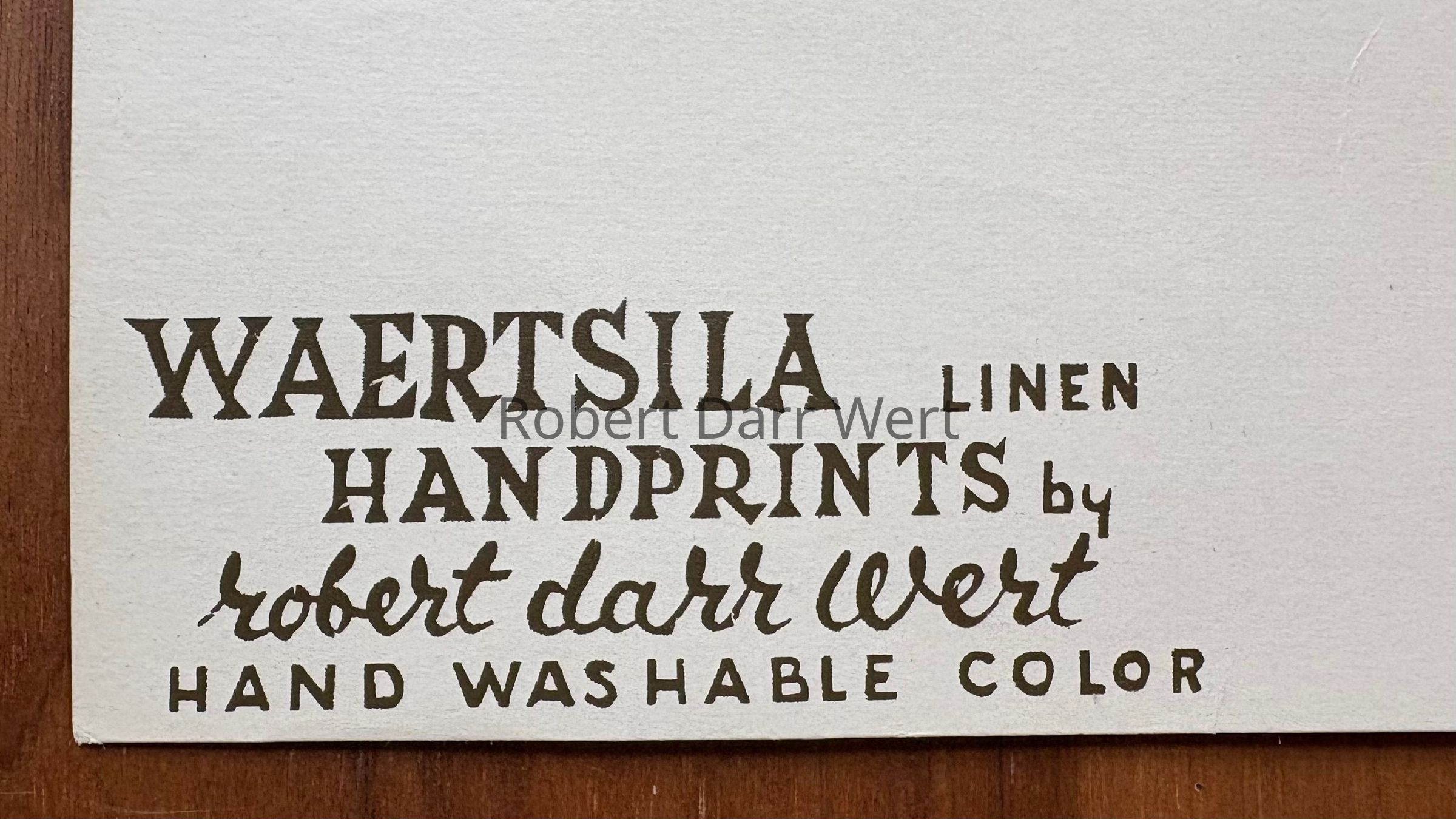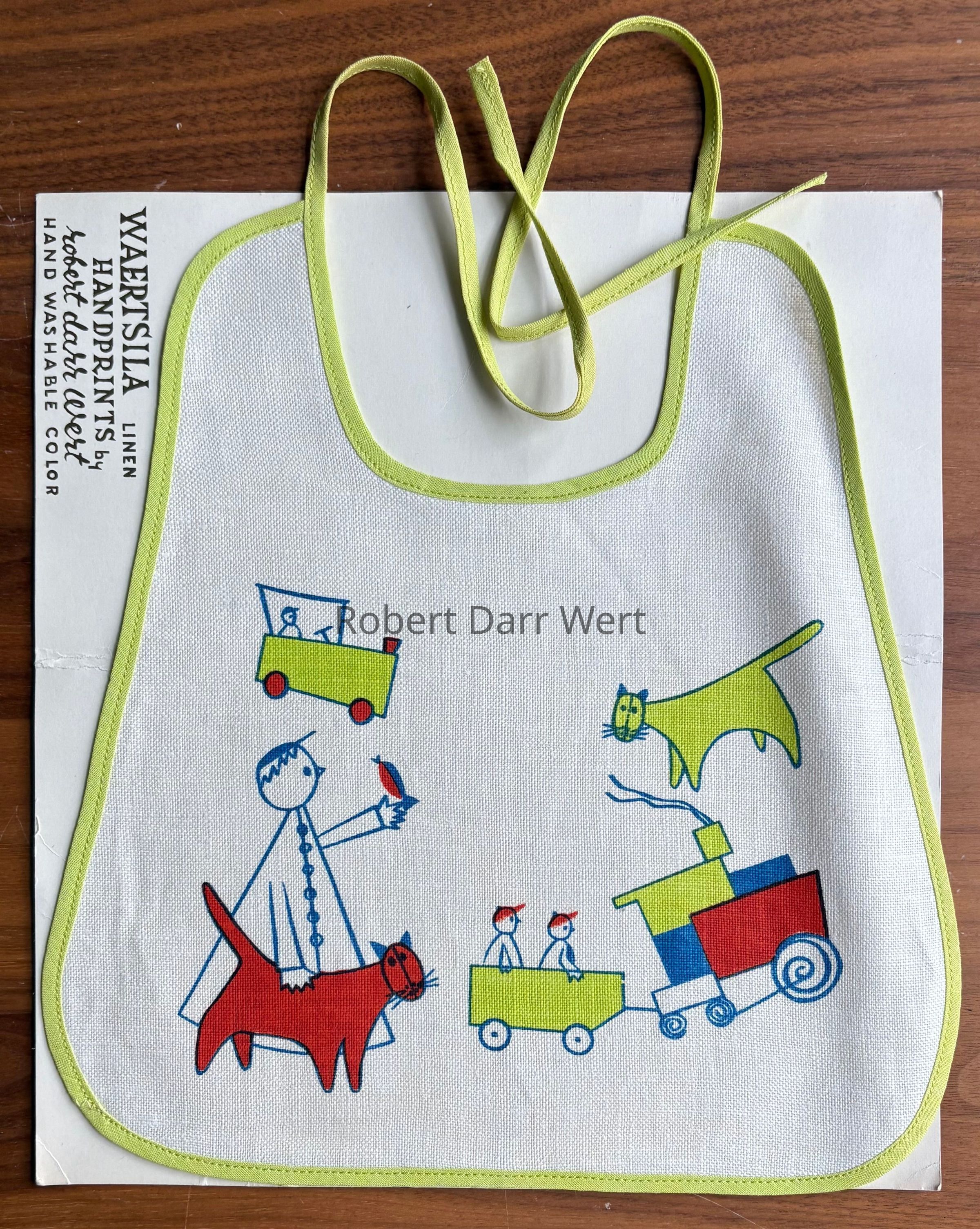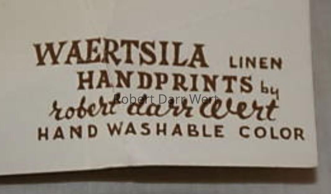 Most likely produced for Twining & Buck of Salisbury, Connecticut, a high end retailer of modern home furnishings. Twining & Buck had relationships with both Arabia and Country Prints from the time the shop opened in 1950. Based on a December 1956 editorial in Craft Horizons magazine, textile historian Susan Ward believes it is most likely Twining & Buck engaged Robert Darr Wert to produce silkscreen printed bibs and placemat sets to match the Arabia Finland china in their inventory. Arabia Finland knows of no such working relationship between their company and Wert. Several baby bibs and two placemat sets have been documented under the name “Waertsila Linens Hand Printed by Robert Darr Wert”; see “Waertsila Linens by Robert Darr Wert” entries.Made/Created