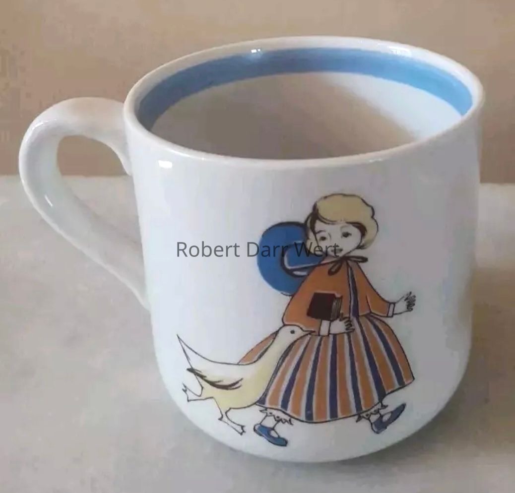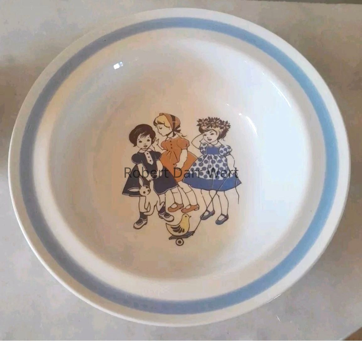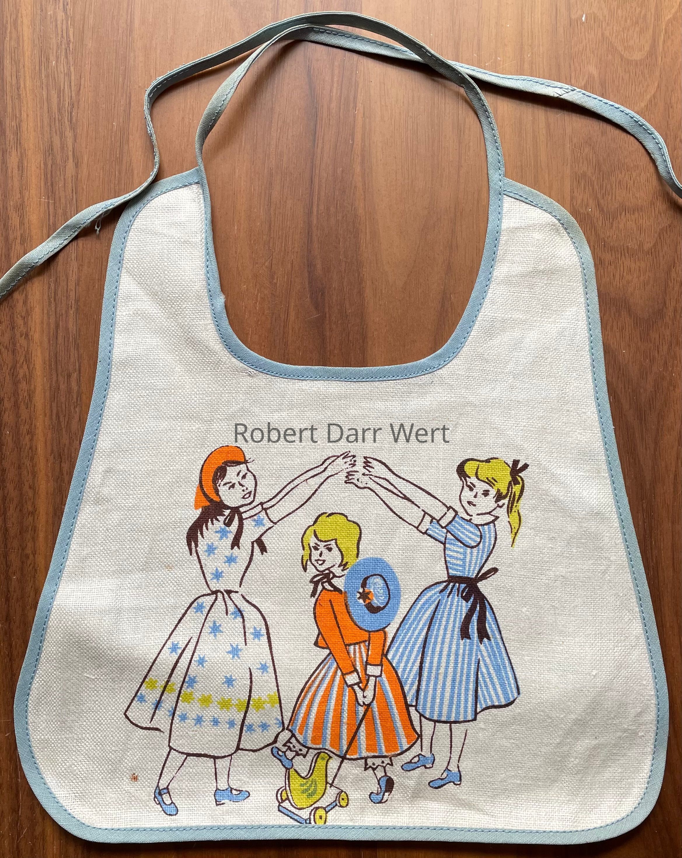 A four-color silkscreen print on a baby bib with Wert’s interpretation of the pattern on a child’s breakfast set by Arabia Finland (possibly by Anja Juurikala).
