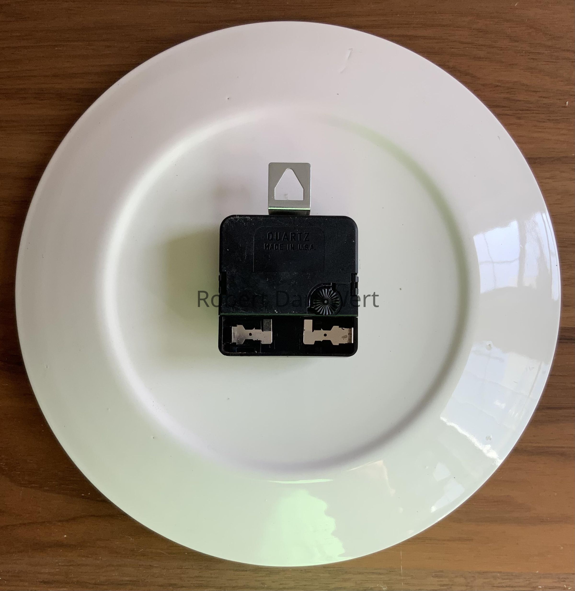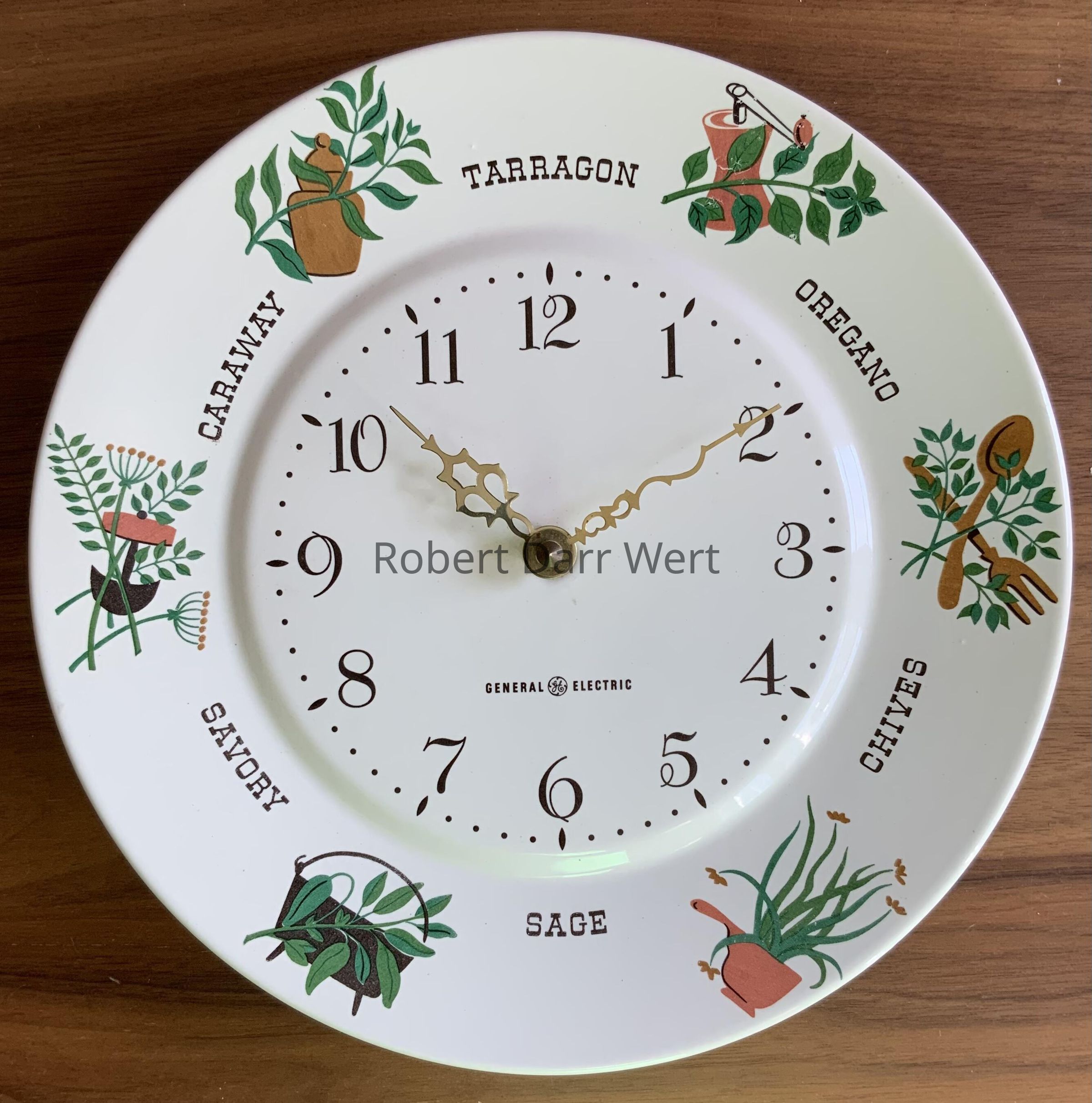 A four-color illustrated clock by General Electric (GE) Clocks Division. The clock face is a ceramic plate. With battery operated works, this was an early example of a cordless clock. Though this has not been authenticated as a Wert design, the illustrations and fonts used bear strong similarities to his work.