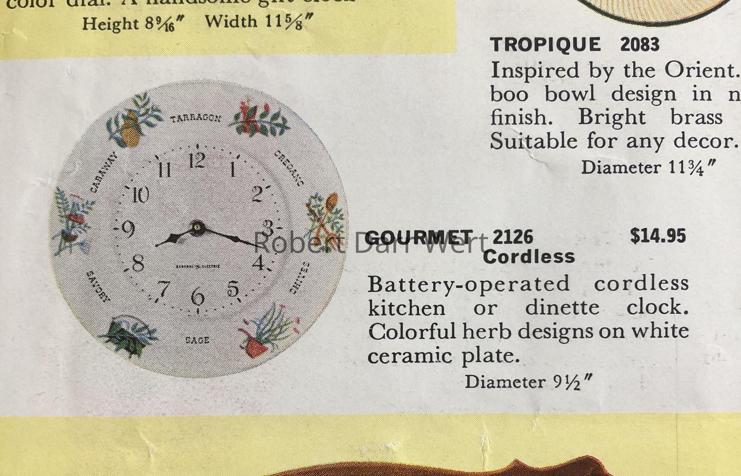 “ 7. GOURMET. Cordless. Charming kitchen or dinette clock, with colorful herb designs on a white ceramic plate. Precision built battery movement. Diameter 8 1/2”.