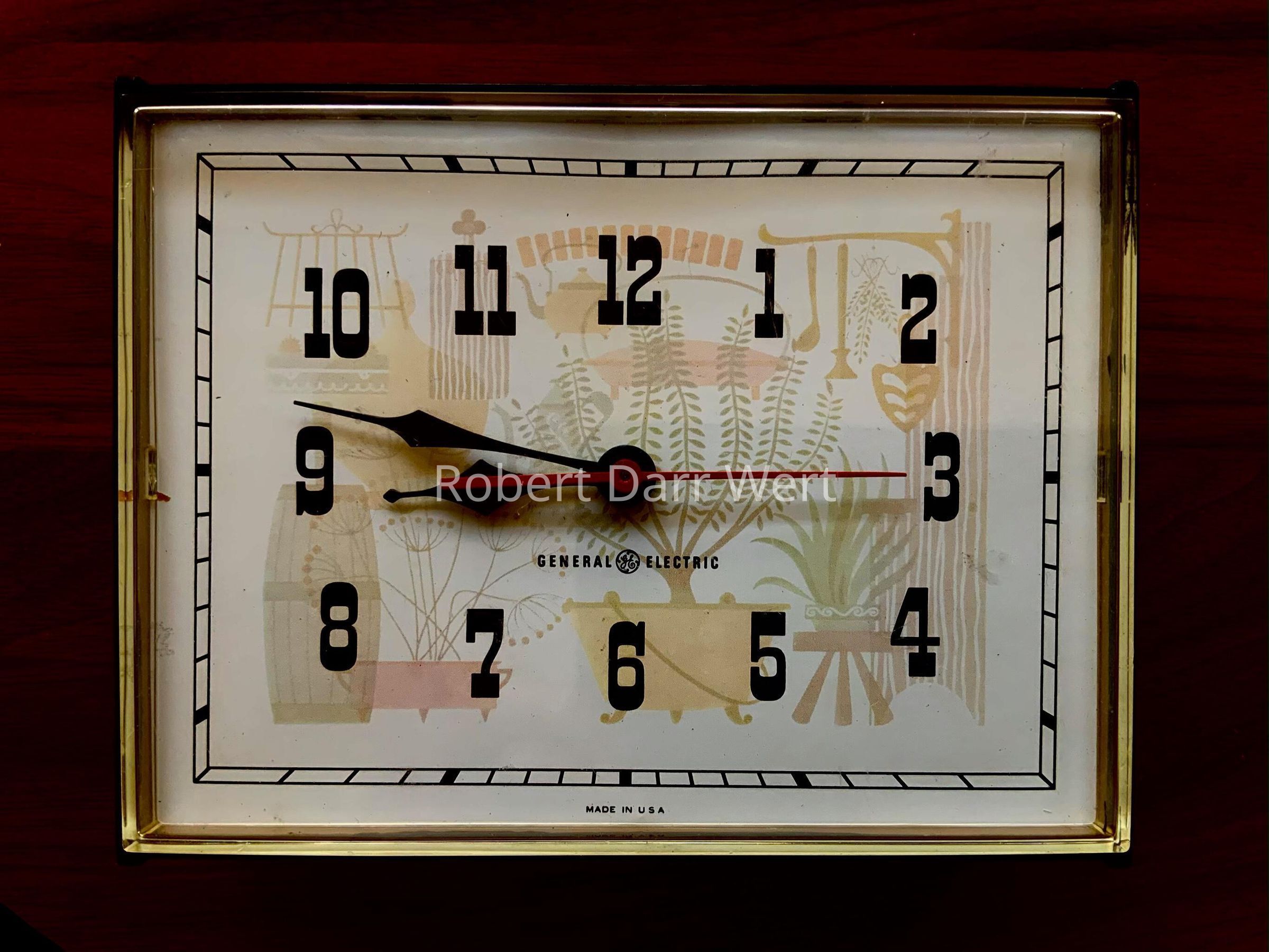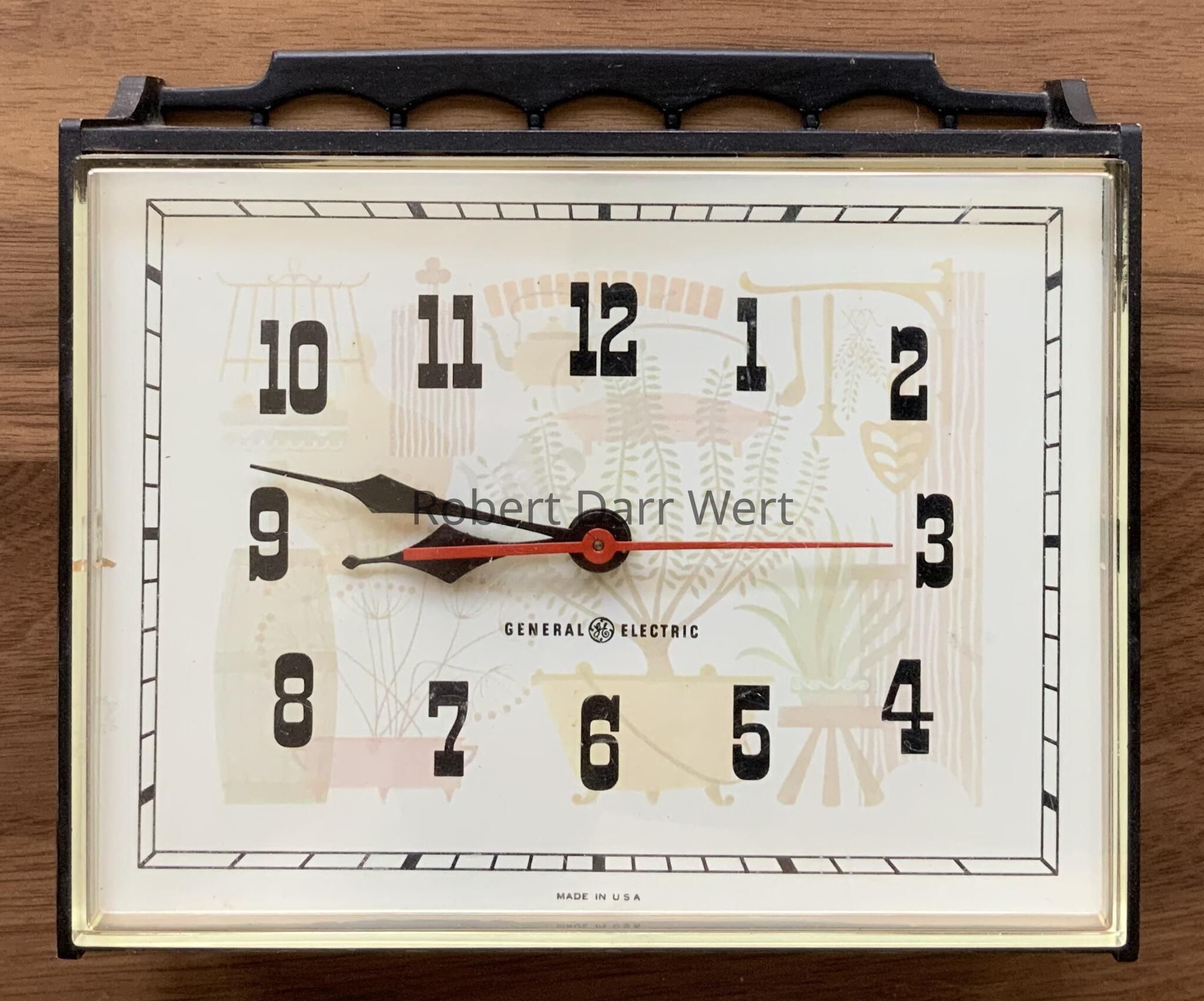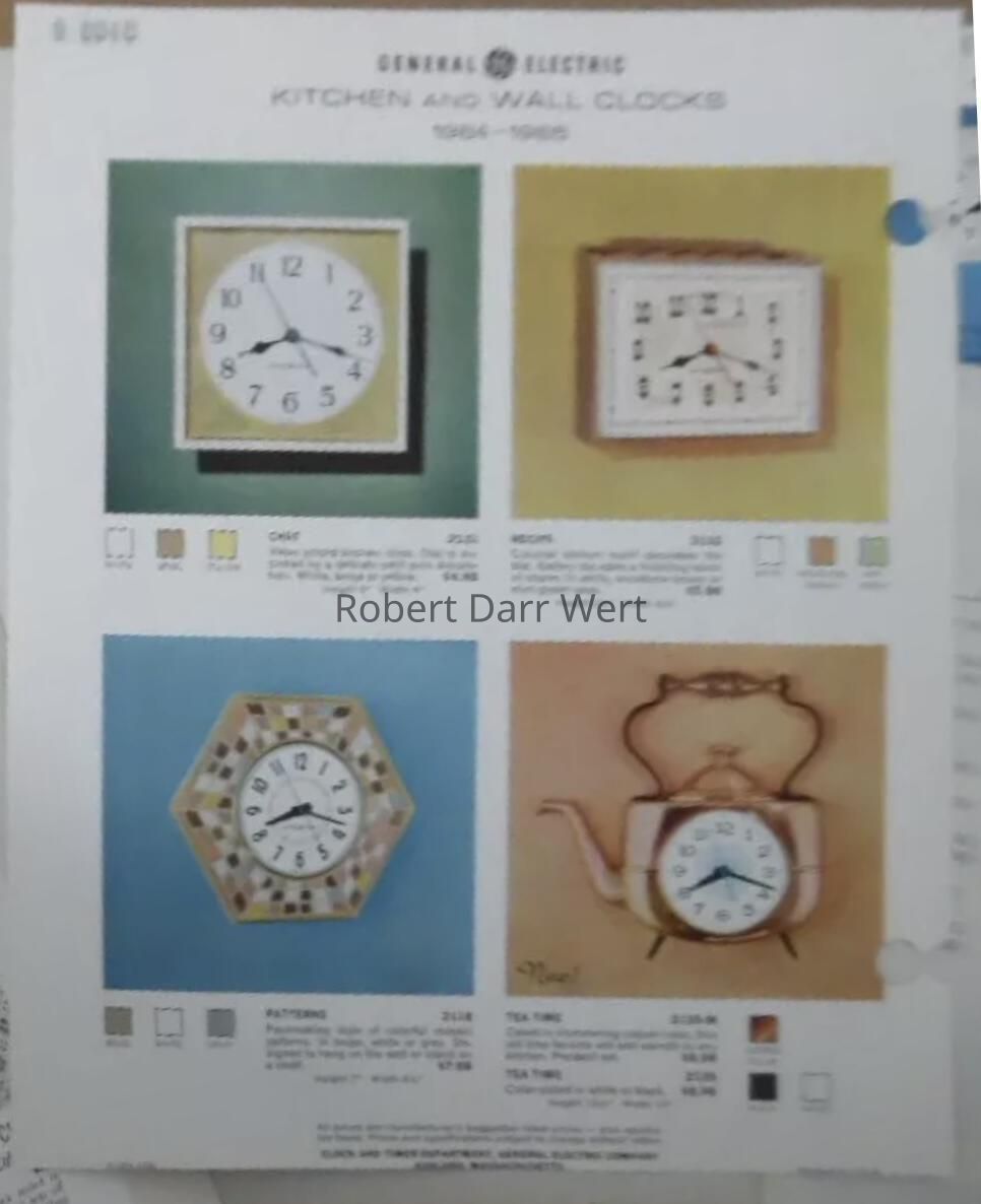 “Recipe” wall clock with a half-tone color illustration of an early American kitchen on the face. This has not been authenticated as a Wert design, but the illustration on the clock face bears strong similarities to his work. This design appears with one authenticated Wert clock and one other possible Wert clock in GE’s “Wholesale Gift Catalog/Holiday Season ‘63”; see images.