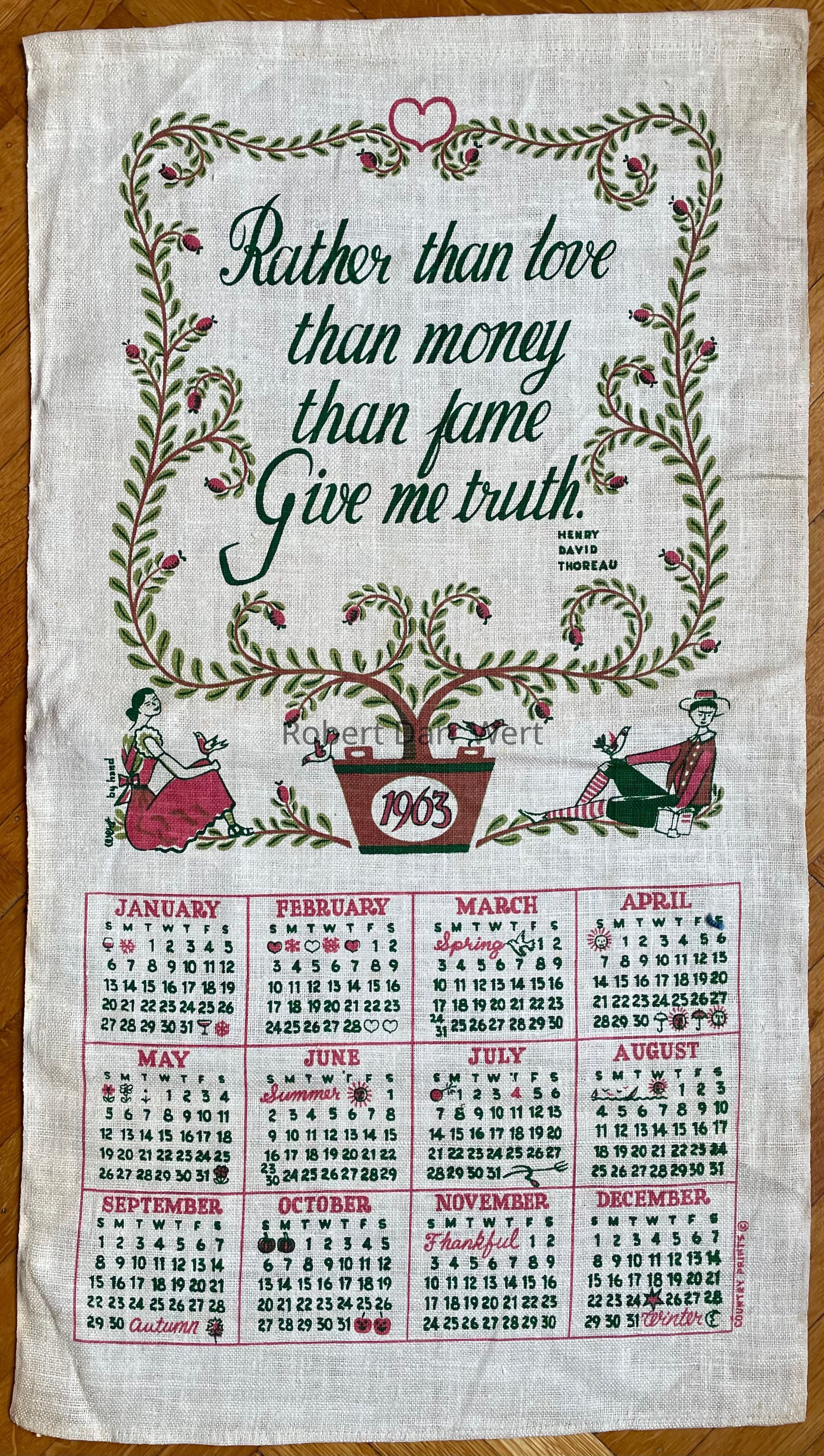 A calendar towel with a three-screen/four-color silkscreen print on white linen. Above the printed calendar, an eighteenth century couple sits on either side of a large wooden bucket emblazoned with the year 1963. From the bucket grows an espaliered fruit tree with branches framing a quote from Henry David Thoreau: