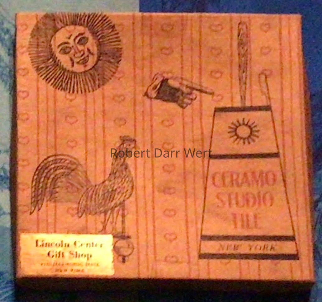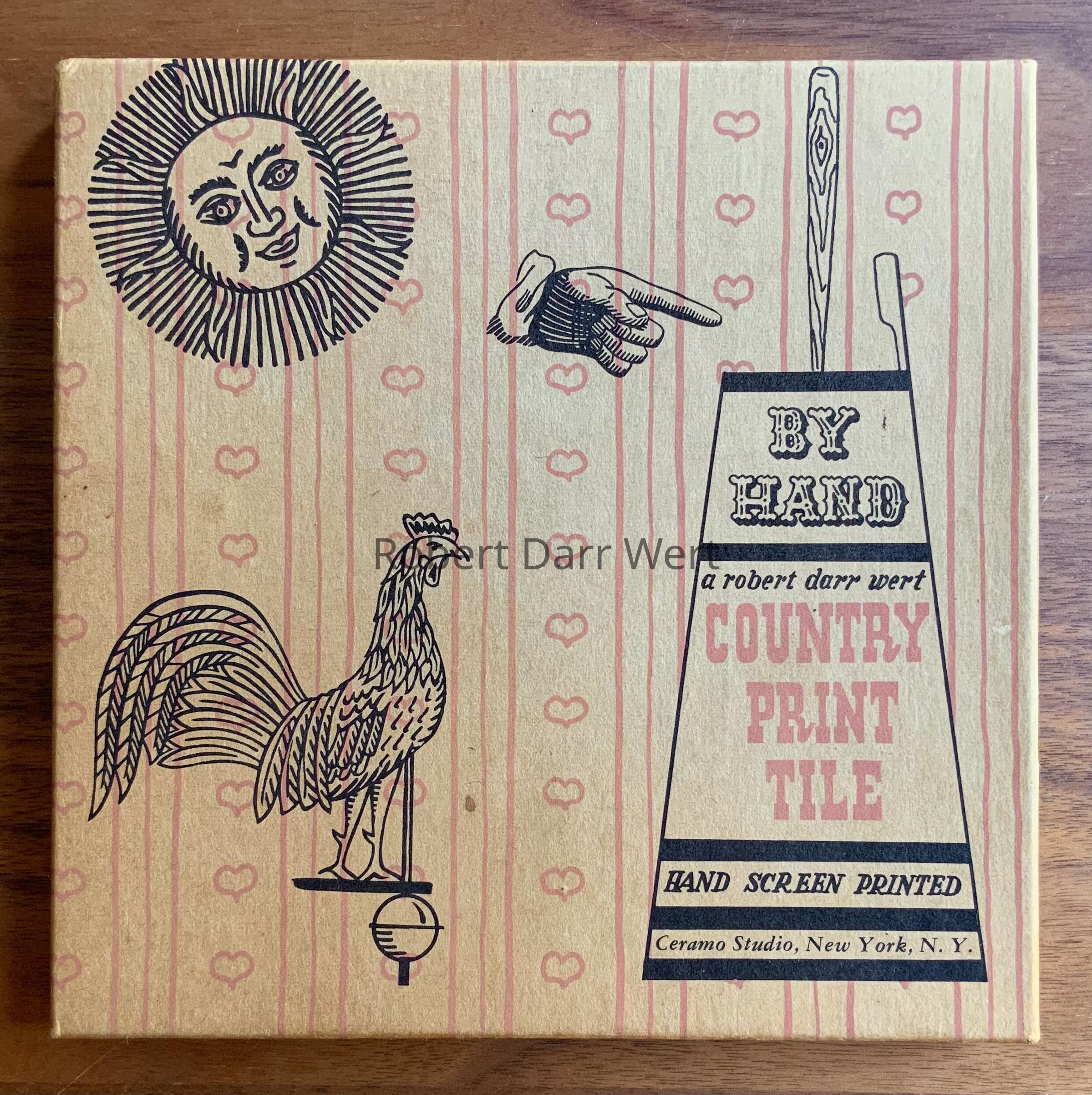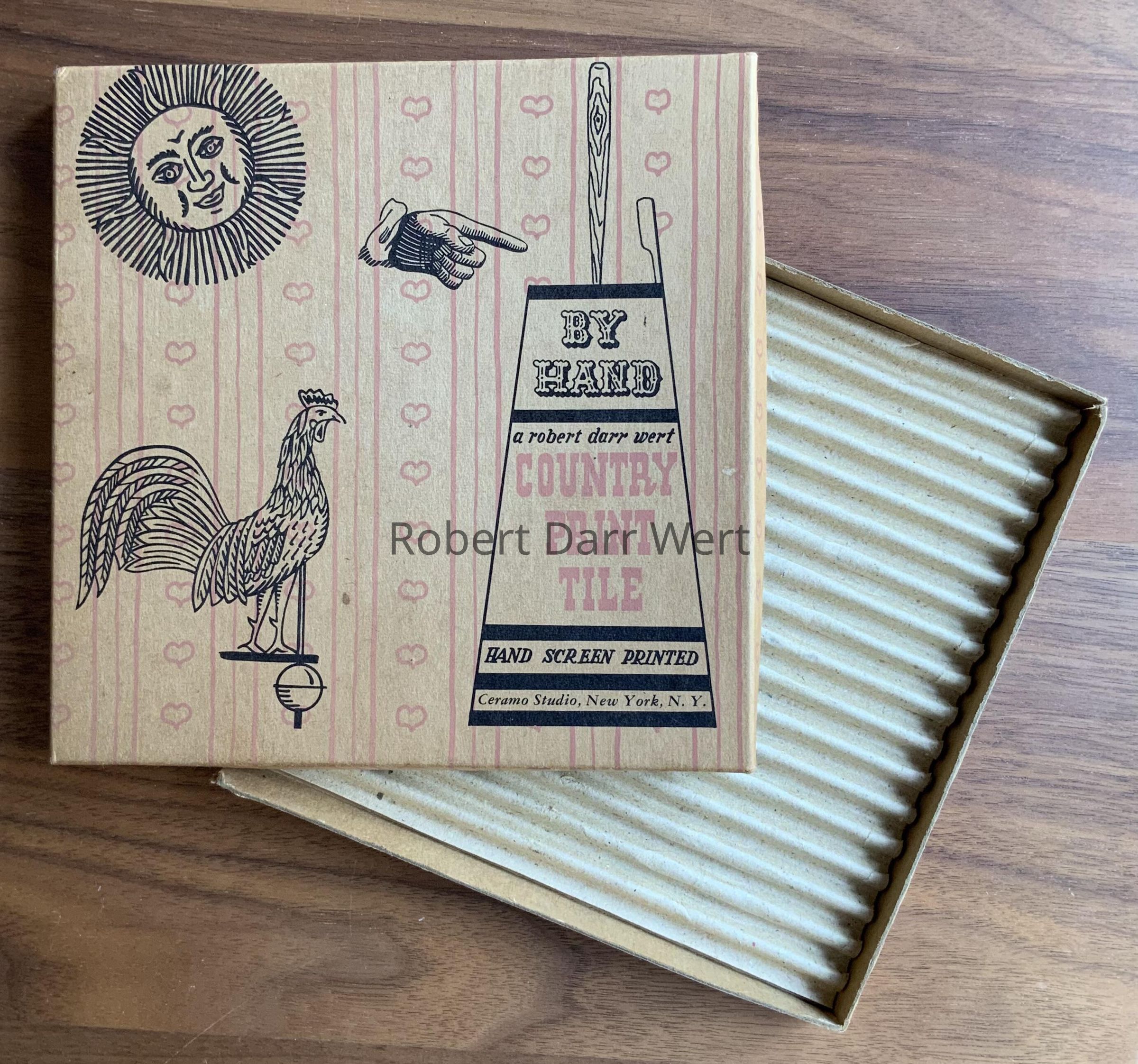 The tile box was designed to match two other “Country Store” gift boxes (towel and tile gift set, and a placemat box) as well as the c.1963 brochure “Country Prints by Robert Darr Wert and Neighbors”; see images.
