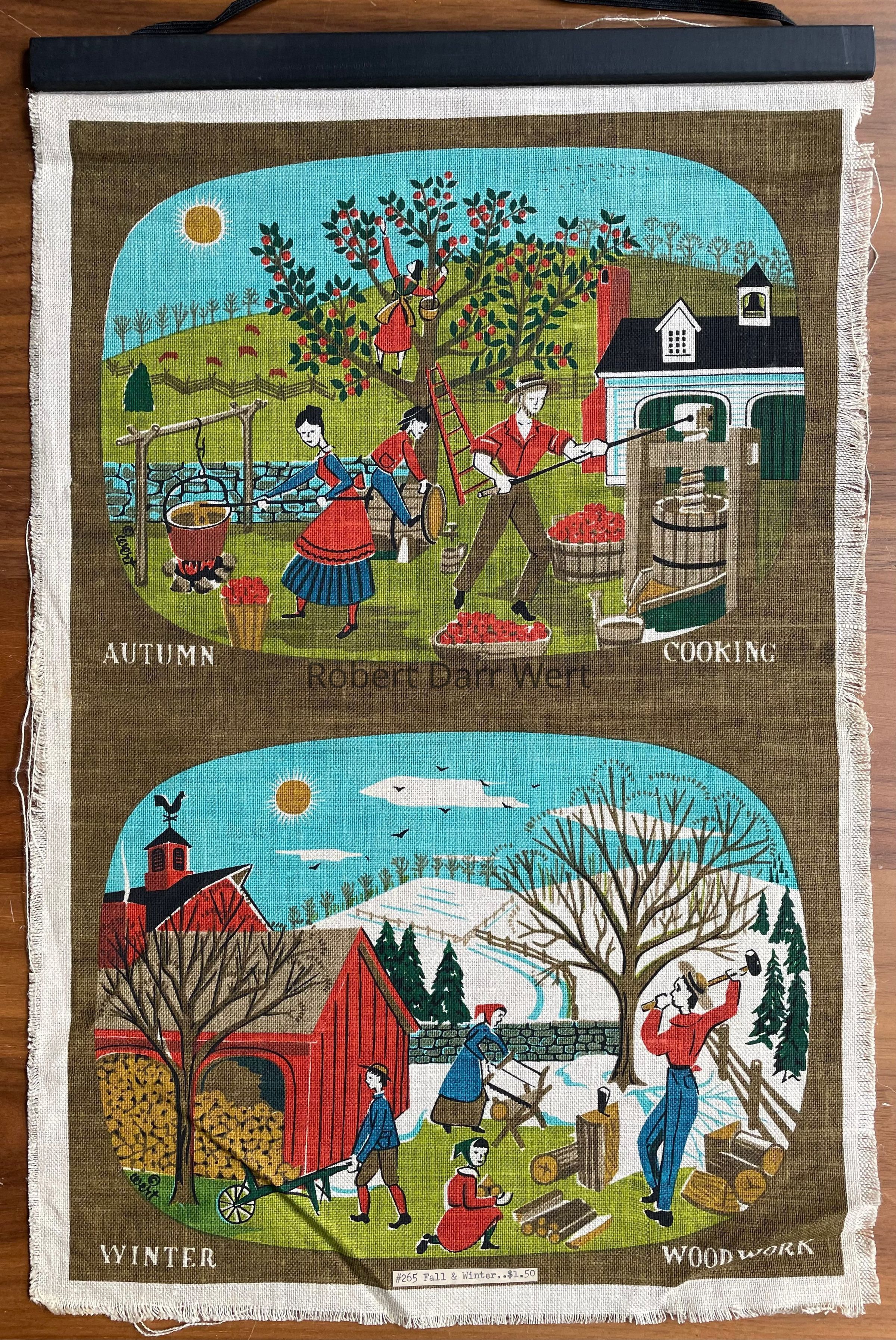 A wallhanging with an eight-color silkscreen print on white linen depicting fall and winter activities on an early American farm. This wallhanging is a pair with Spring & Summer 264. All four seasons were also produced as a set of four framed prints.