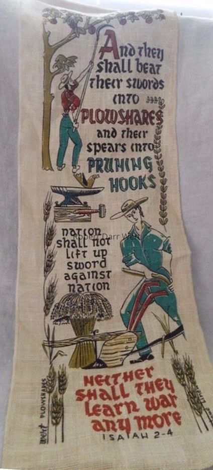 A Plowshares wallhanging with a three-color silkscreen print on natural linen depicting two farmers using wrought iron tools for harvesting apples and plowing furrows. A bird rests upon a blacksmith’s anvil and hammer. Amongst these elements appears the Bible verse Isaiah 2-4. An apple tree, a trailing vine and wheat stalks act as border elements. This print has been documented printed in three colors and four colors.