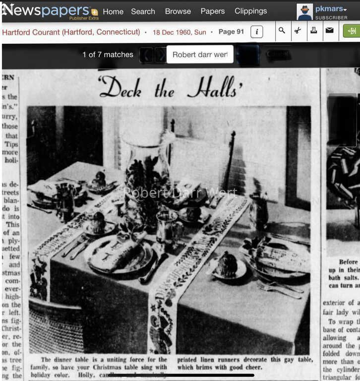 The “Deck the Halls” placemat was used as a napkin in a Hartford Courant editorial about holiday table settings, December 18, 1960; see images.