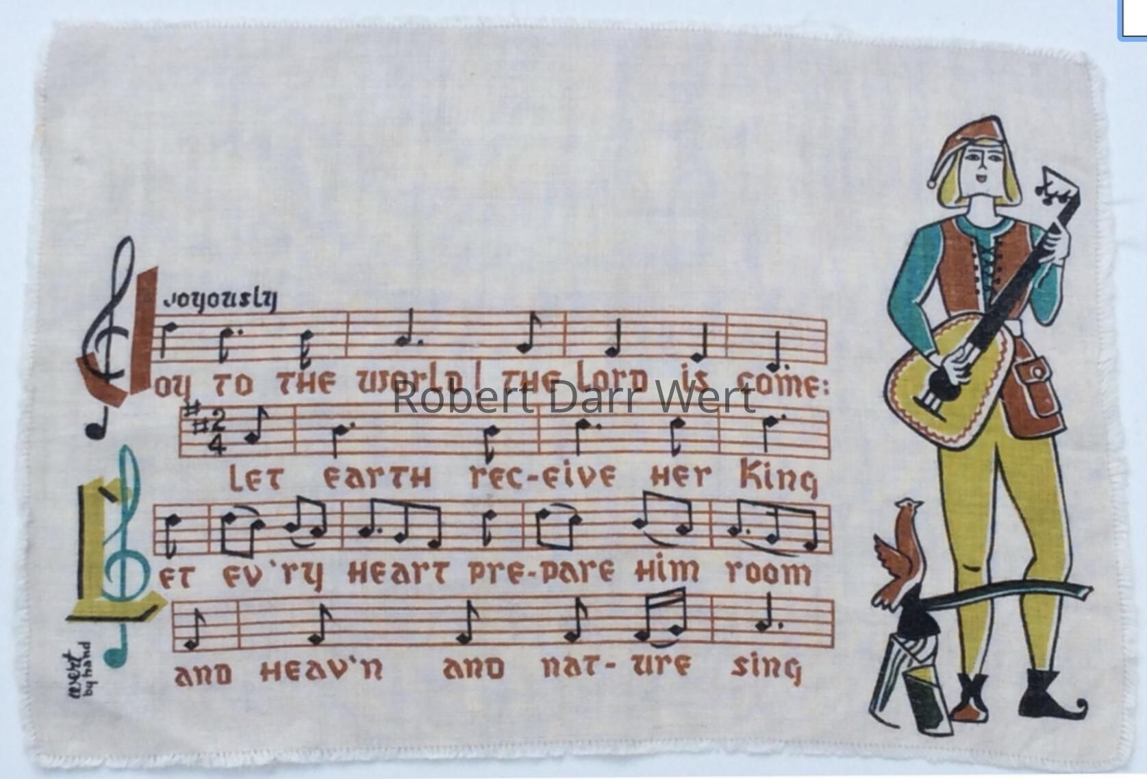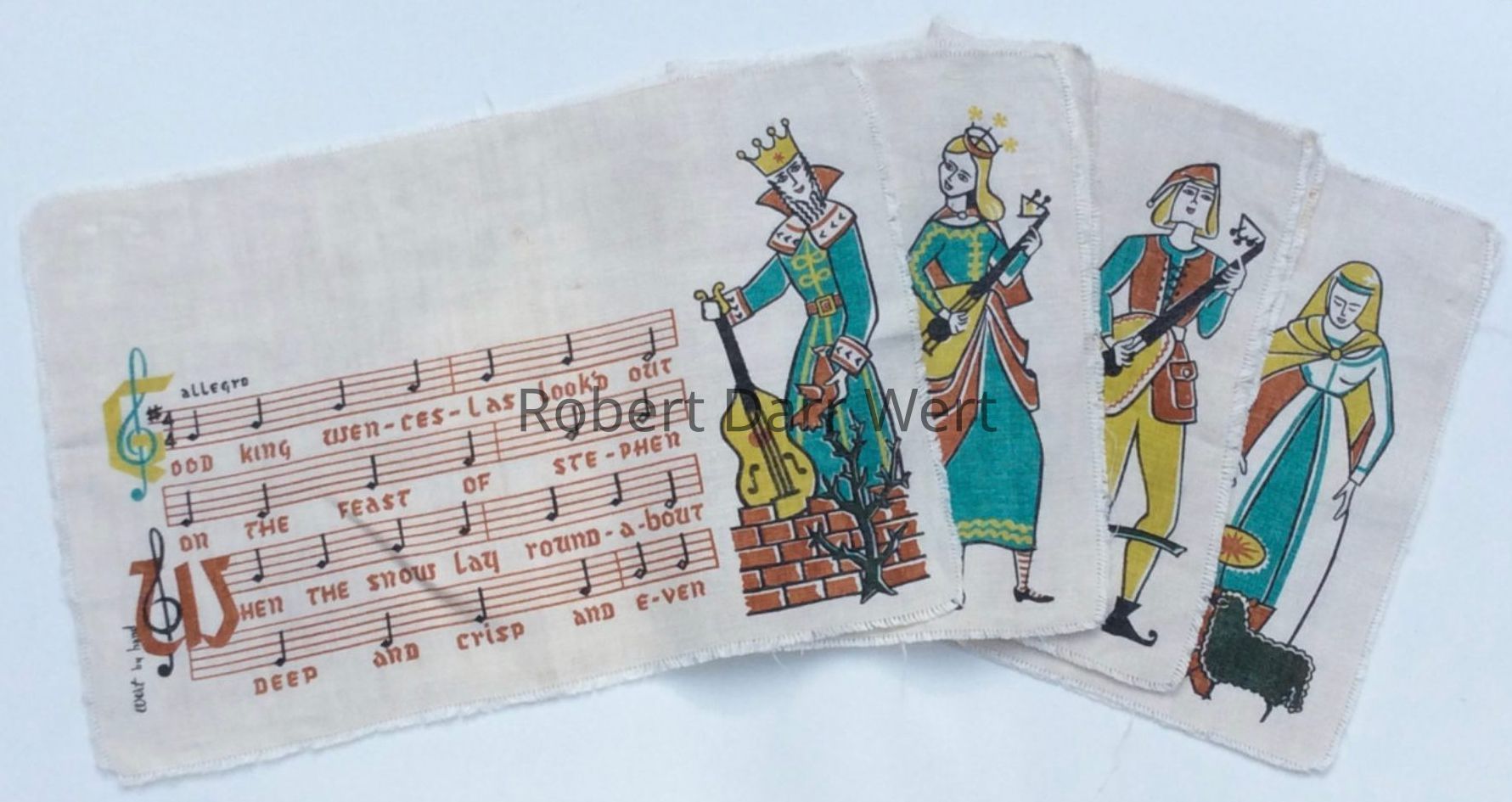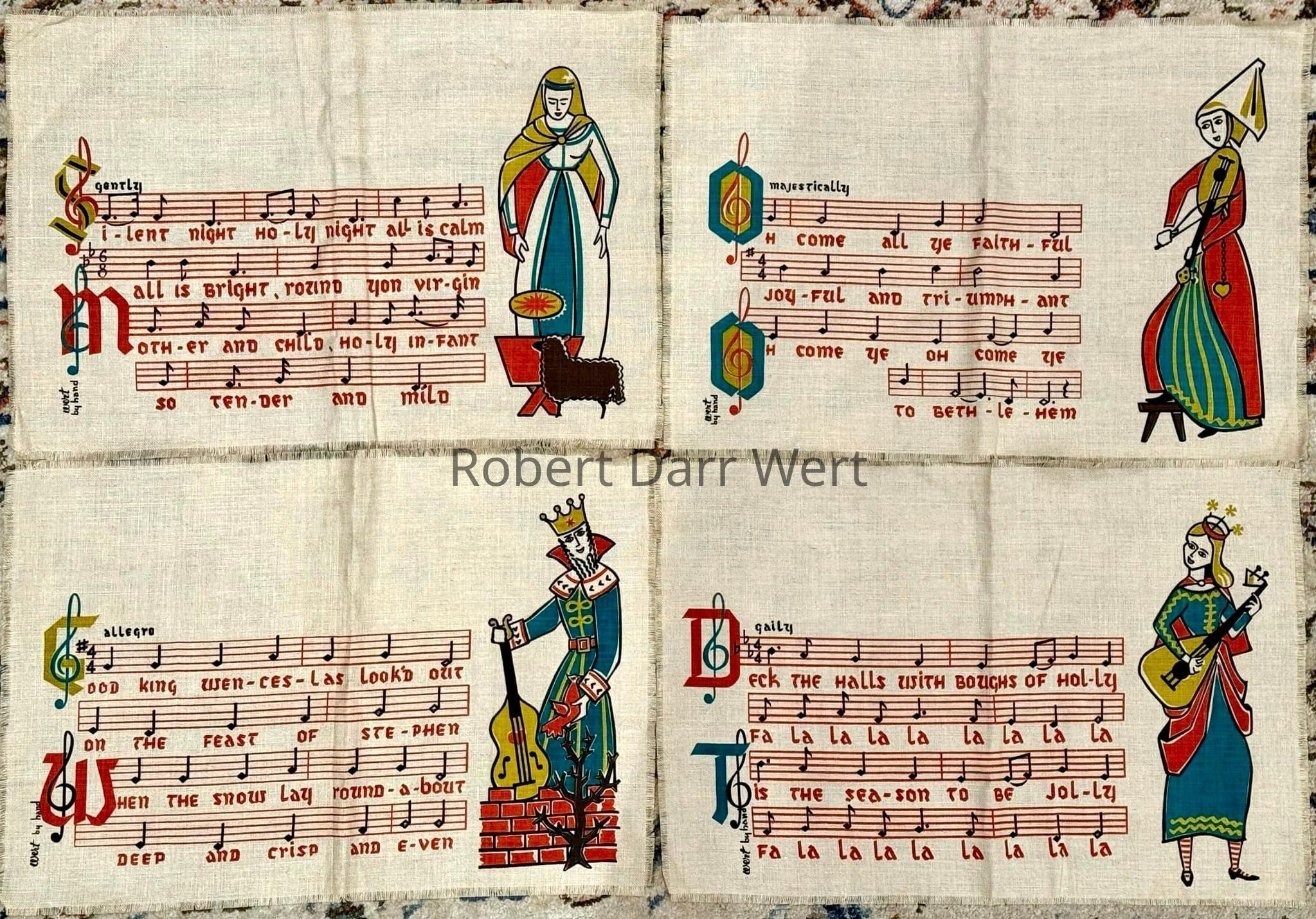 A placemat set of six designs (five documented). Each four-color silkscreen print is on an off-white linen placemat. Each placemat depicts a different Christmas carol, with four bars of music and a character/musician in ancient dress related to the song. The carols represented: