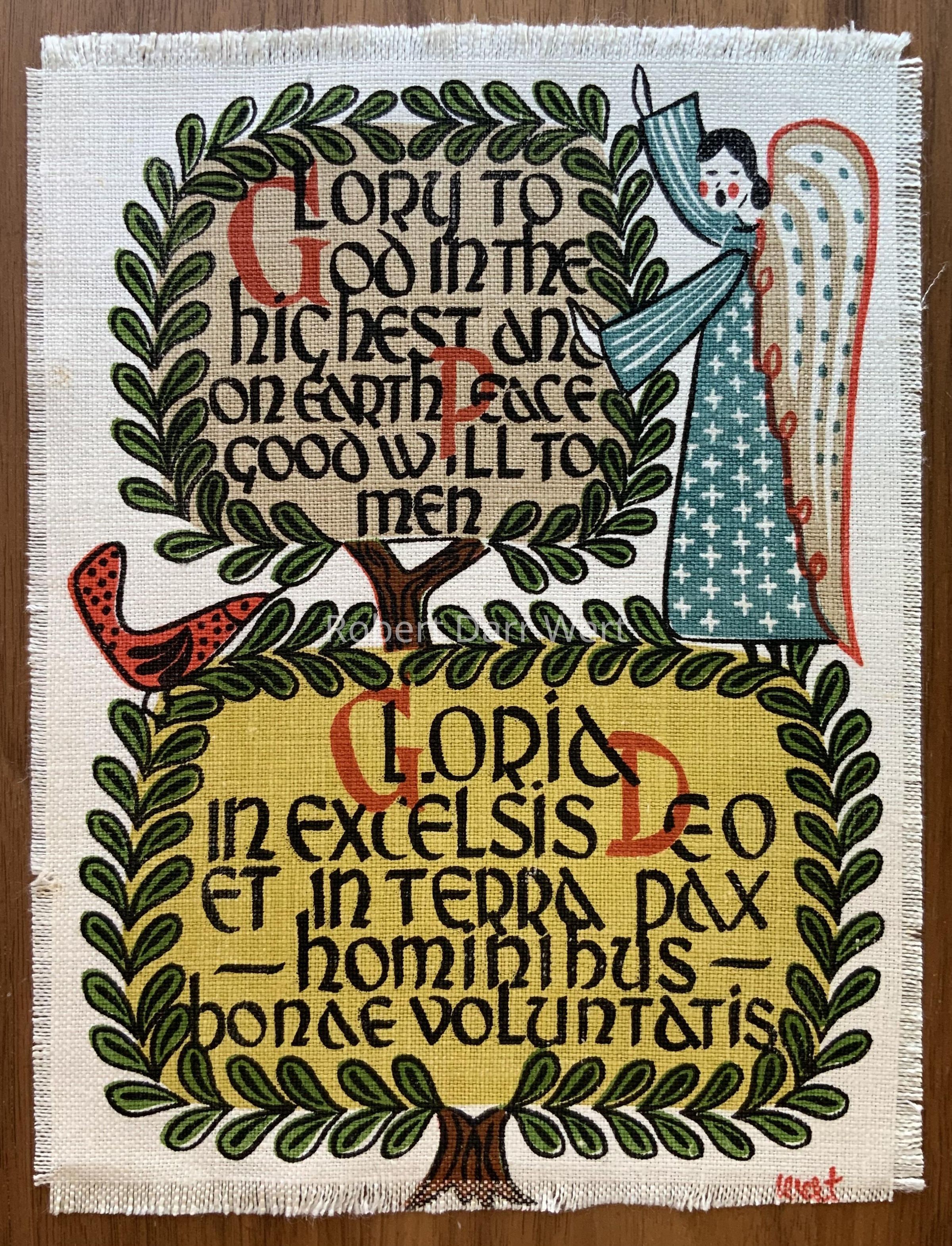 A five-screen/six-color silkscreen print on off-white linen depicting a singing angel alongside a two-tiered topiary, the branches of which frame the verse Luke 2:14 from the King James Bible in english and latin, “Glory to God in the highest and on earth Peace, Good will to men”, and, “Gloria in excelsis Deo et in terra pax - hominibus - bonae voluntatis”; see web link.