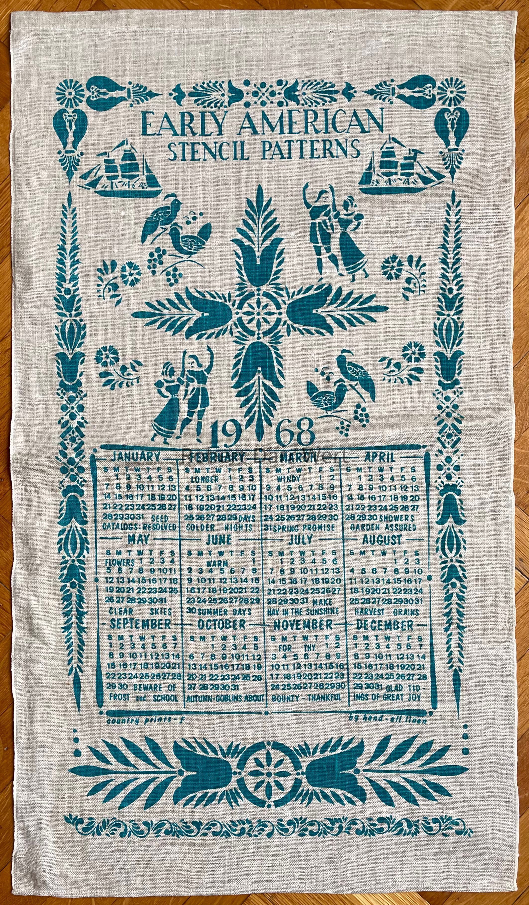 A calendar towel featuring designs inspired by early American stencil patterns. The artwork was developed by an unidentified freelance artist hired by Country Prints after Wert’s death in January 1966. It is signed with the initial F.