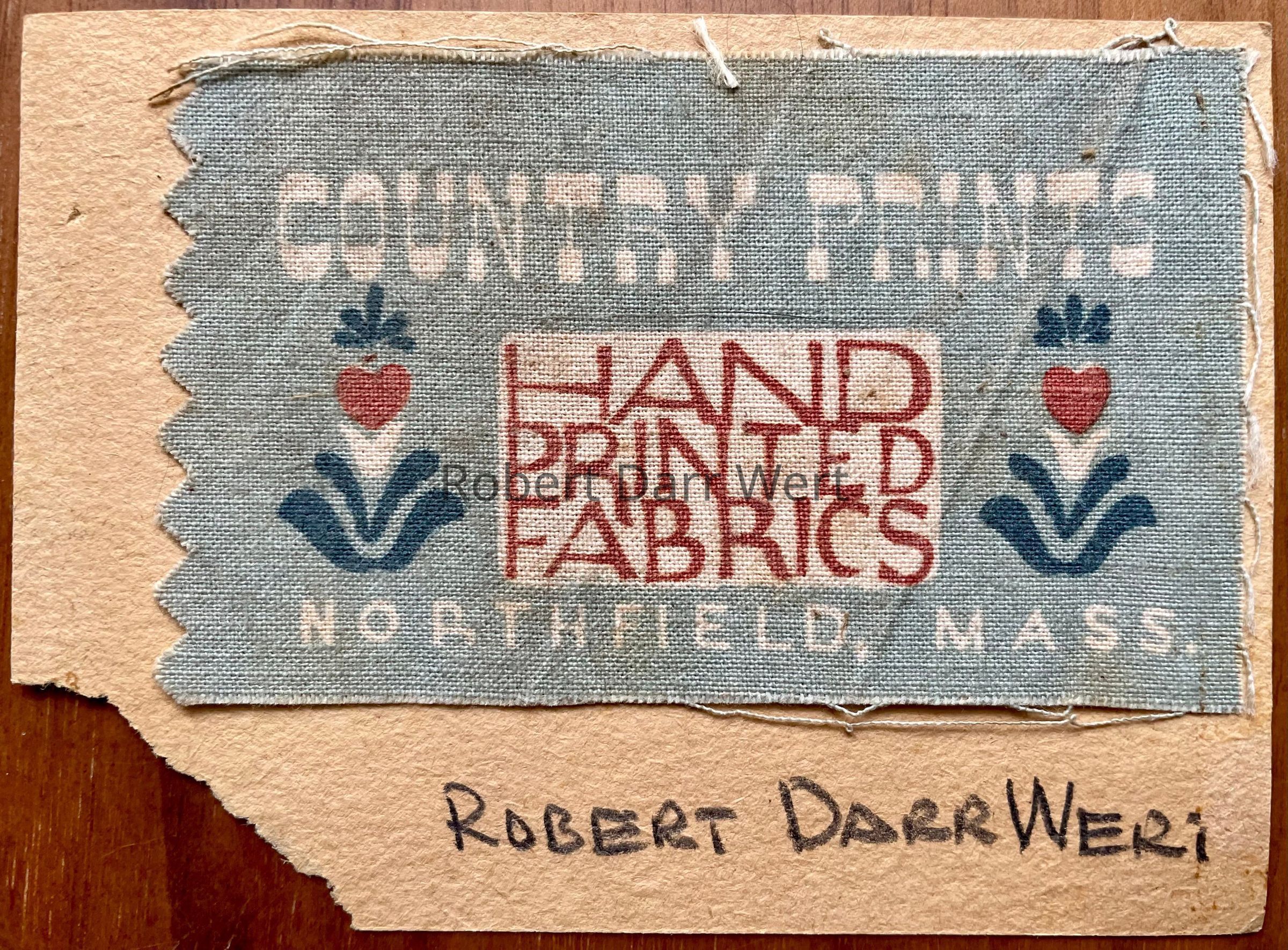 A Country Prints business card/promo piece with a three-color silkscreen print on lightweight linen or cotton crash with the text, “Country Prints Hand Printed Fabrics, Northfield, Mass.” The fabric print omits Werts name, but is glued to a sheet of heavyweight paper bearing his name written in pencil.Made/Created