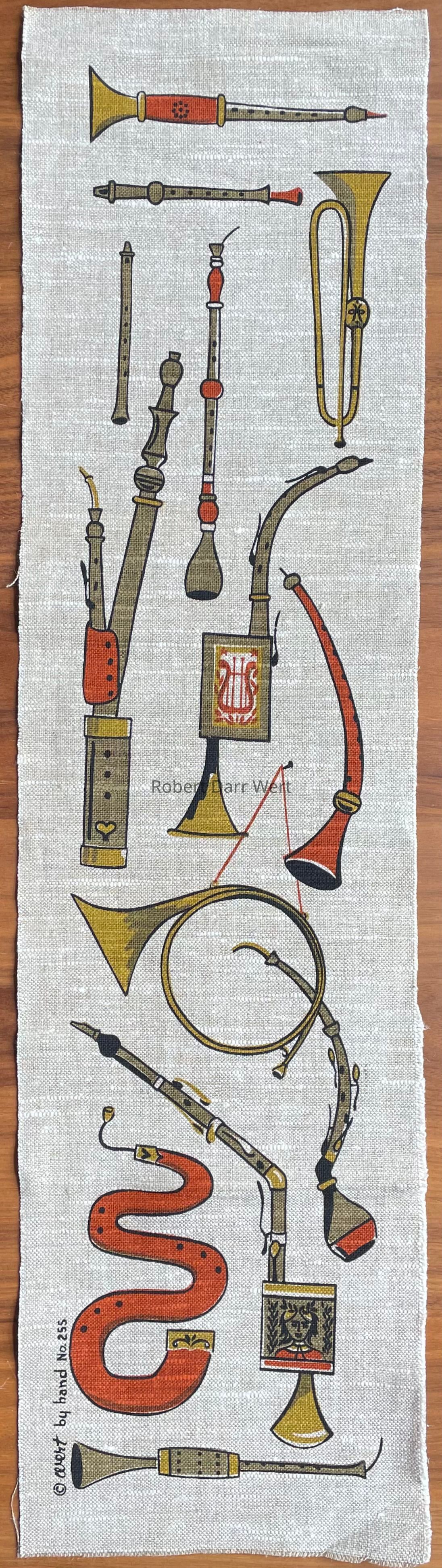 A four-color silkscreen print on natural linen depicting early woodwind and brass instruments.