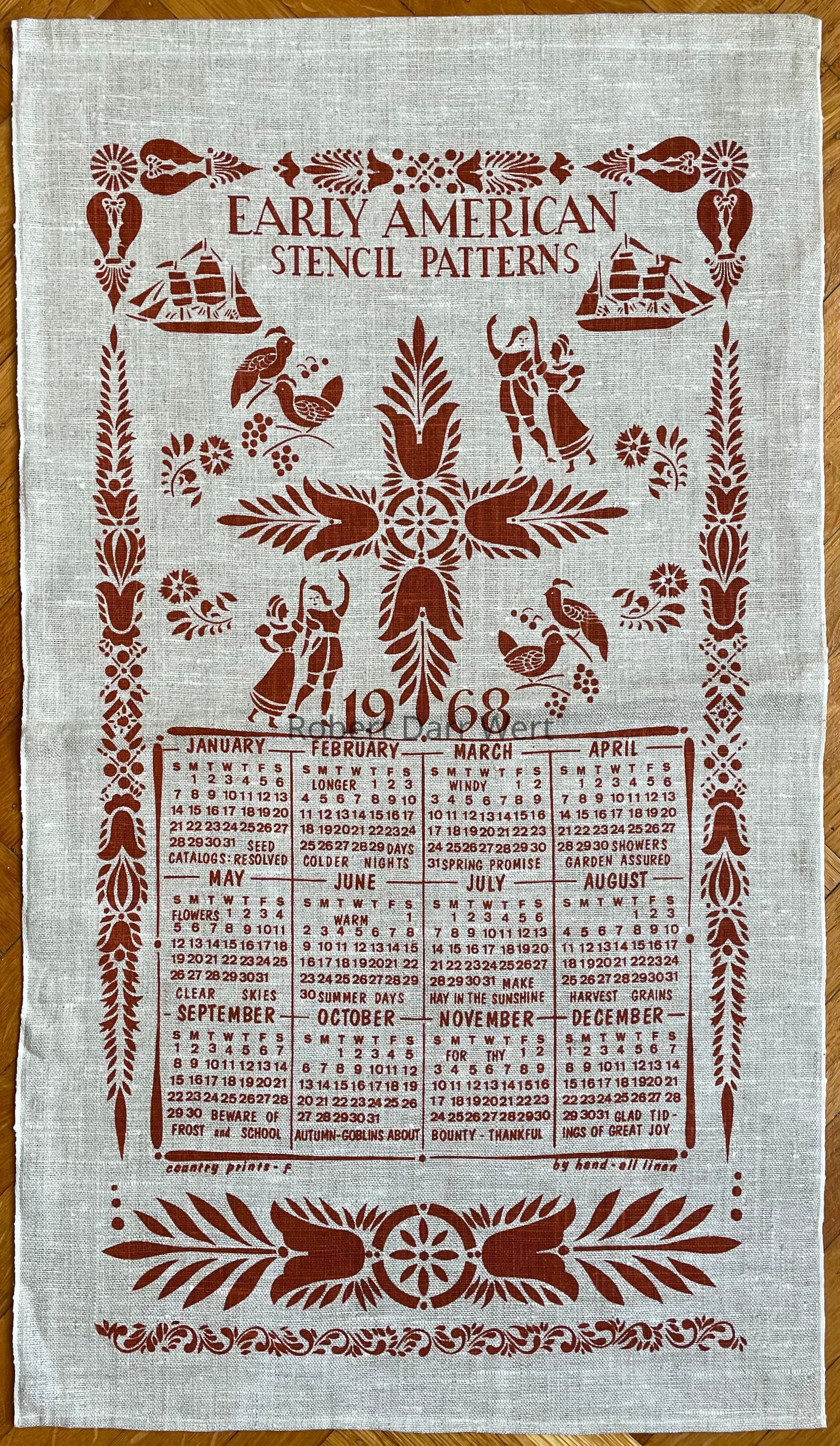 A calendar towel featuring designs inspired by early American stencil patterns. The artwork was developed by an unidentified freelance artist hired by Country Prints after Wert’s death in January 1966. It is signed with the initial F.