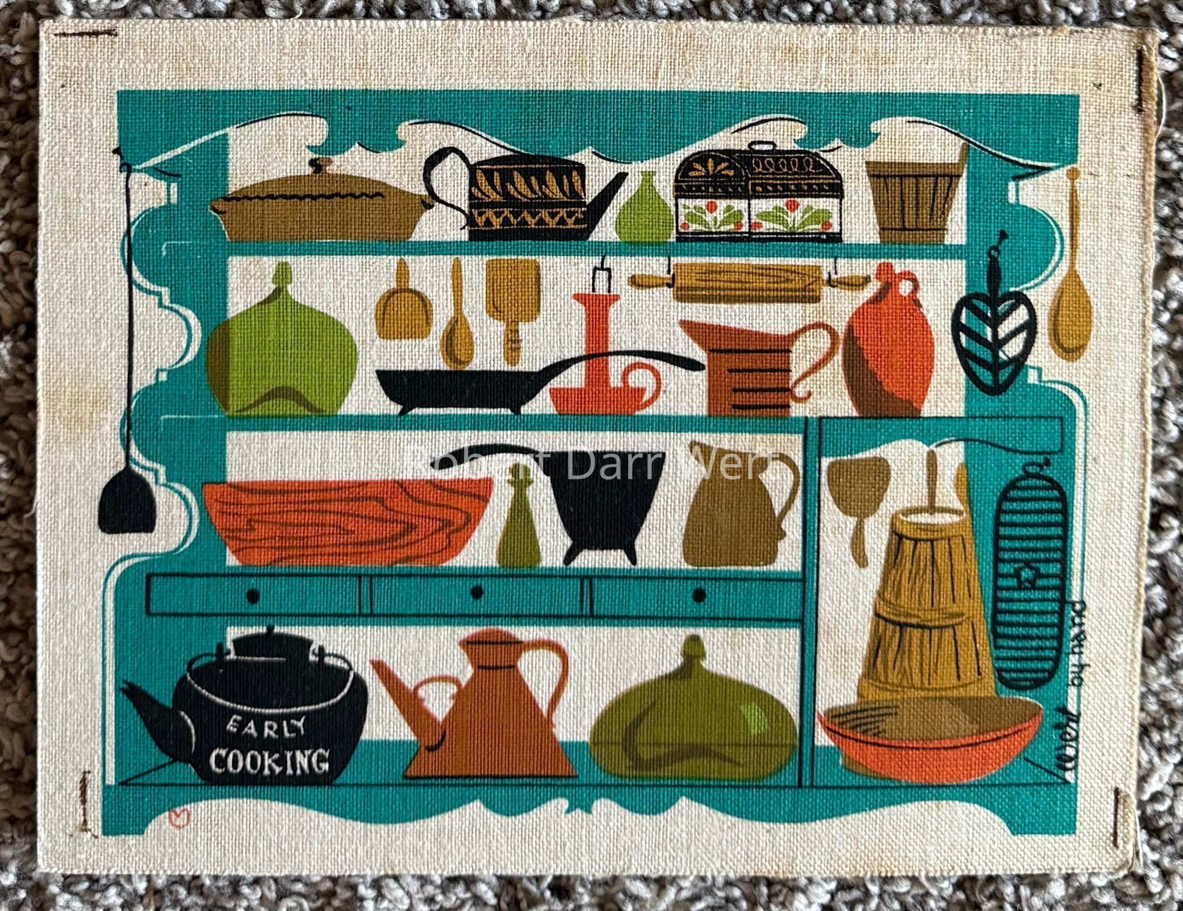 A seven-color silkscreen print on off-white linen depicting a painted hutch filled with items necessary to a well equipped early American kitchen. Items of hand blown glass, wooden ware, painted tin, cast iron, wrought iron and copper are represented.