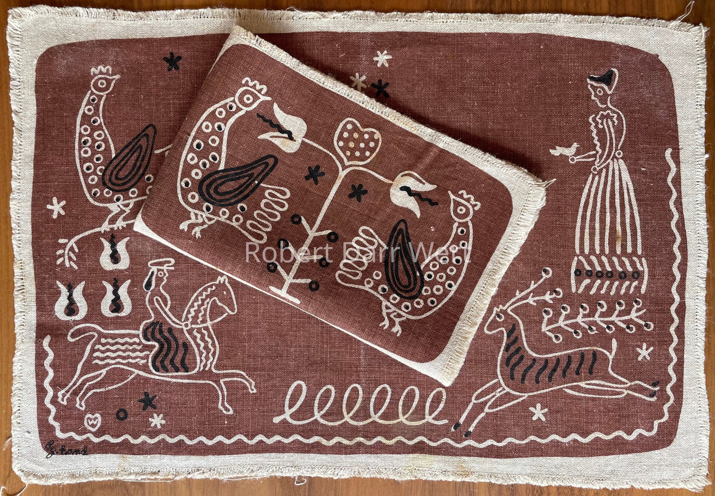 This set appears in a c.1955 Country Prints price list. The price list states, “To match exactly slip decorated pottery or to complement many lines of contemporary table ware. Red, Brown, Clay, Yellow or Green. All earth-like colors on natural linen — printed napkins to match.”