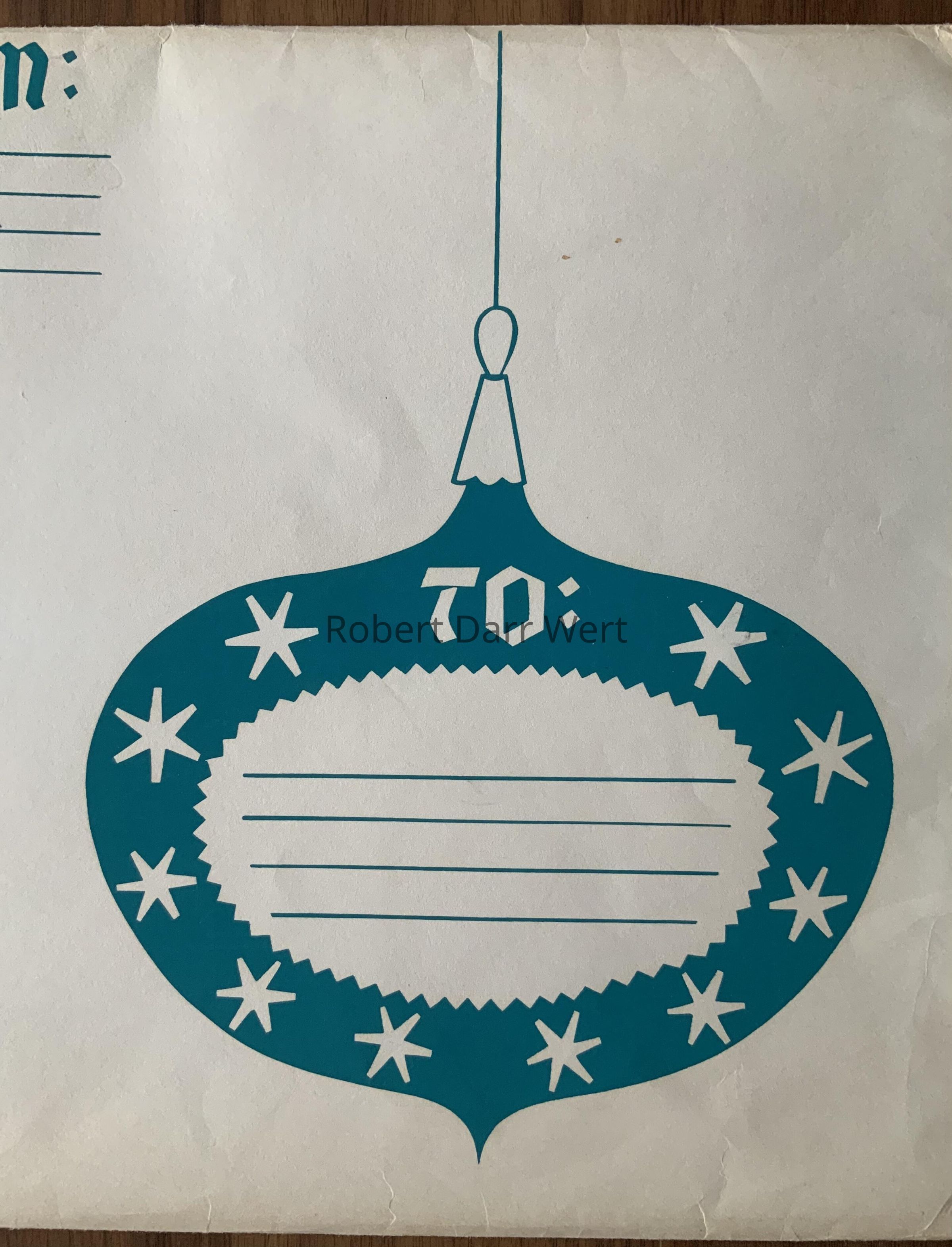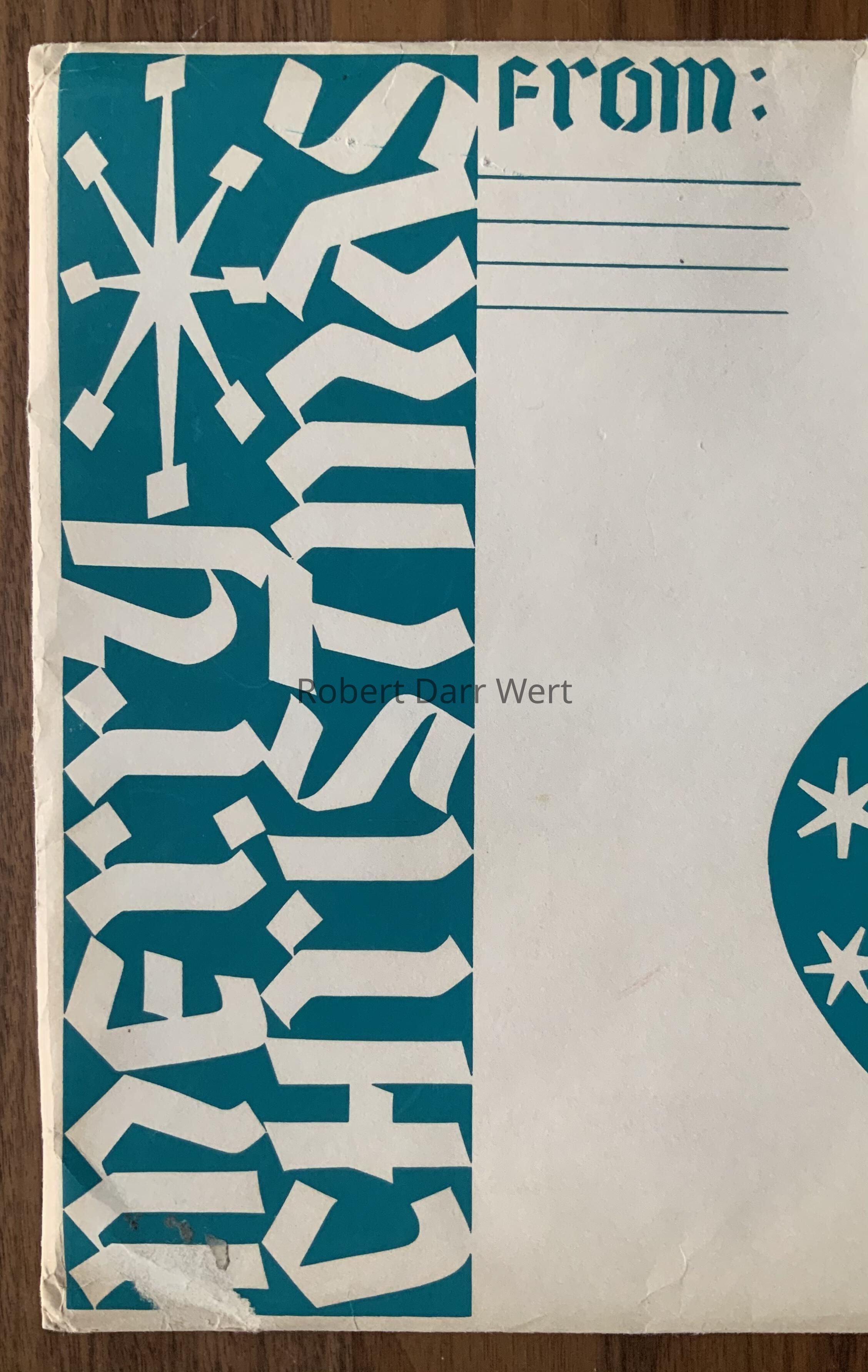 A Country Prints shipping envelope in white with a one-color silkscreen print in blue. This envelope was used by Country Prints for shipping holiday orders in the 1960’s.
