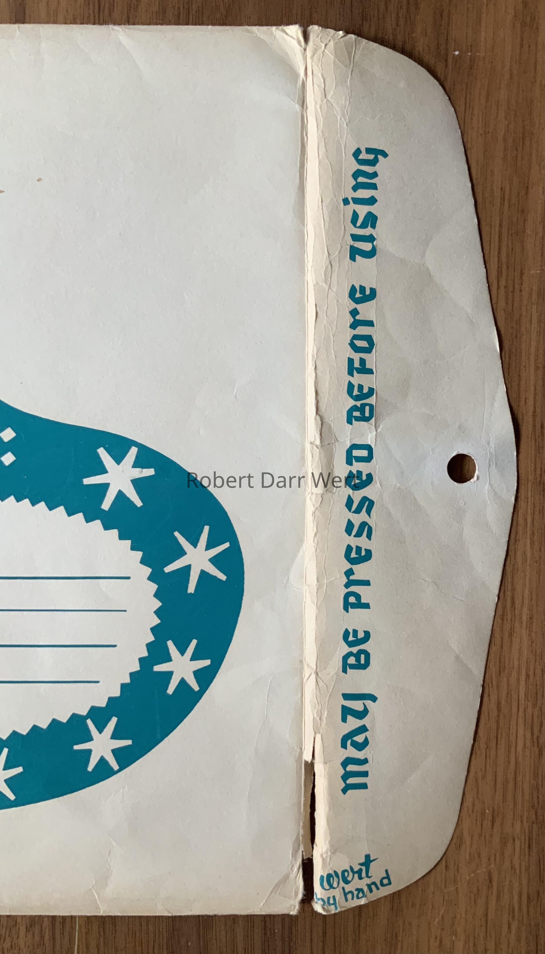 Along with “wert by hand” the flap of the envelope advises, “may be pressed before using”.Made/Created