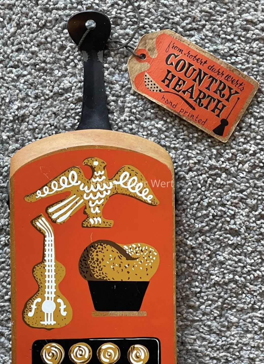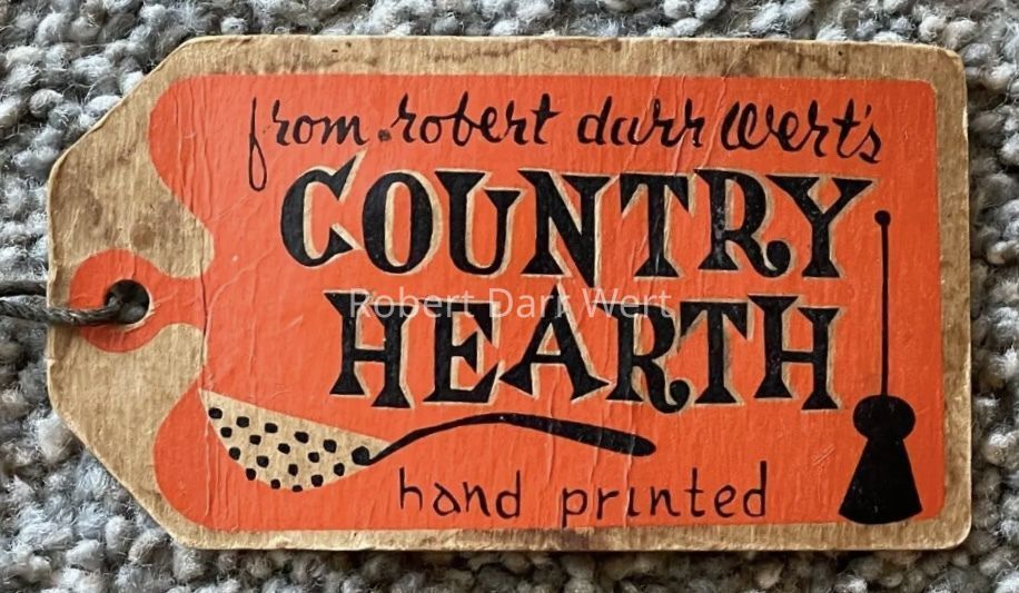 A product tag with a two-color silkscreen print on brown single-ply cardboard for Country Print’s line “Country Hearth” line of breadboards.Made/Created