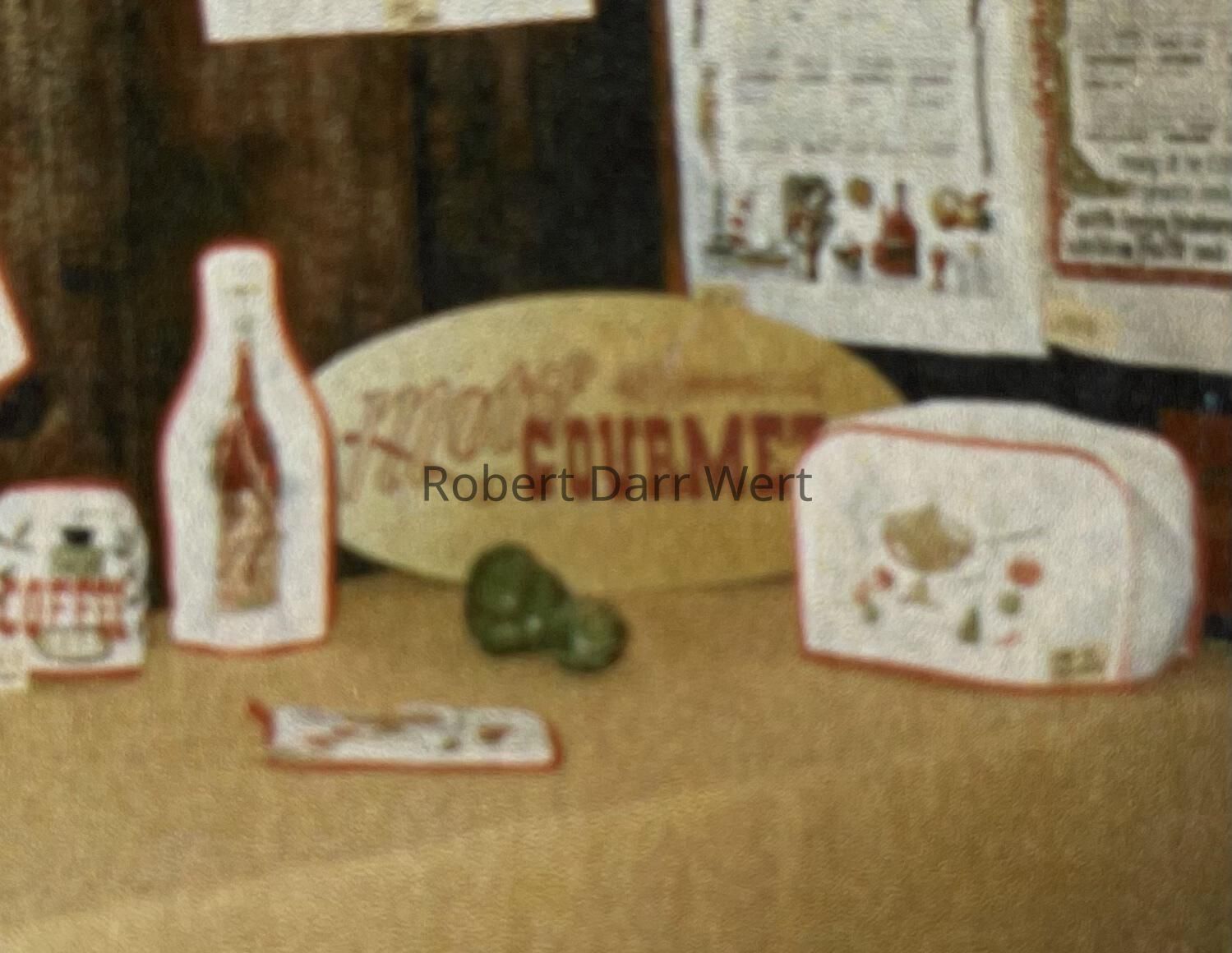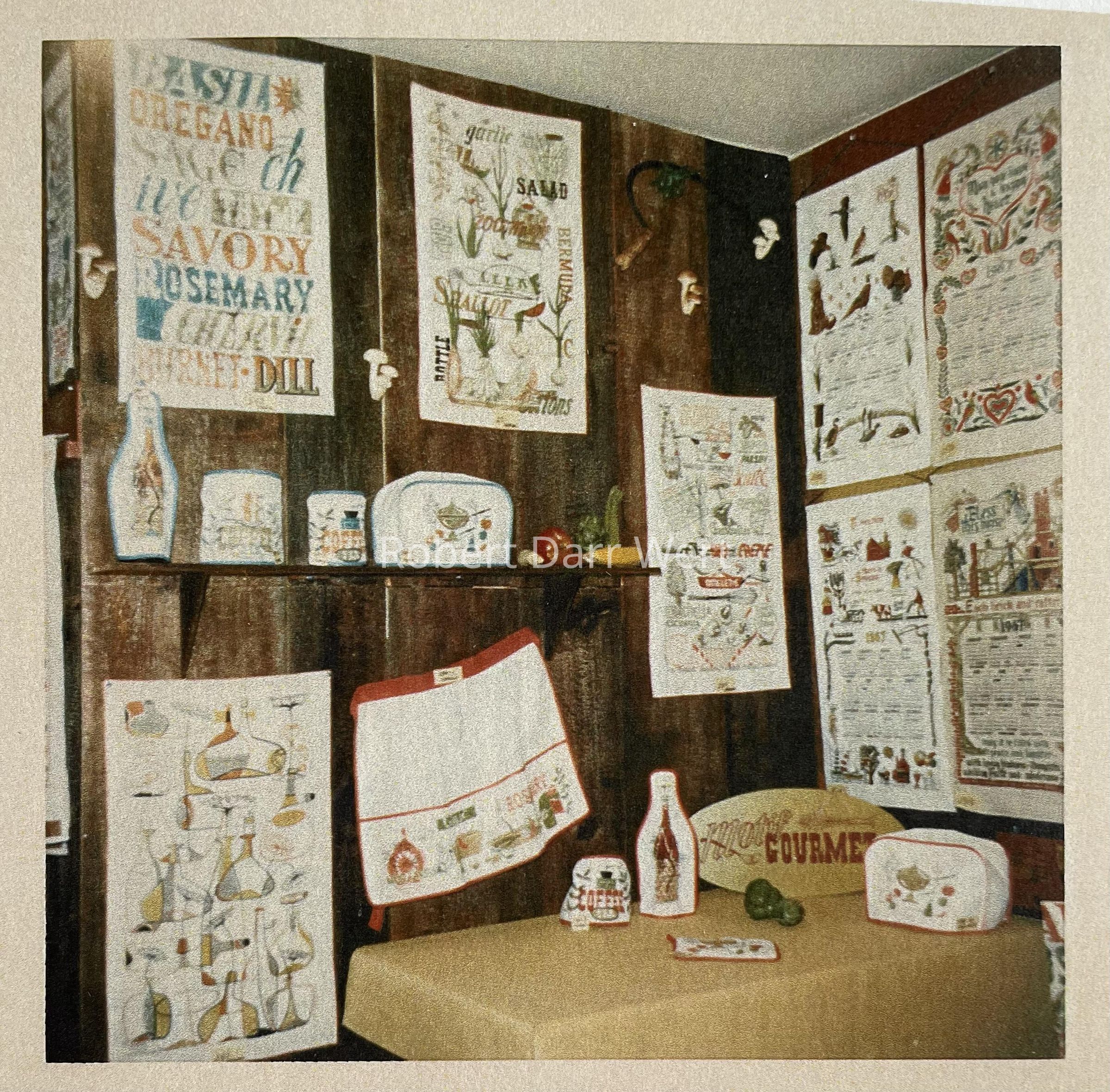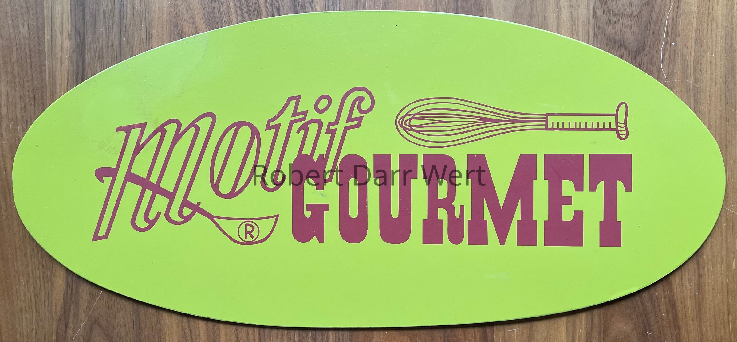 A sign for Country Prints’ Motif Gourmet line of kitchen soft goods, which included pot holders, oven mitts, toaster covers, wine bottle covers, coffee can covers, aprons, and dish towels. The sign is silkscreen printed in one color on green painted masonite.Made/Created