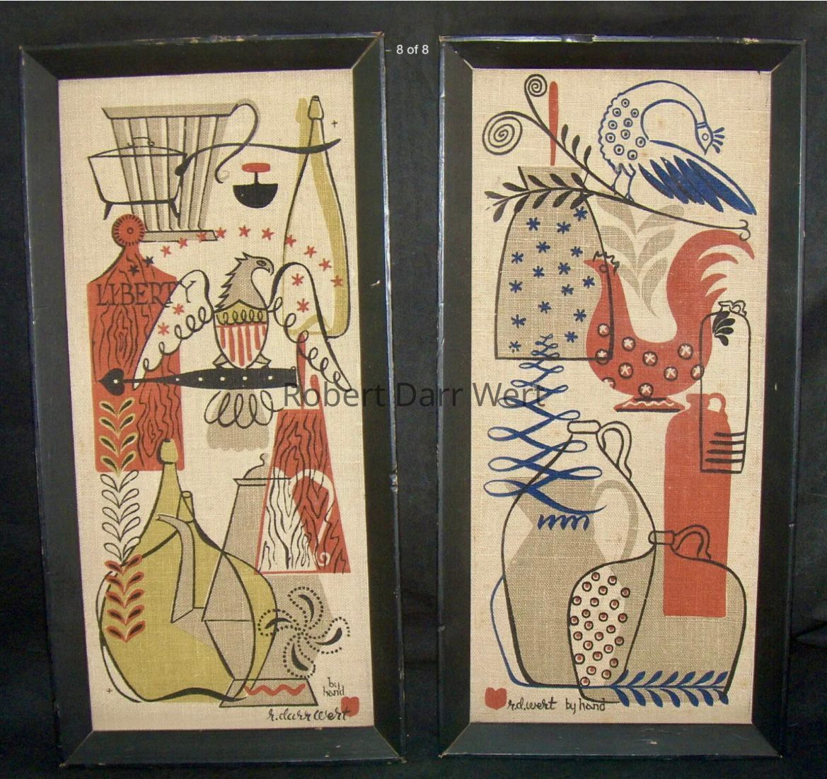 This print appears in the c.1955 brochure “Country Prints In Frames” and a c.1955 price list as “Jugs 715-1”, and is paired with “Doodles 715-2”. A later re-colored version with a printed border appears in the c.1960 brochure “Country Prints in Frames by Robert Darr Wert as “Jugs 916-2”; see images.