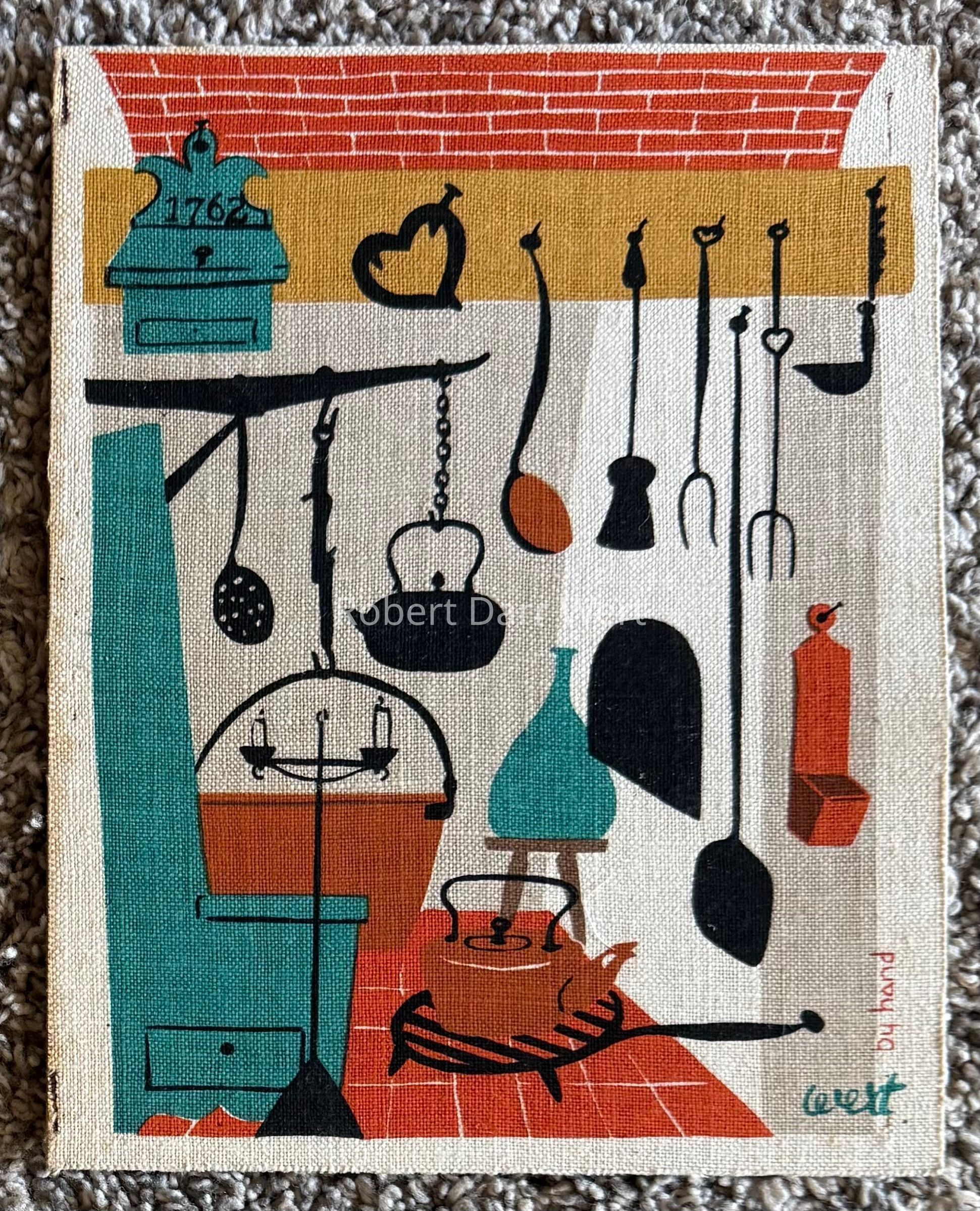 A five-screen/six-color silkscreen print on off-white linen depicting an early American kitchen fireplace hung with a multitude of cast and wrought iron cooking tools. The scene includes a fireplace crane, a copper pot and copper tea kettle, a glass demijohn, a candle stand, a matchbox and a painted settle.