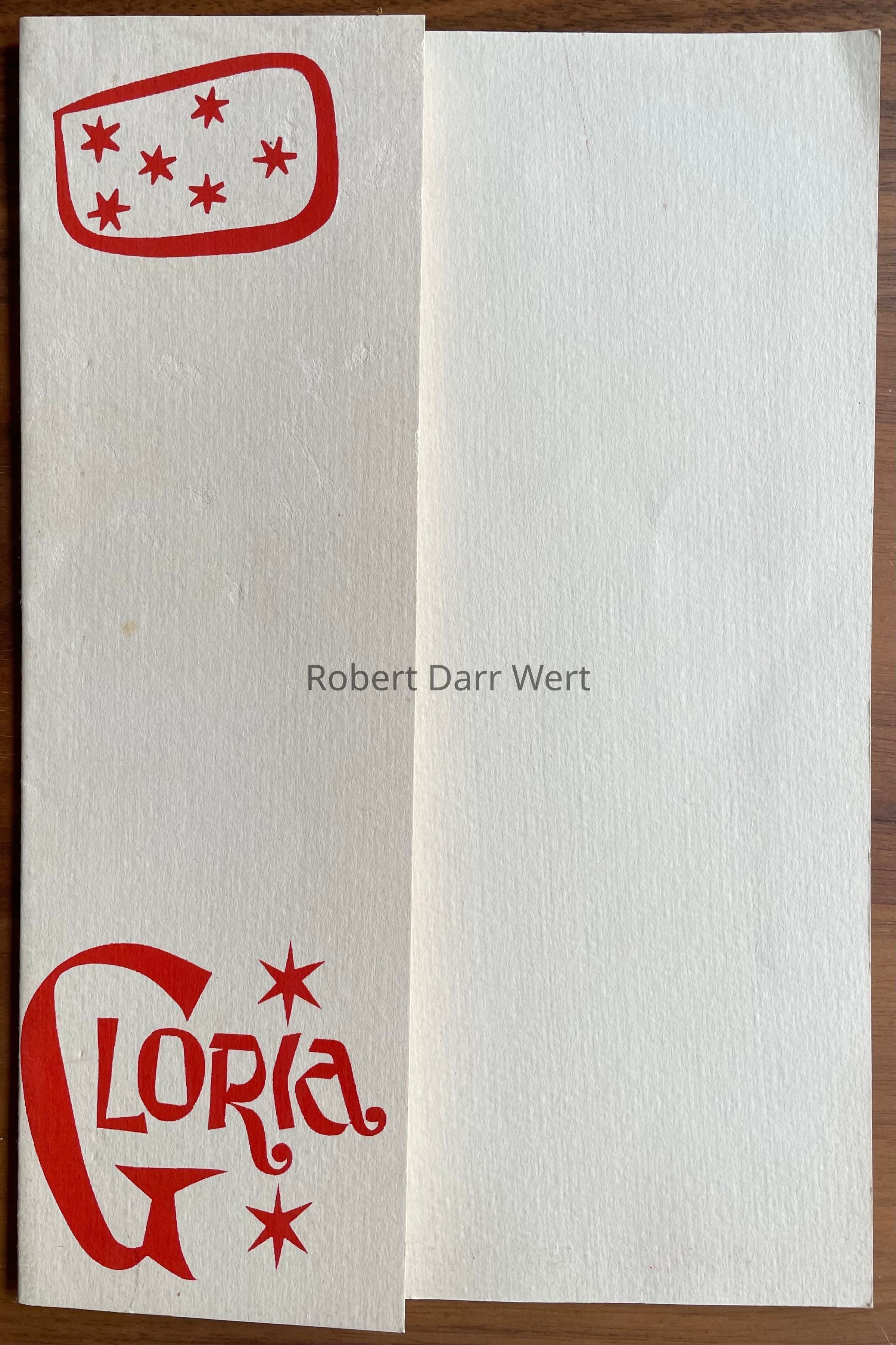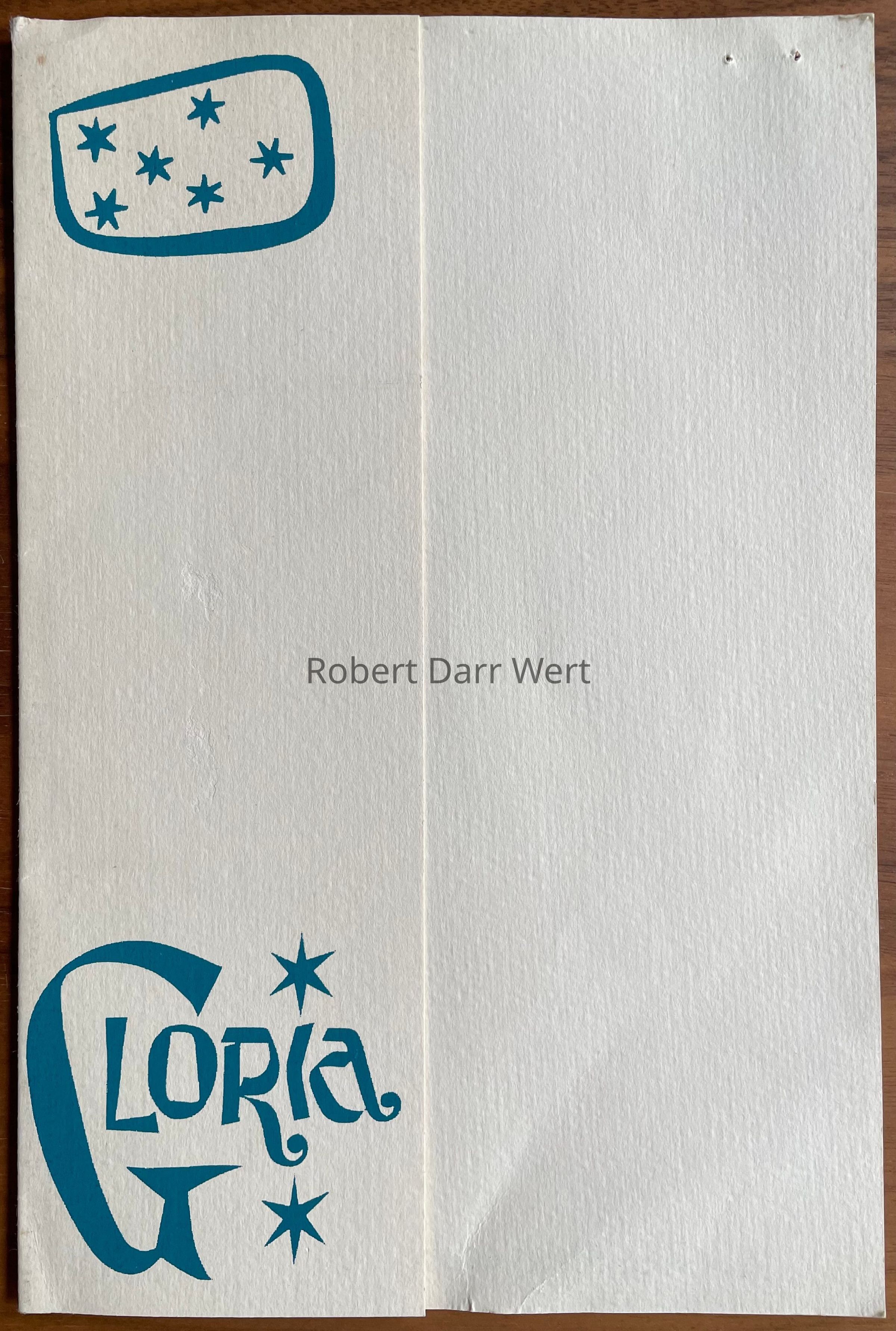 A Christmas Gift Greeting note folder with a one color silkscreen print on folded cardstock featuring the word, “Gloria”, at lower left and a floating cluster of stars above. On reverse is Wert’s signature and tag line. Used by Country Prints in the 1960’s.Made/Created