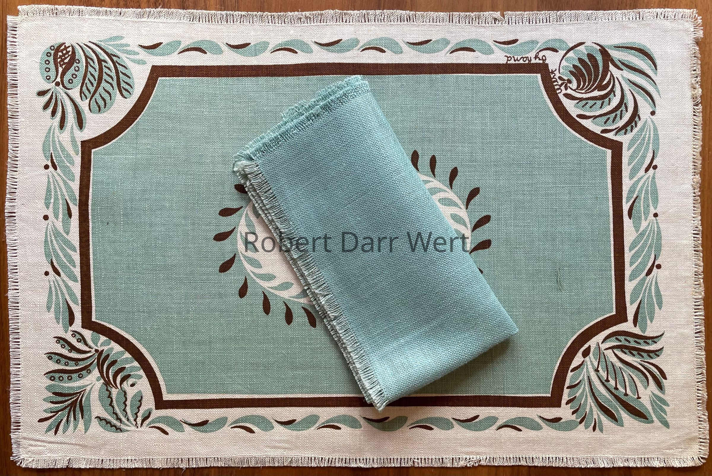 A placemat with a two-color silkscreen print on white linen depicting plant life and borders rendered in the manner of painted tin or toleware. It was produced in at least three colorways: yellow, aqua, or pink.