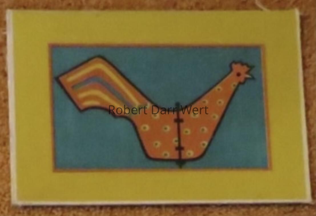 A four-color silkscreen print on off-white linen depicting a stylized interpretation of an early American rooster weathervane.Made/Created