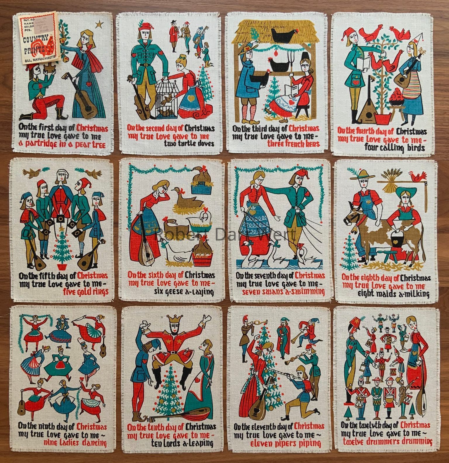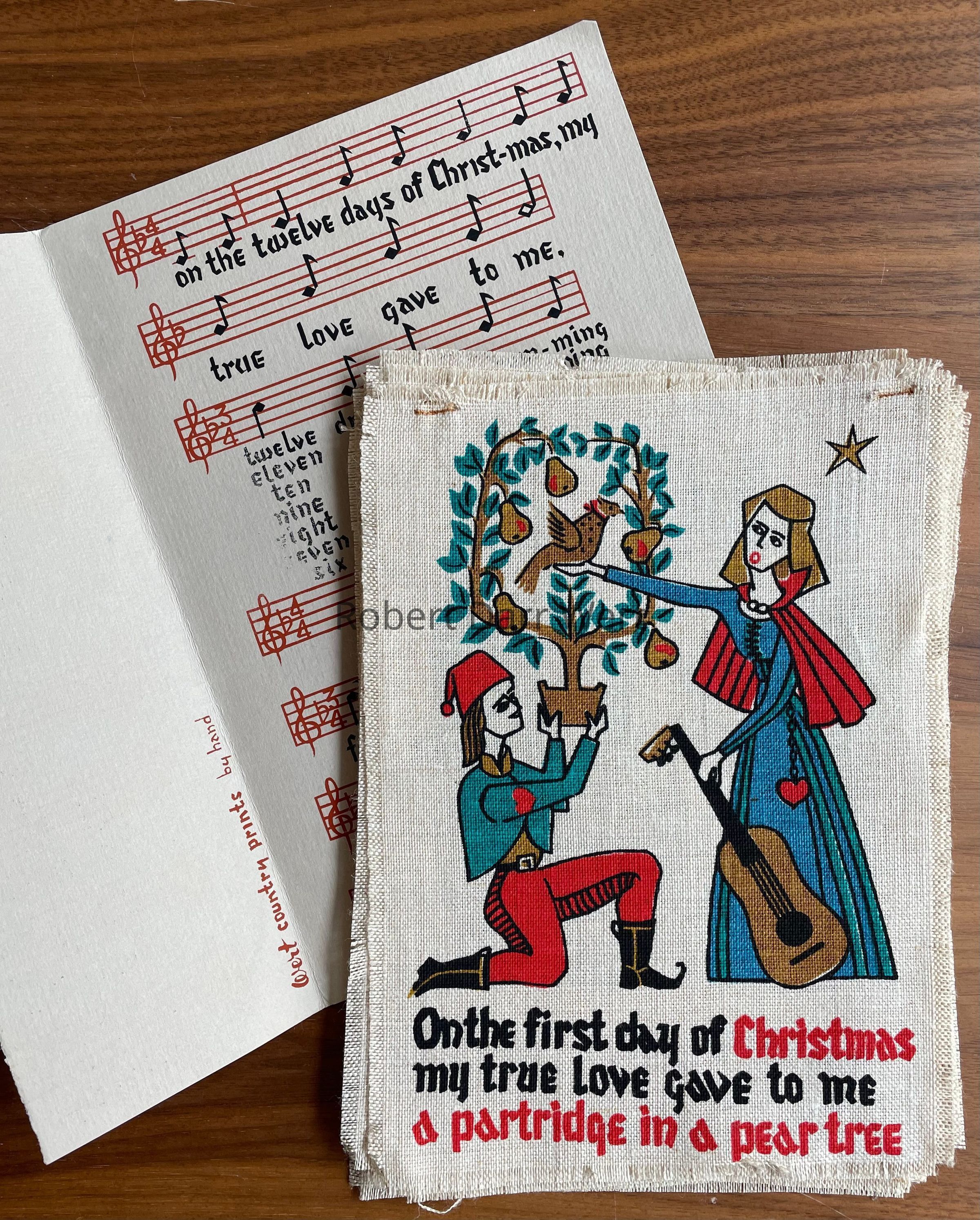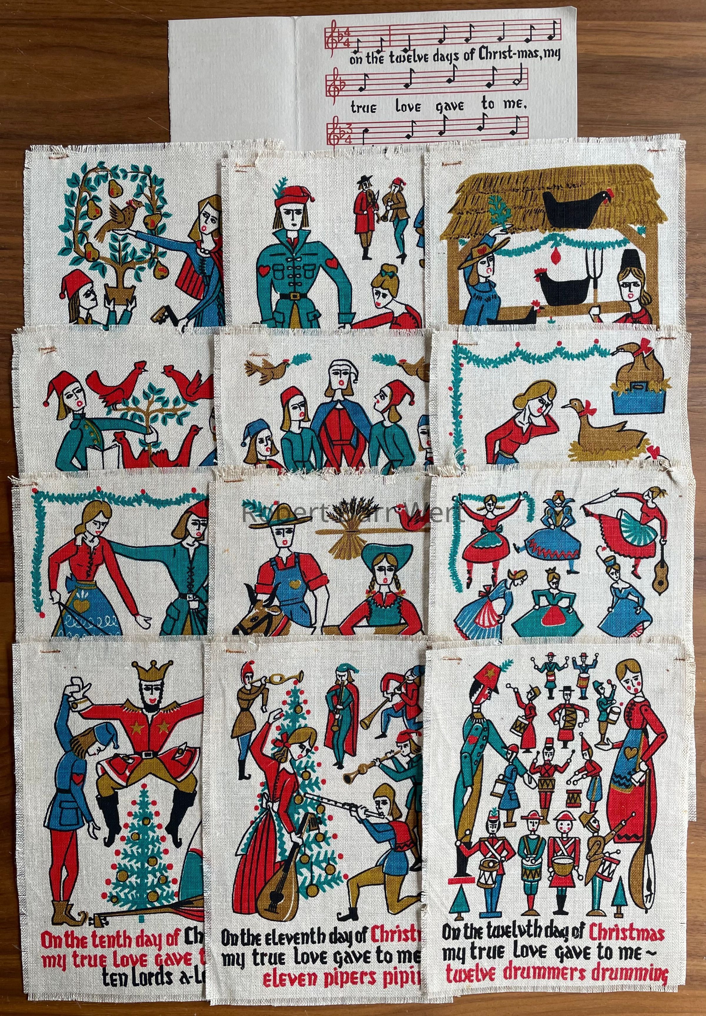 A Gift Greeting set of twelve five-color silkscreen prints on natural linen depicting a scene for each verse of the traditional Christmas carol, The Twelve Days of Christmas.