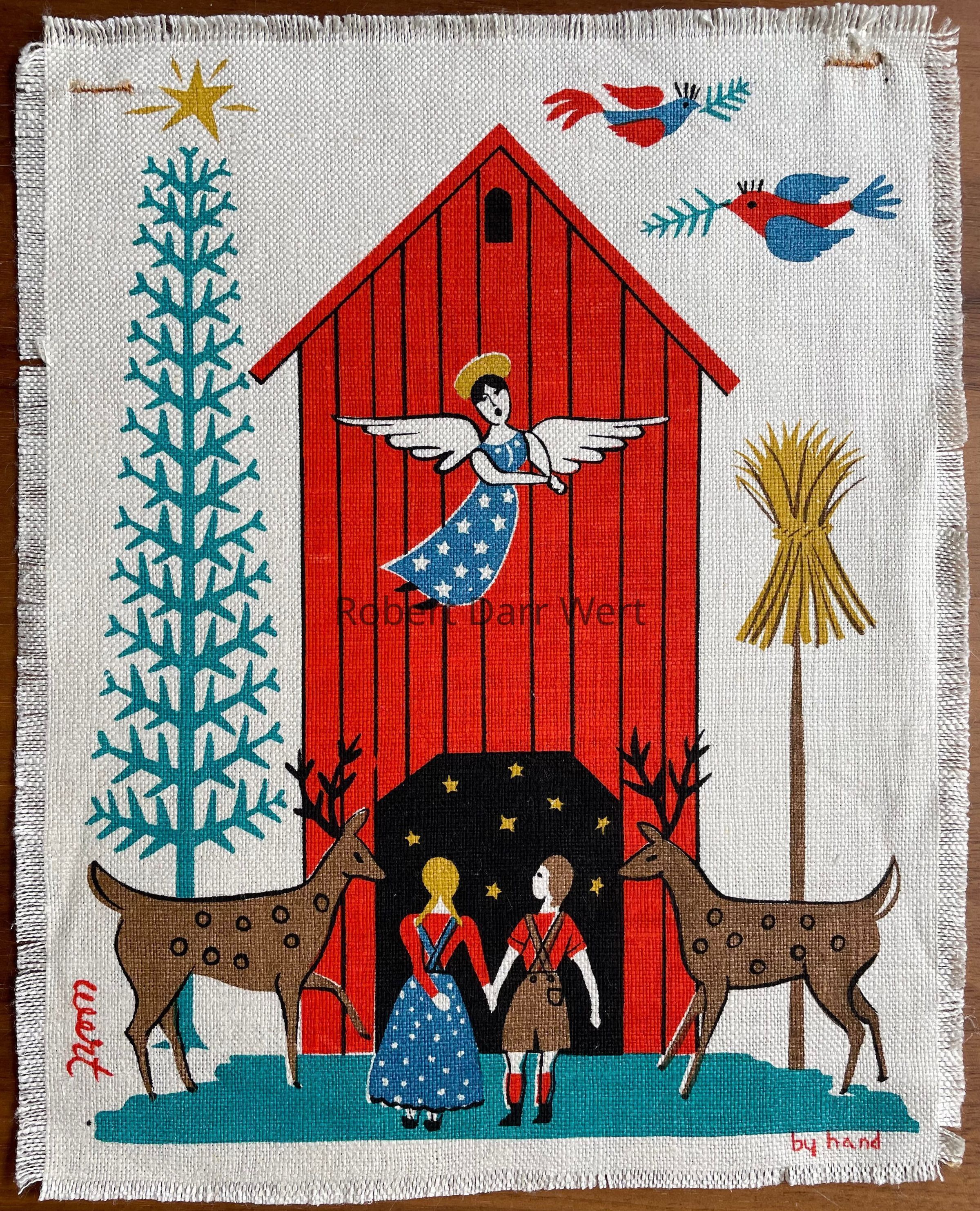 The shock of wheat on the tall pole is a julenek, a treat put out for the birds at Christmas; see web link. A folk belief is that the more birds come to eat, the better next year’s crop will be. The julenek has come to symbolize generosity. Below are two reindeer, native to Norway, with a pair of children standing before a barn-like structure holding hands. Above is a singing angel. At left, a tall evergreen is capped with a yellow five-point star. At right, two birds fly holding evergreen branches, a symbol of the hope of spring.