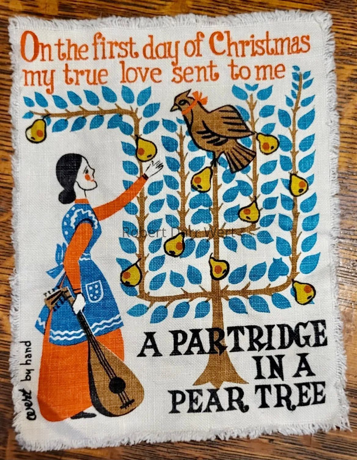 A six-color silkscreen print on off-white linen depicting the “First Day” scene from the traditional Christmas song, “The Twelve Days of Christmas”; see web link for song history.