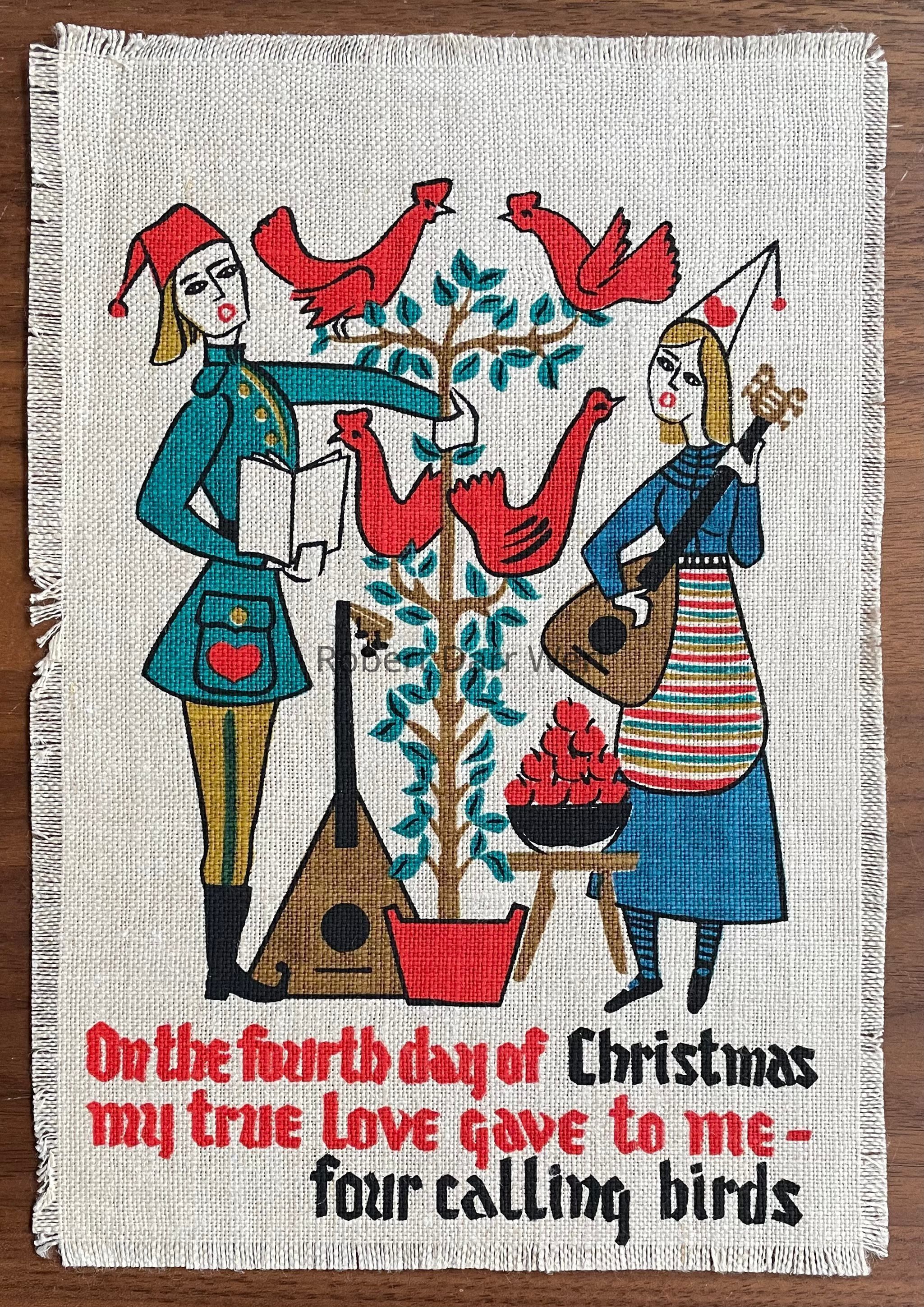 A six-color silkscreen print on off-white linen depicting the fourth day of Christmas, from the traditional Christmas carol “The Twelve Days of Christmas”; see web link for song history. In the scene, a couple sings on either side of a potted sapling, within which sit four calling birds. The couple are in medieval dress, the woman plays a lute, and the man holds an open songbook in one hand while grasping the tree with the other.