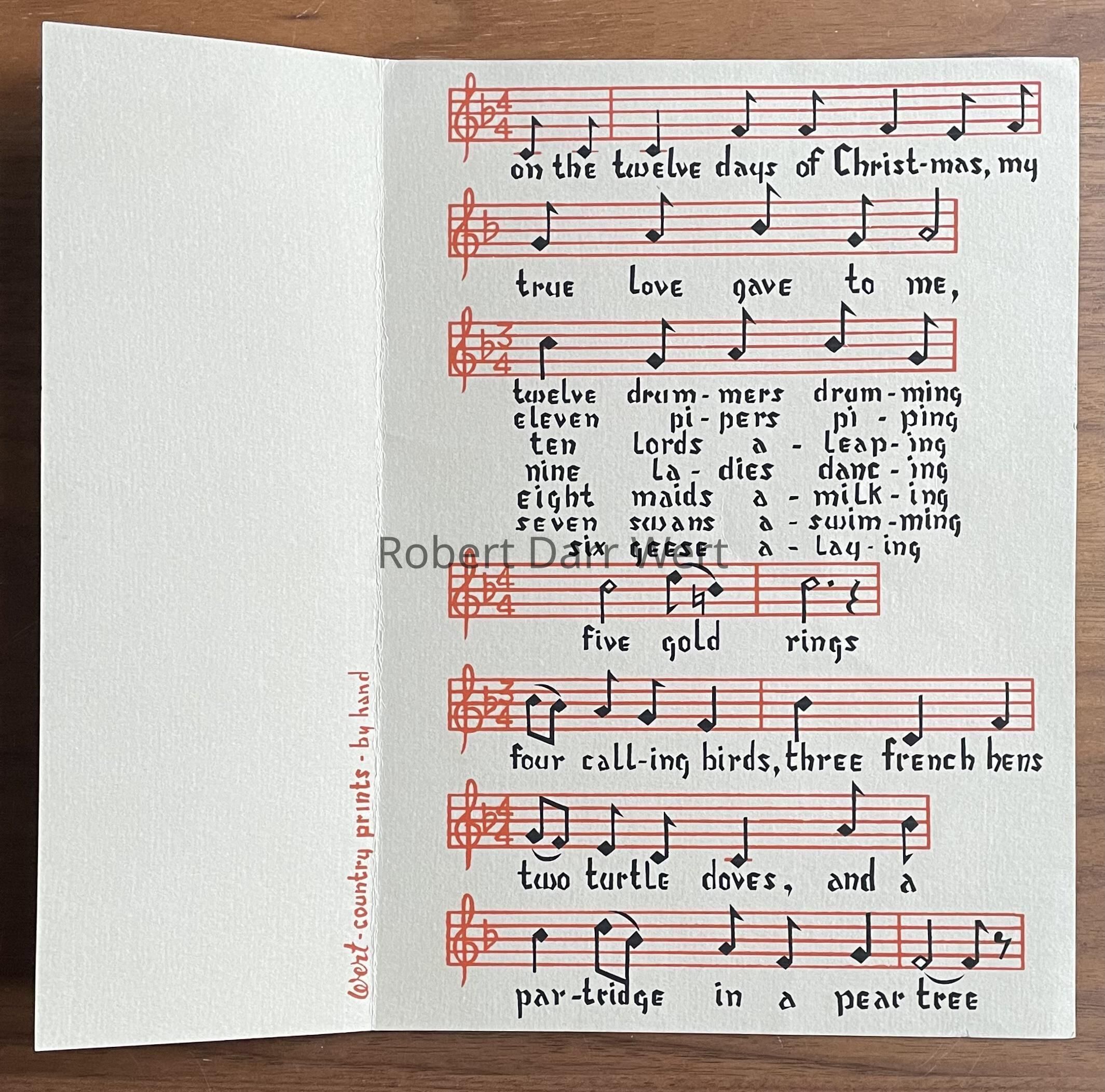 This is a Gift Greeting, Country Prints’ line of unmounted prints available in cardstock note folders with envelopes for mailing or gift giving. This example has the Twelve Days folio; see images.Made/Created