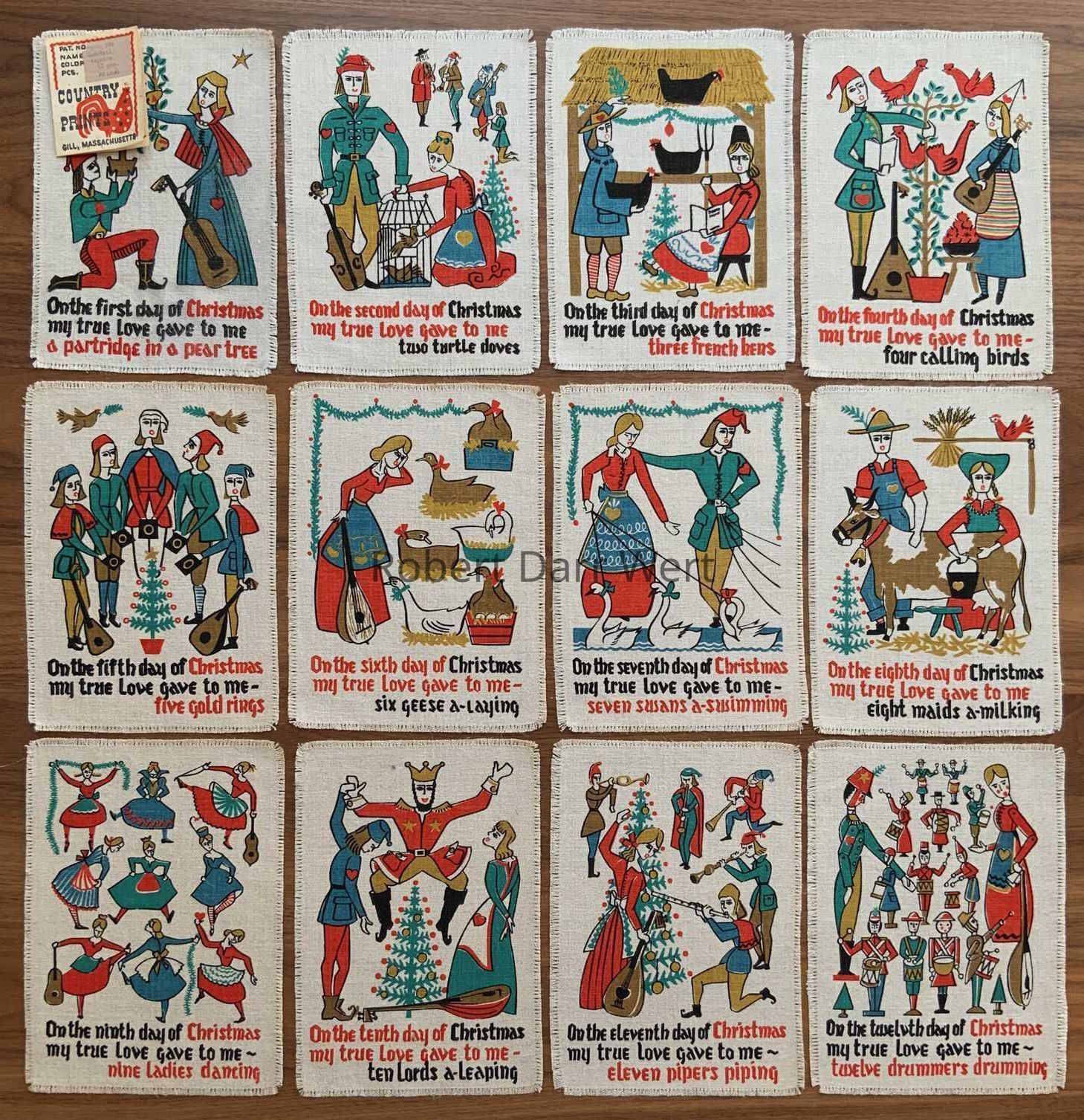 This design is one of a twelve print series of The “Twelve Days of Christmas” which was also available as cocktail napkins (see images), the prime difference being the edges of the cocktail napkins are stitched to keep the fringe from unraveling when laundered. The Gift Greeting Prints have unstitched fringed edges.