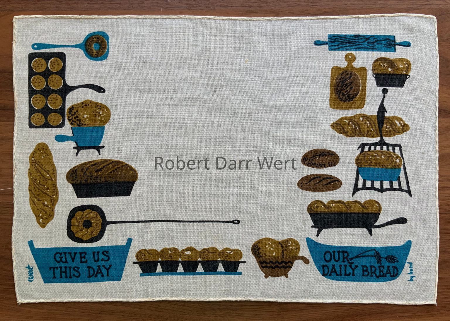 A five-color silkscreen print on off-white linen depicting over a dozen types of baked goods displayed on cutting boards and in cast iron cookware. A bunch of wheat stalks and a sickle hint at bread’s origins. A peel hangs to the right, an indispensable tool in the bread baking process. “OUR DAILY BREAD” is emblazoned on the side of a blue painted wood box.