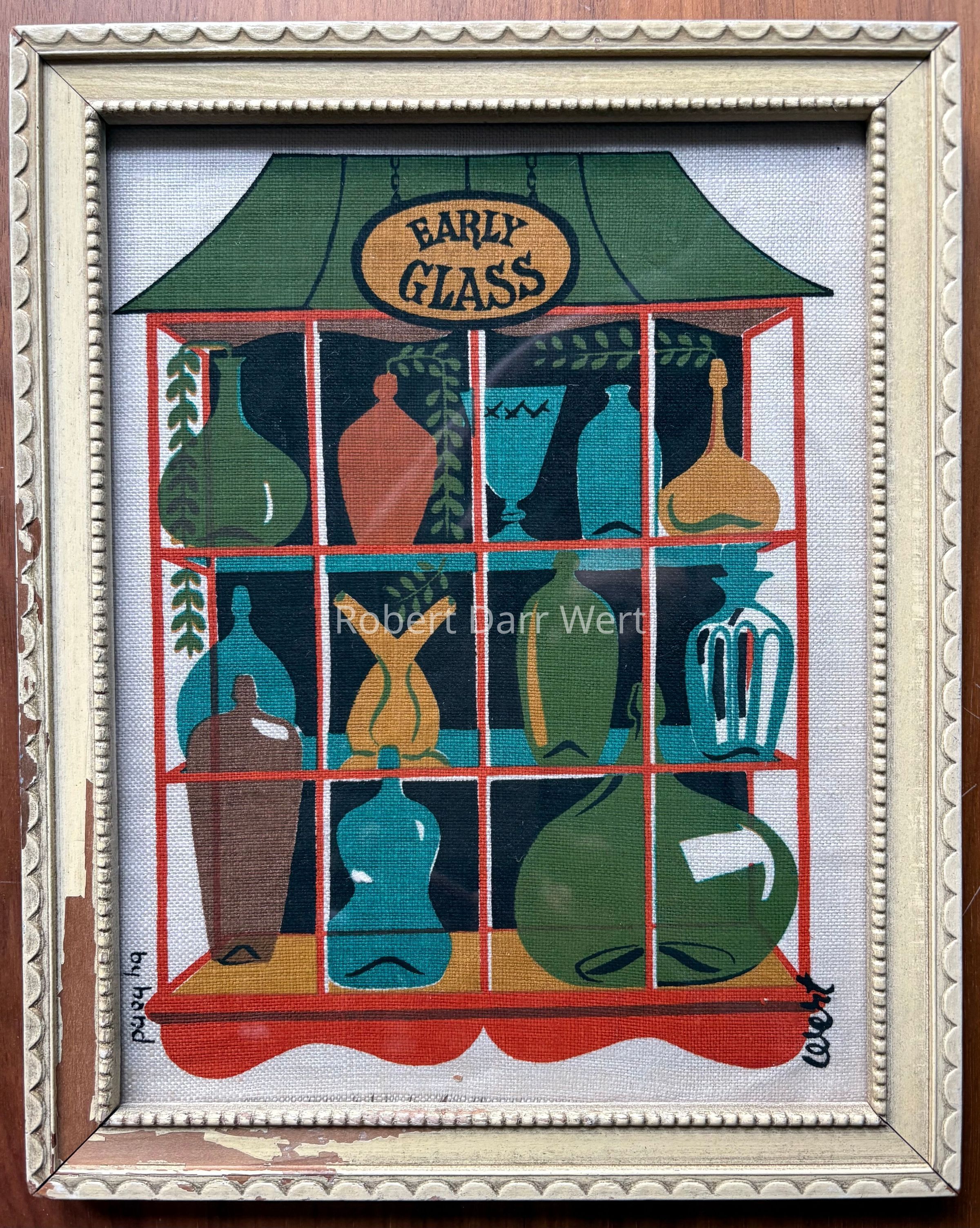A four-screen/five-color silkscreen print on off-white linen depicting twelve early glass vessels on three shelves in a box bay window. An oval sign labeled “EARLY GLASS” hangs from chains above. Trailing vines issue from three bottles, further animating the composition.