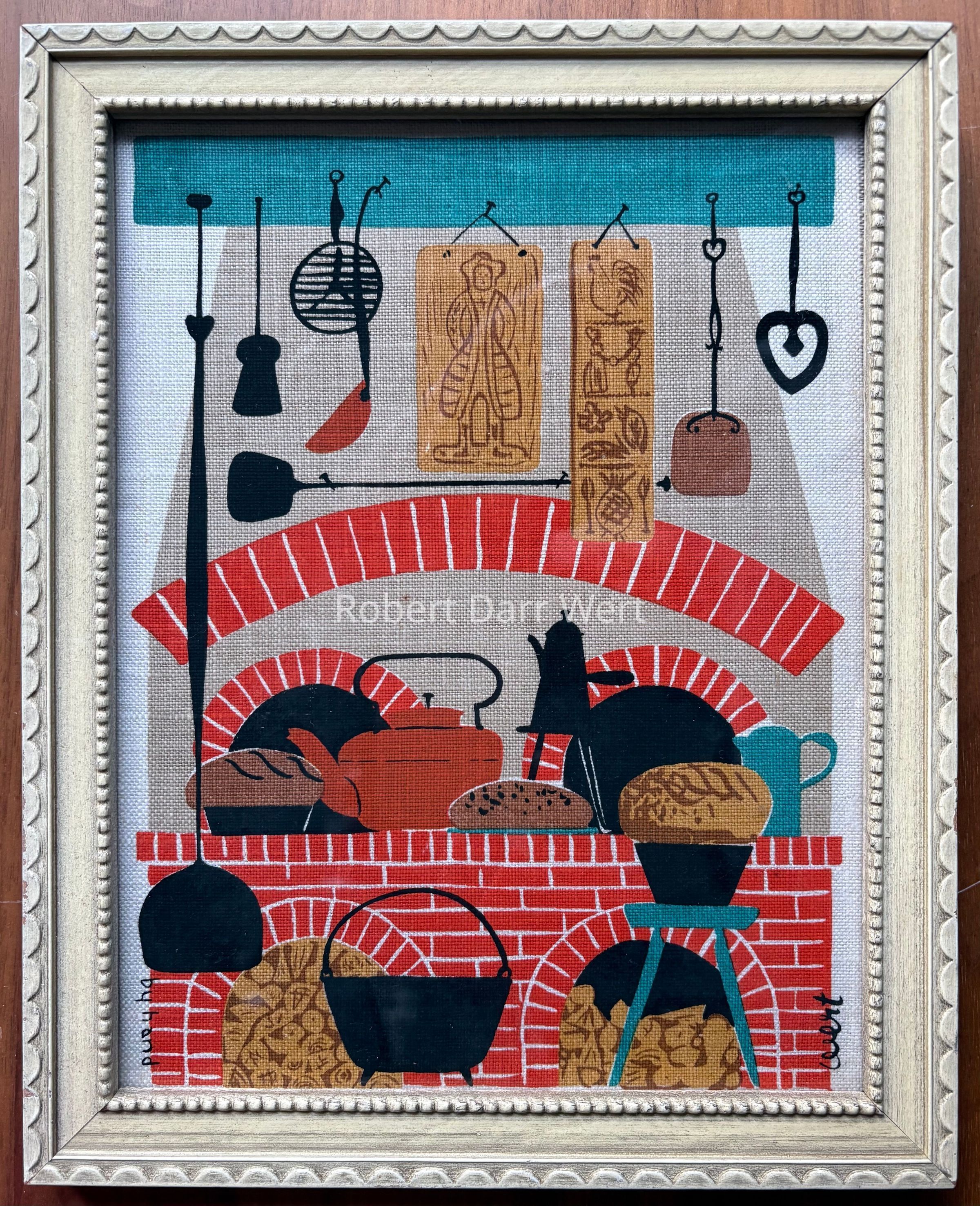 A six-color silkscreen print on off-white linen depicting wood-fired baking ovens, tools related to baking, and other kitchen tools, most hanging from a painted overhead beam. Tools are made of wrought iron, cast iron, and copper. The ovens are formed of red brick arches and the chimney mass is finished with a gray plaster or stucco. Carved wood springerle molds also hang from the overhead beam.
