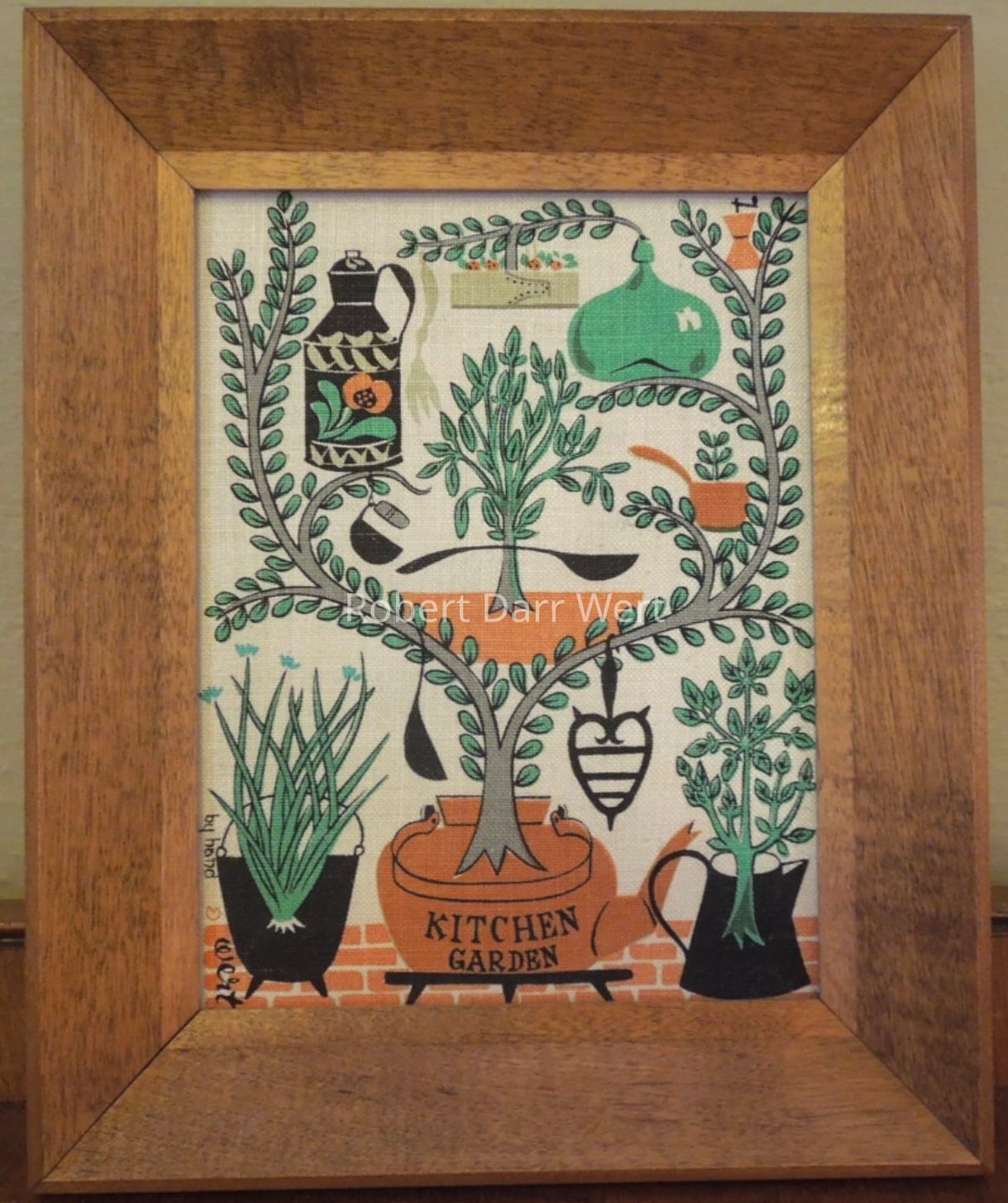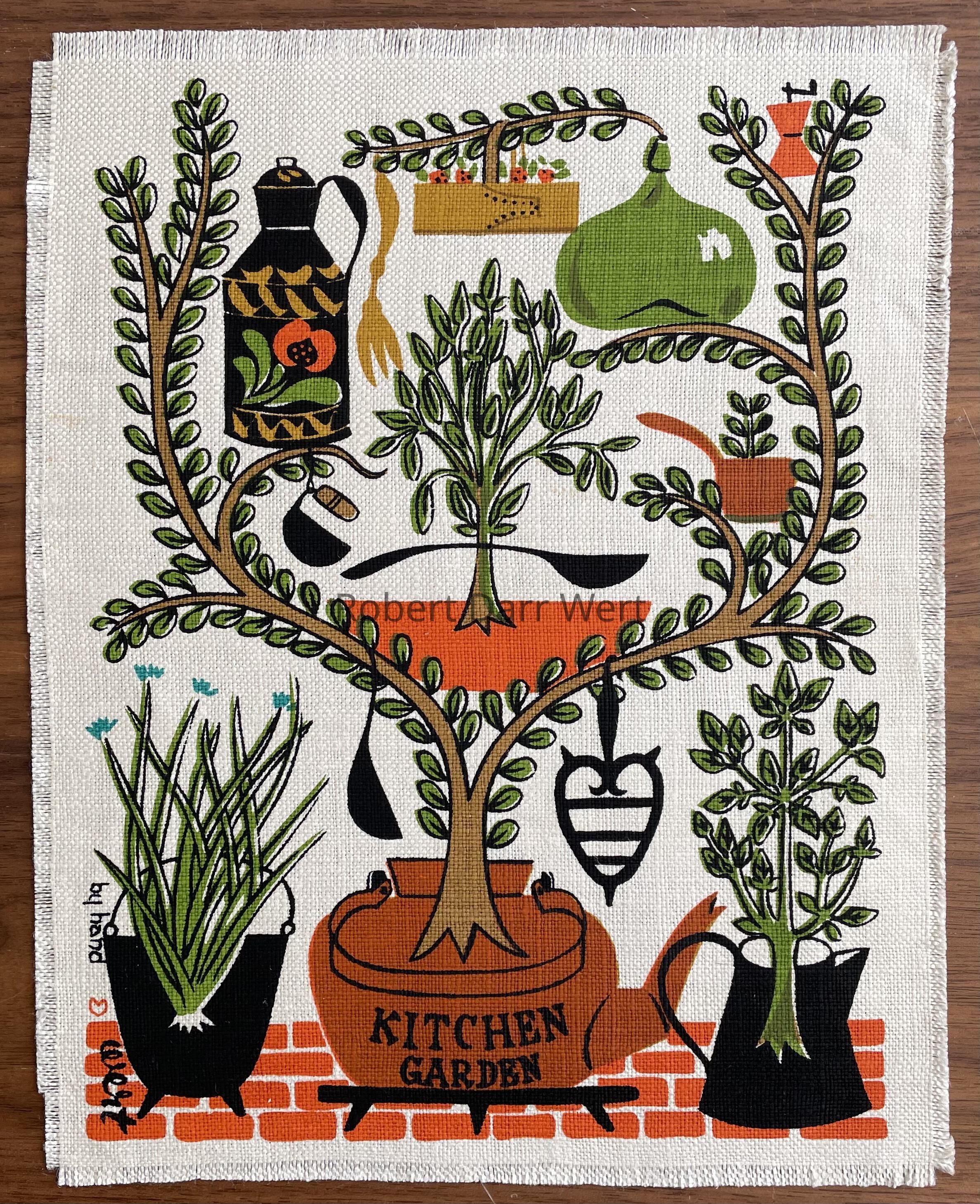 A five-color silkscreen print on off-white linen depicting plants and herbs related to a kitchen garden. Tools, vessels and implements of cast iron, wrought iron, copper, and wood populate the composition.