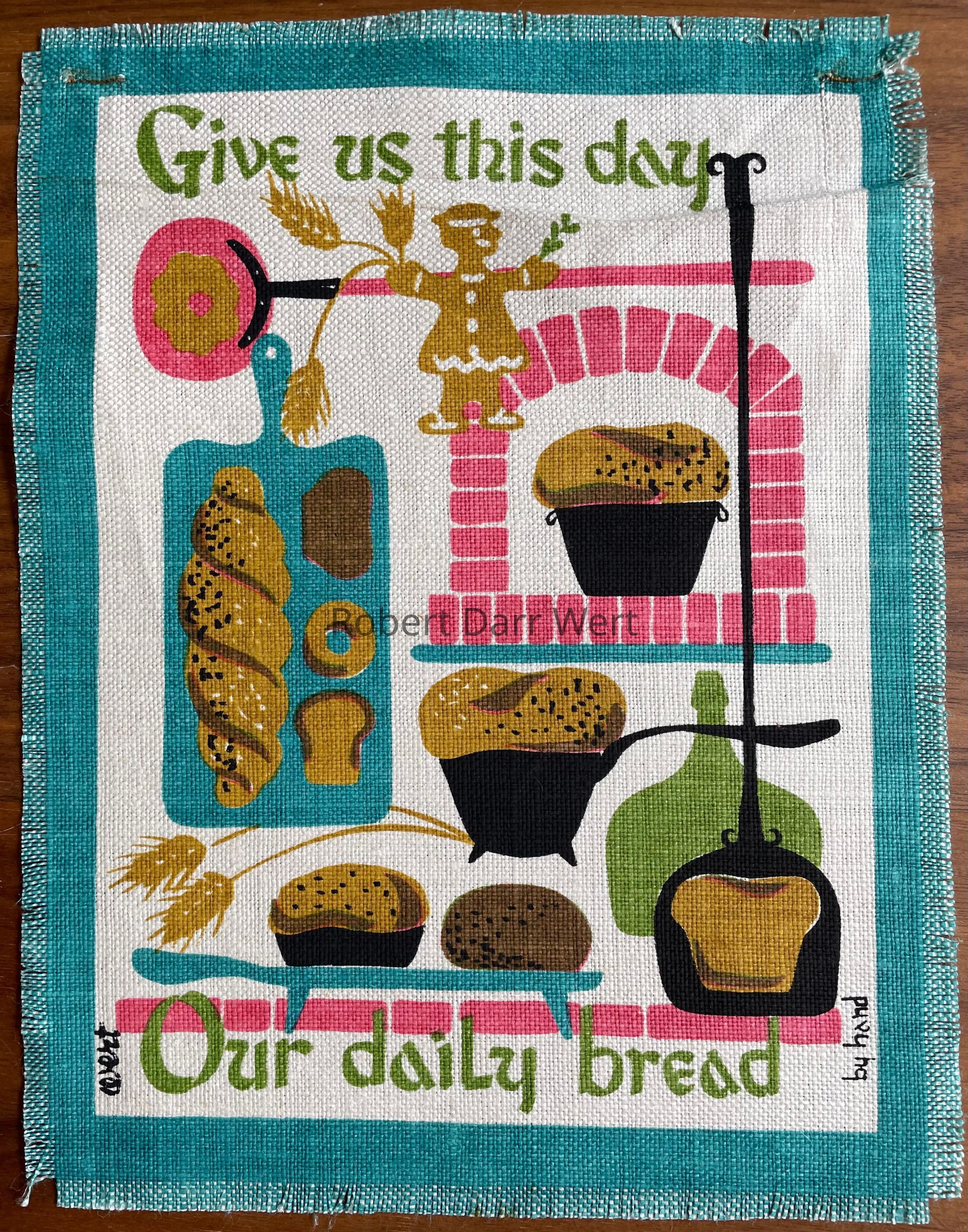 A five-screen/six-color silkscreen print on off-white linen depicting multiple forms of bread, a brick bread oven, a breadboard, and baking tools illustrated in support of the first line of the Lord’s Prayer, “Give us this day our daily bread.”